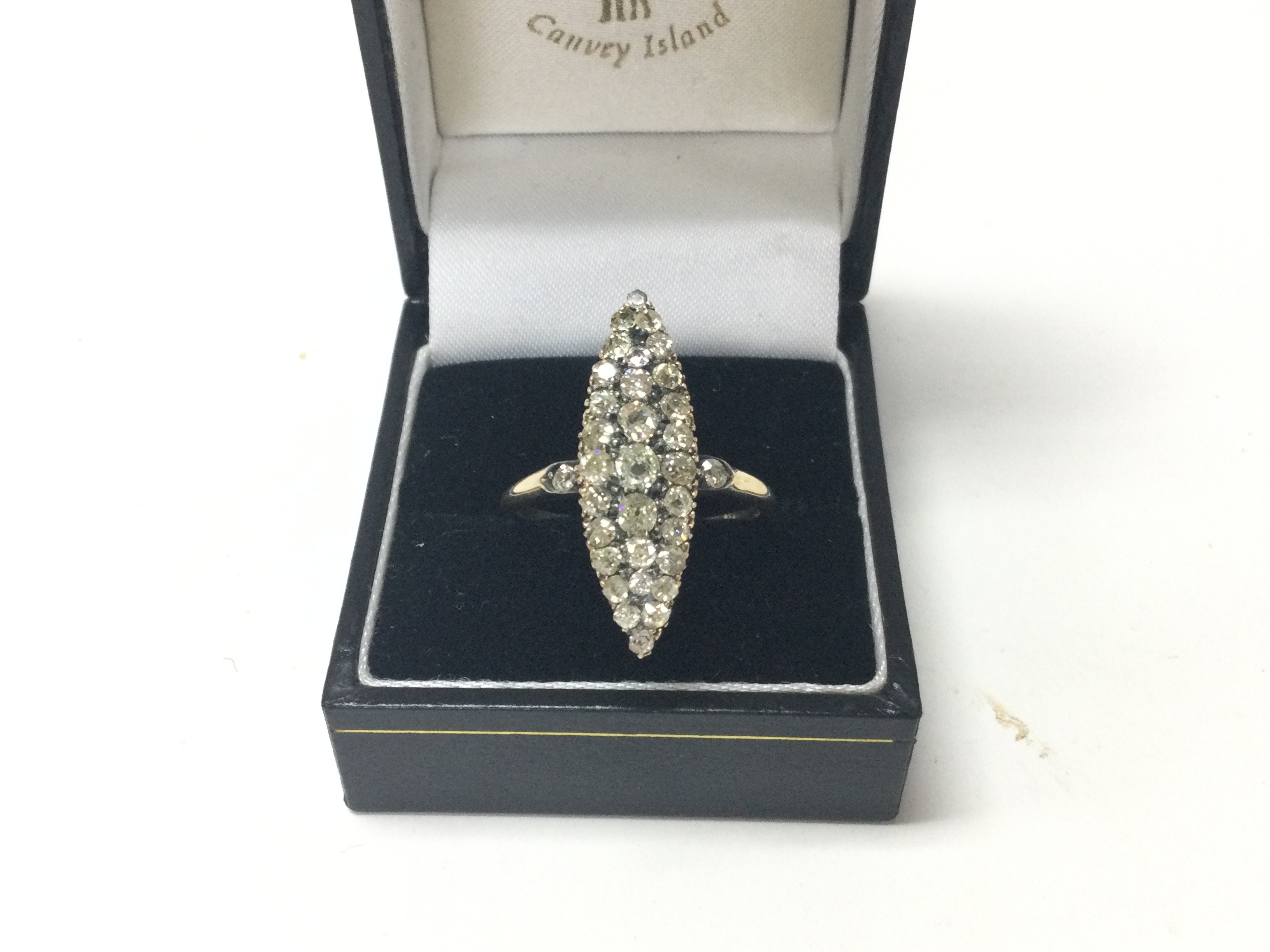 A 1920s marquise diamond cluster ring. Approx weight 4.36 grams, size V.