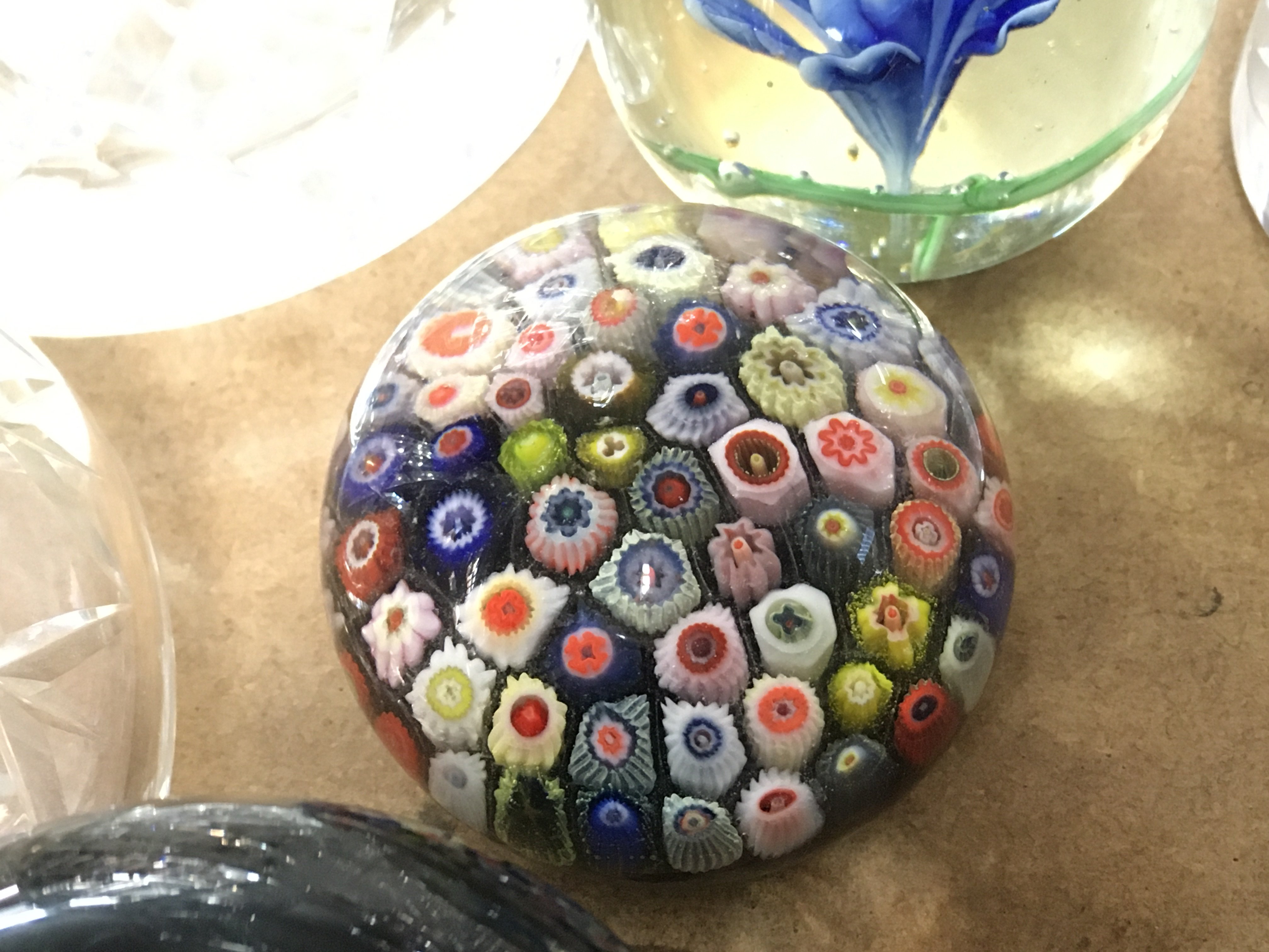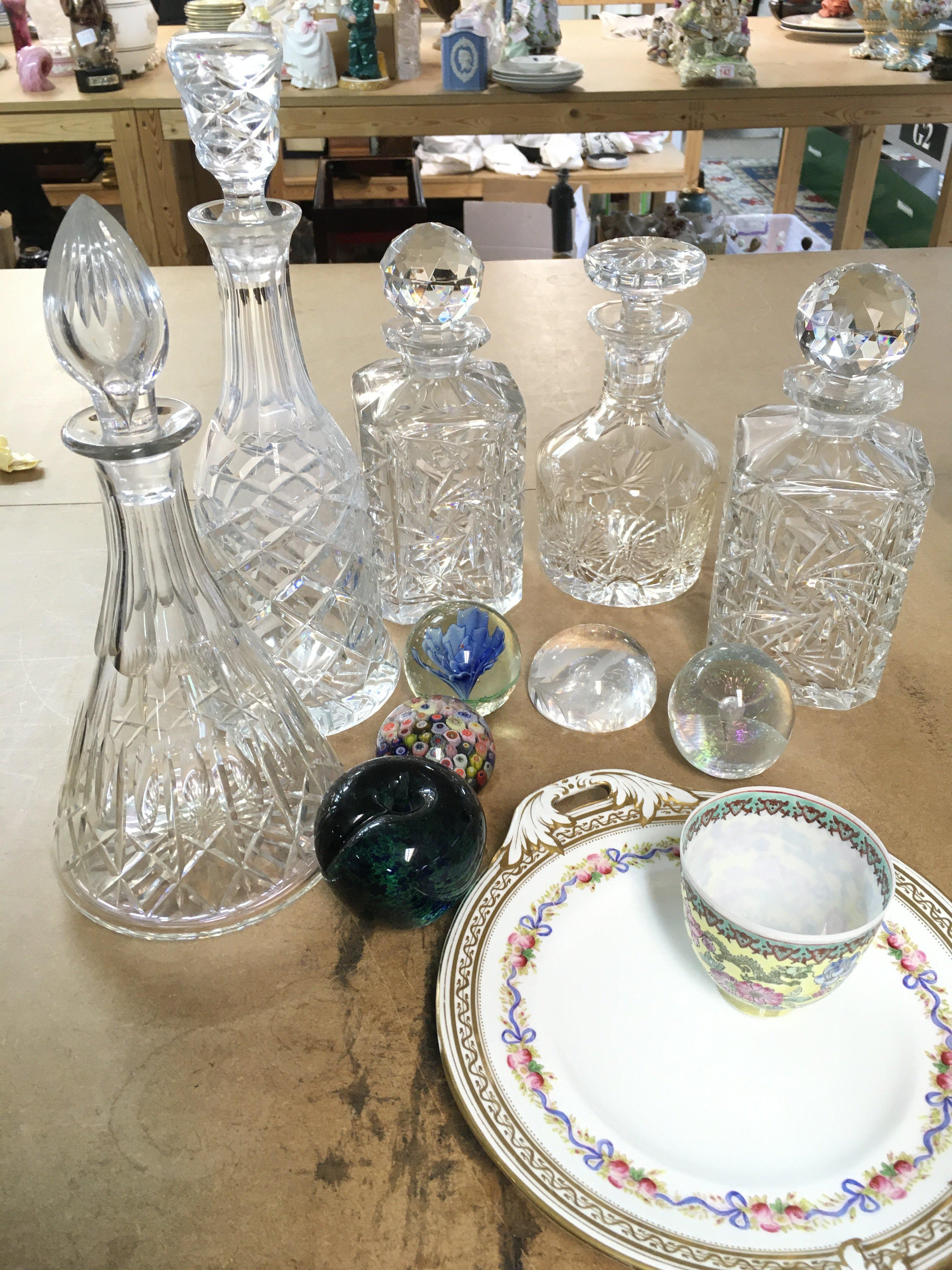 A collection of cut glass decanters, paperweights, a modern Chinese small vase and a ceramic dish. This lot cannot be posted