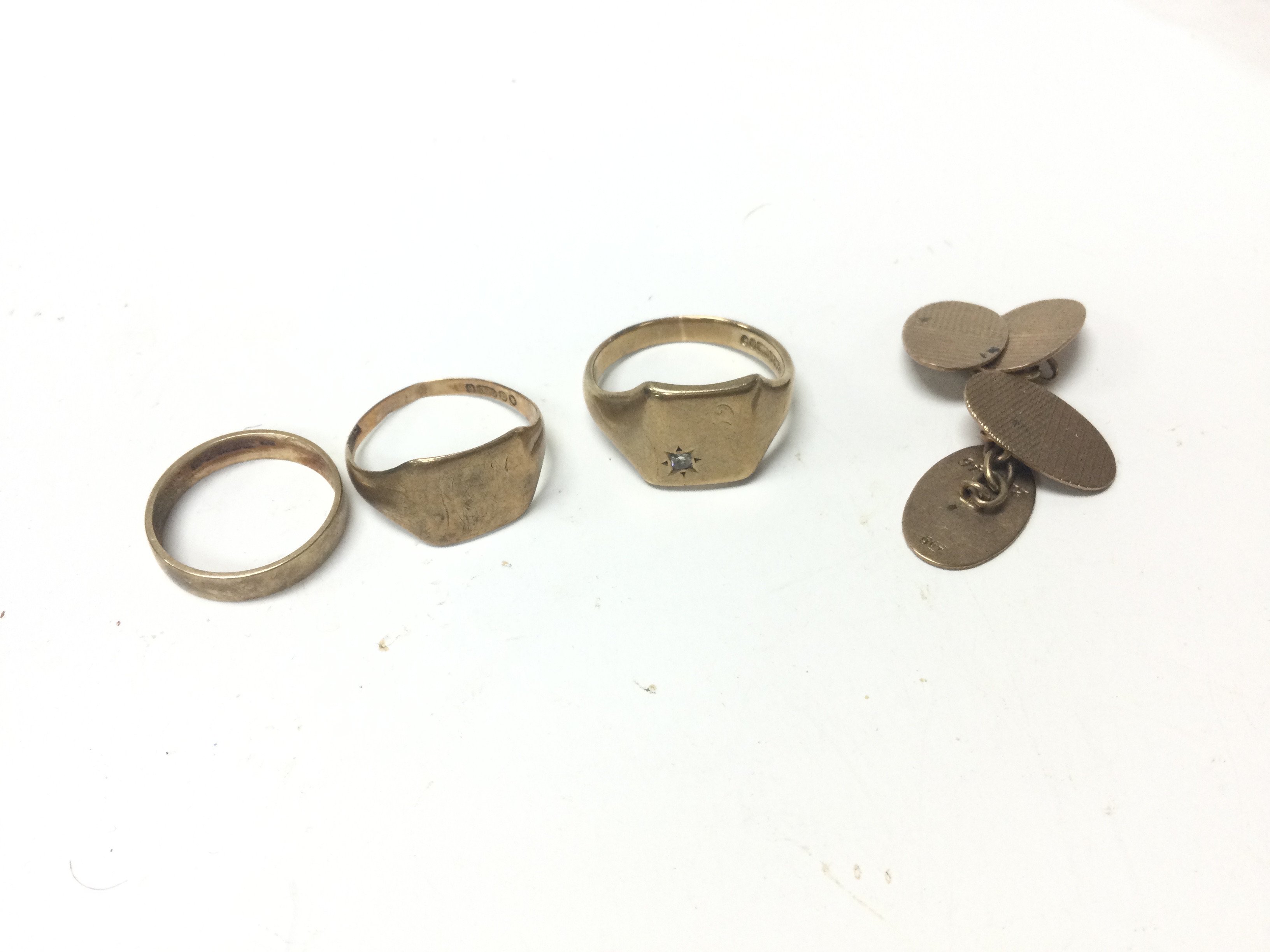 Three 9ct gold rings and a pair of 9ct gold cufflinks. Approx weight 13.96grams.