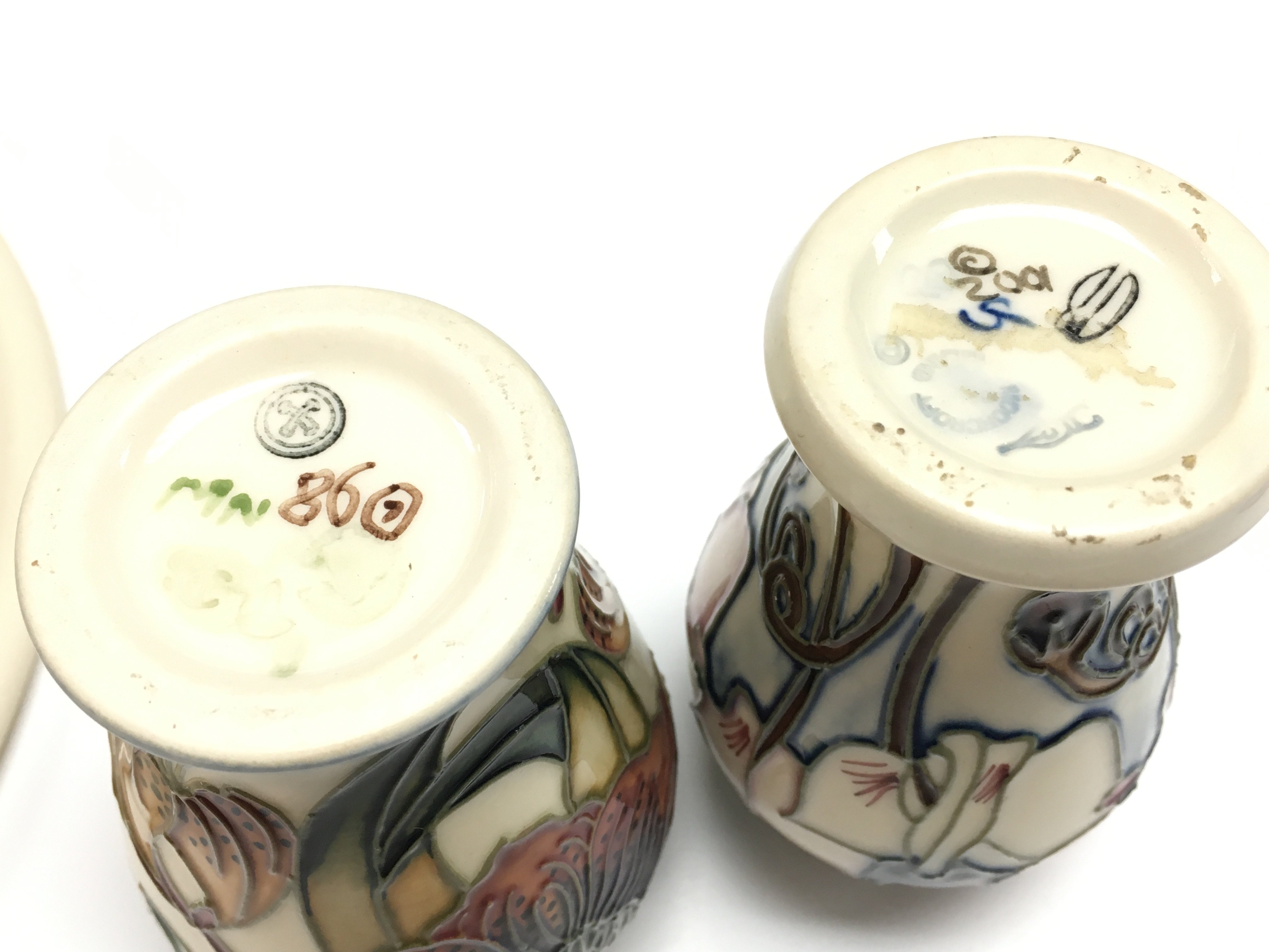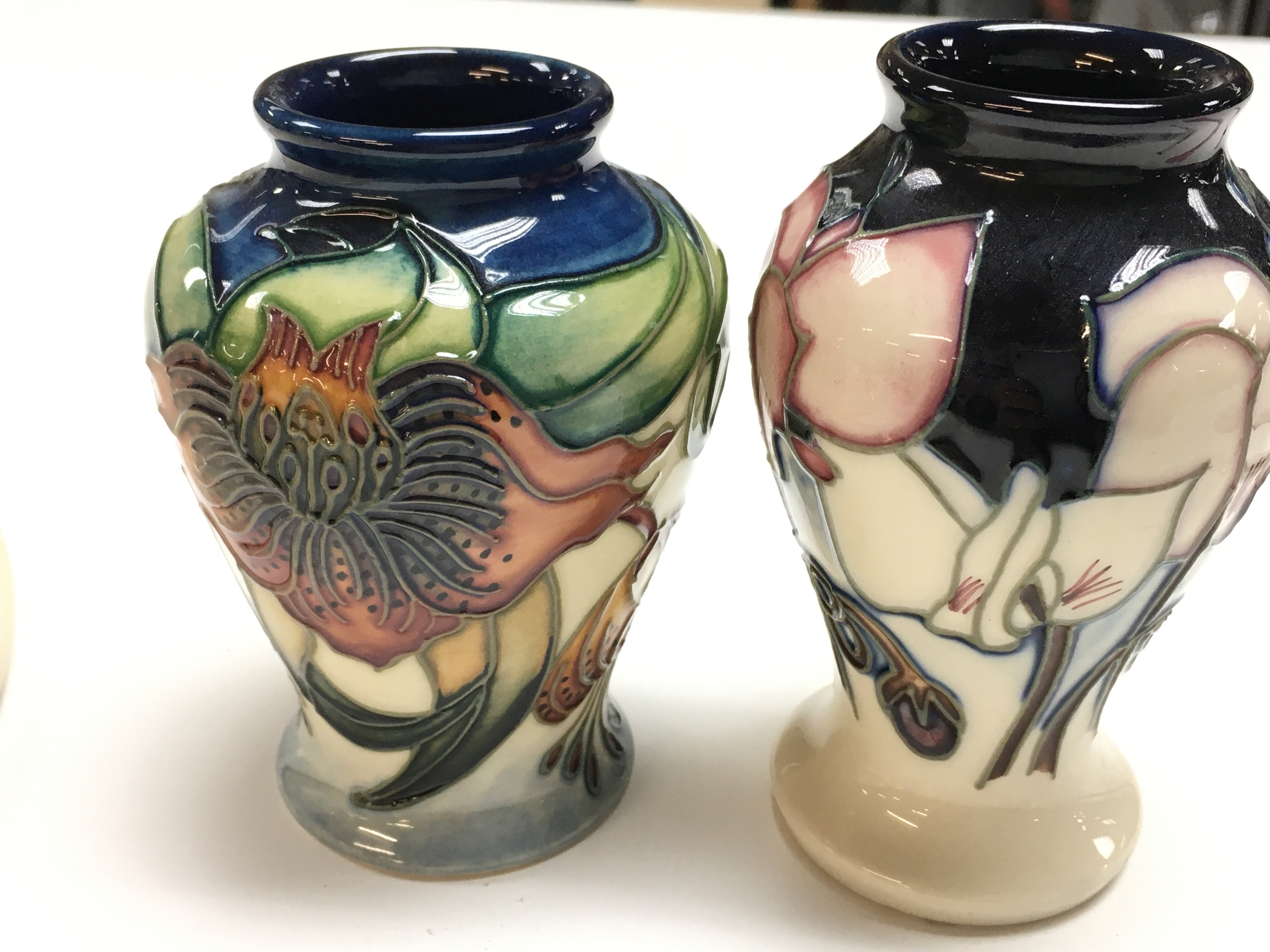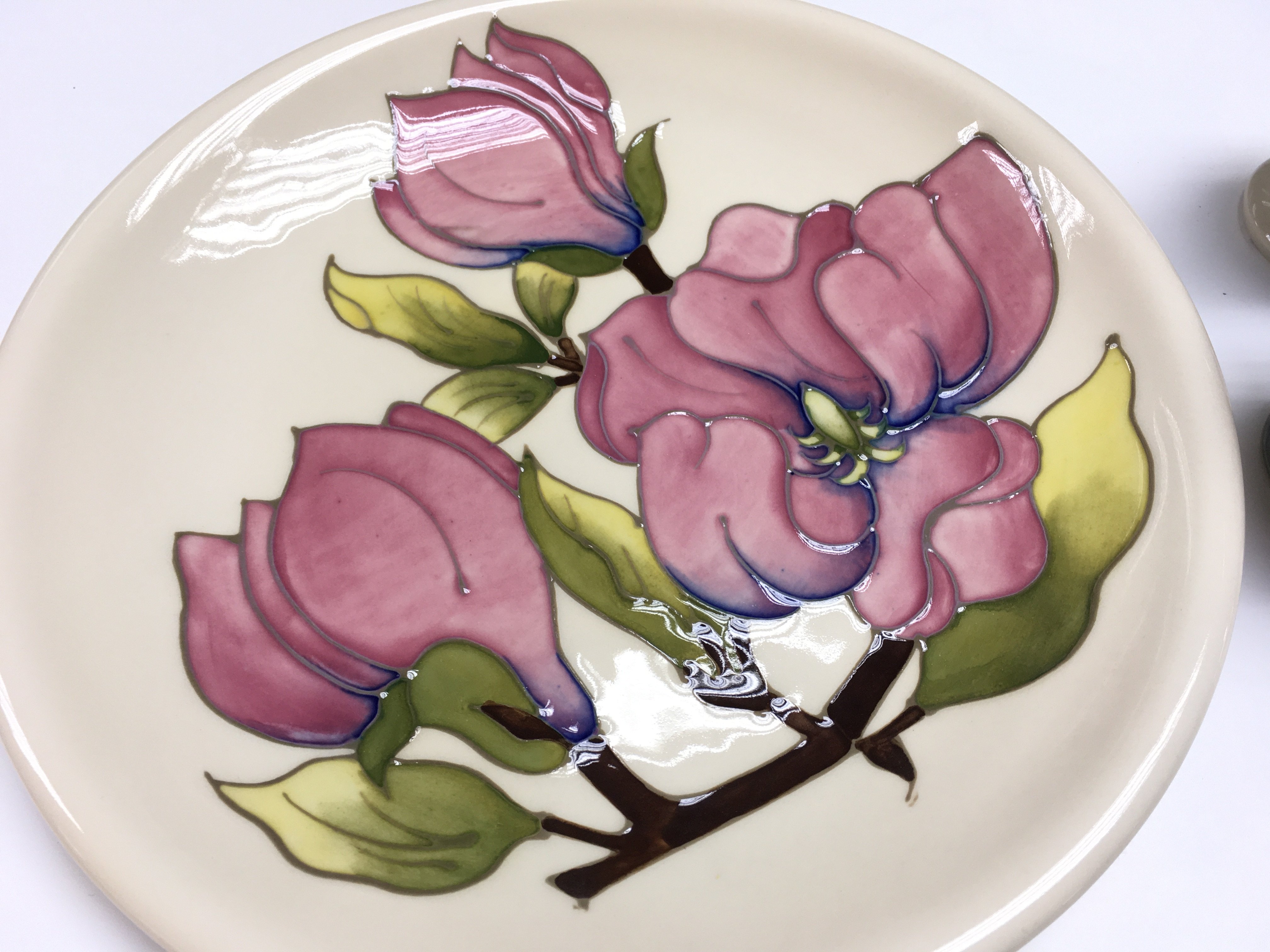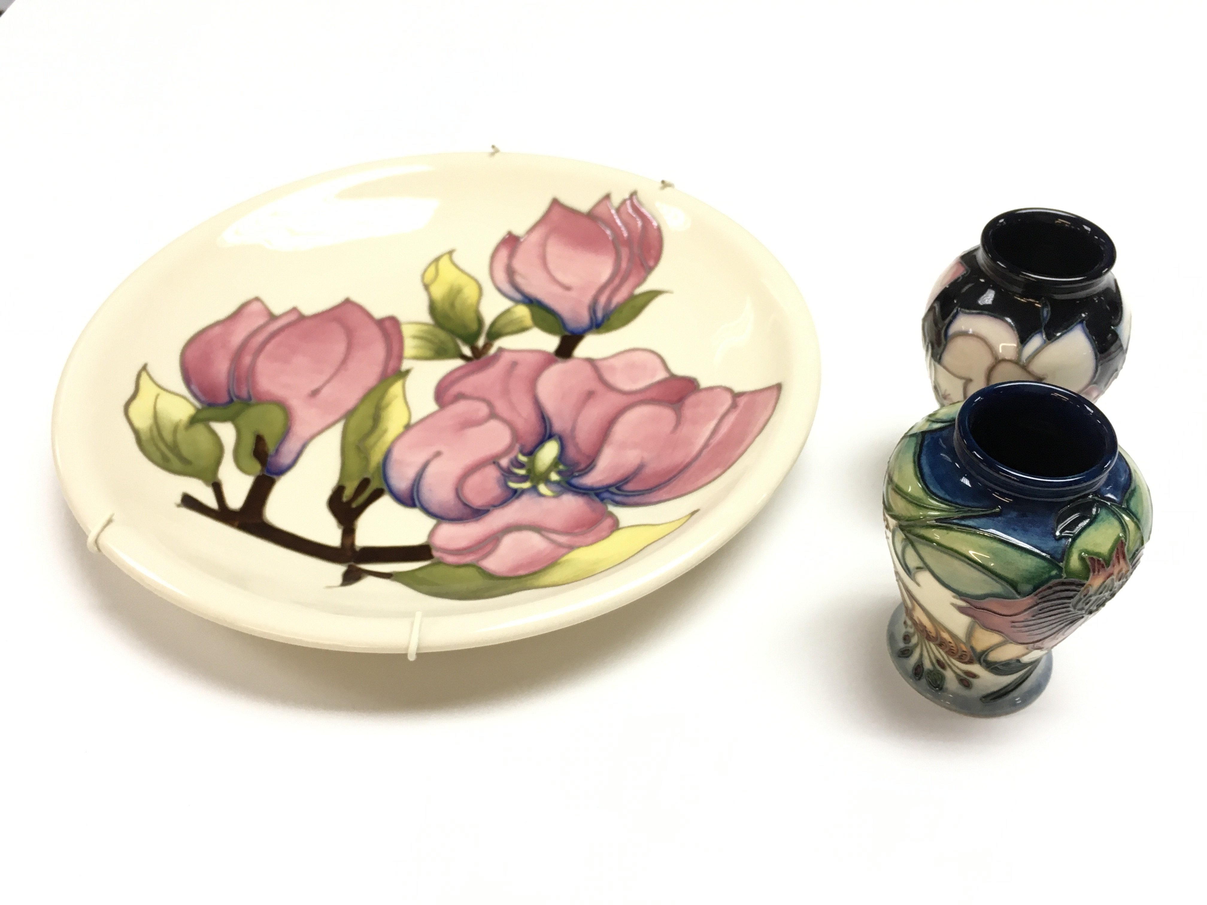 A Moorcroft Magnolia plate and two small vases. This lot cannot be posted.