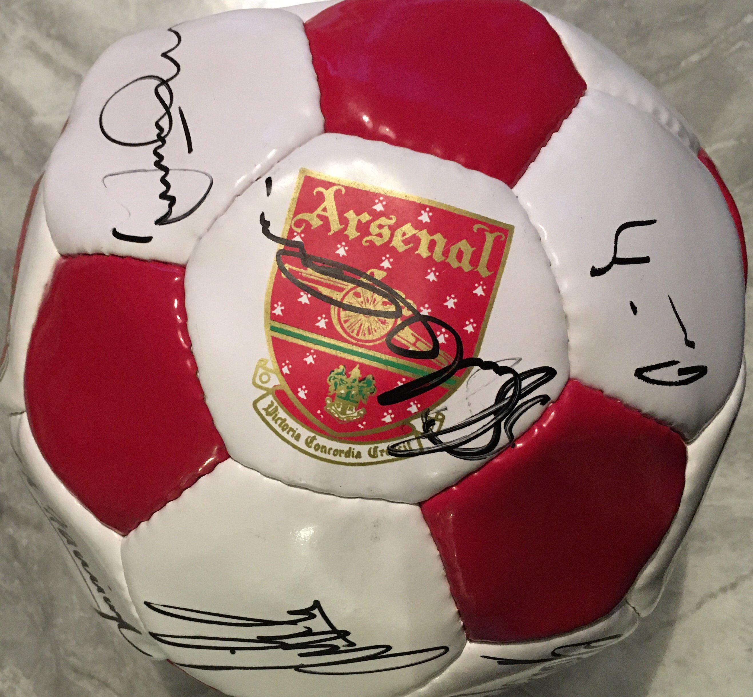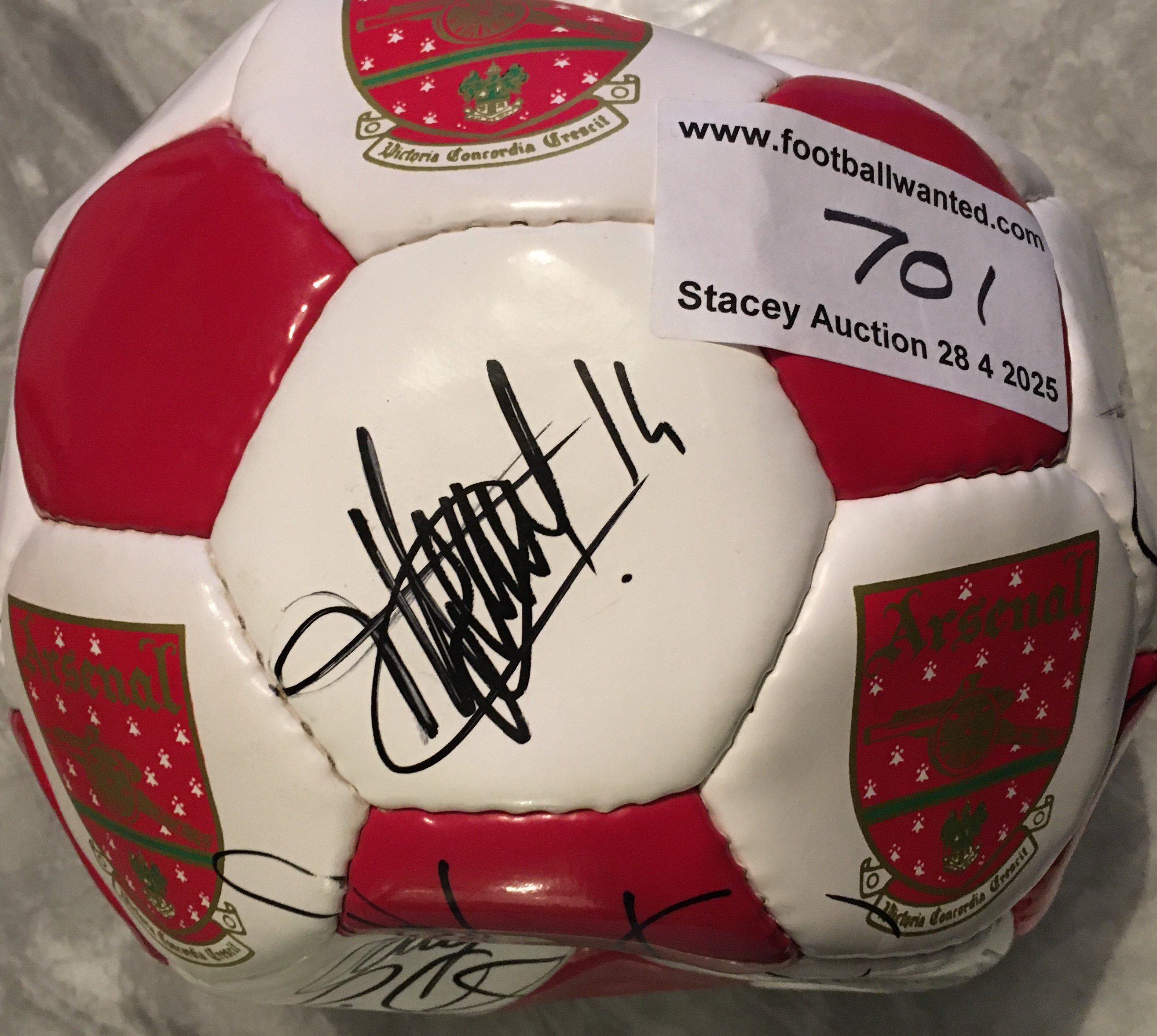 Arsenal Signed Football. Official red and white panelled ball fully signed by squad from around 2001 and includes autographs of Dixon and Henry. Estimate 17 autographs.