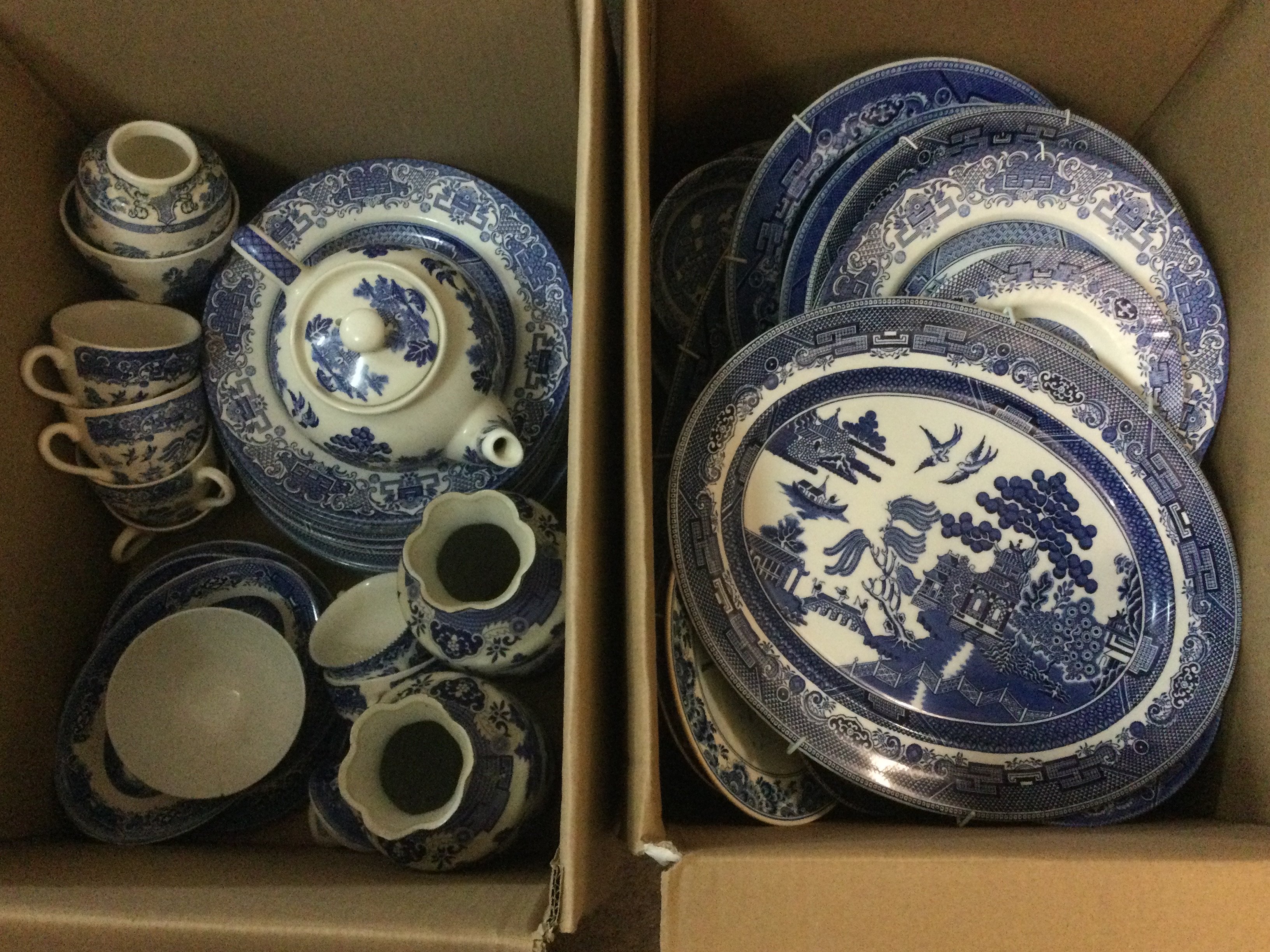 Two boxes of blue and white ceramics in Old Willow pattern. Shipping category D.
