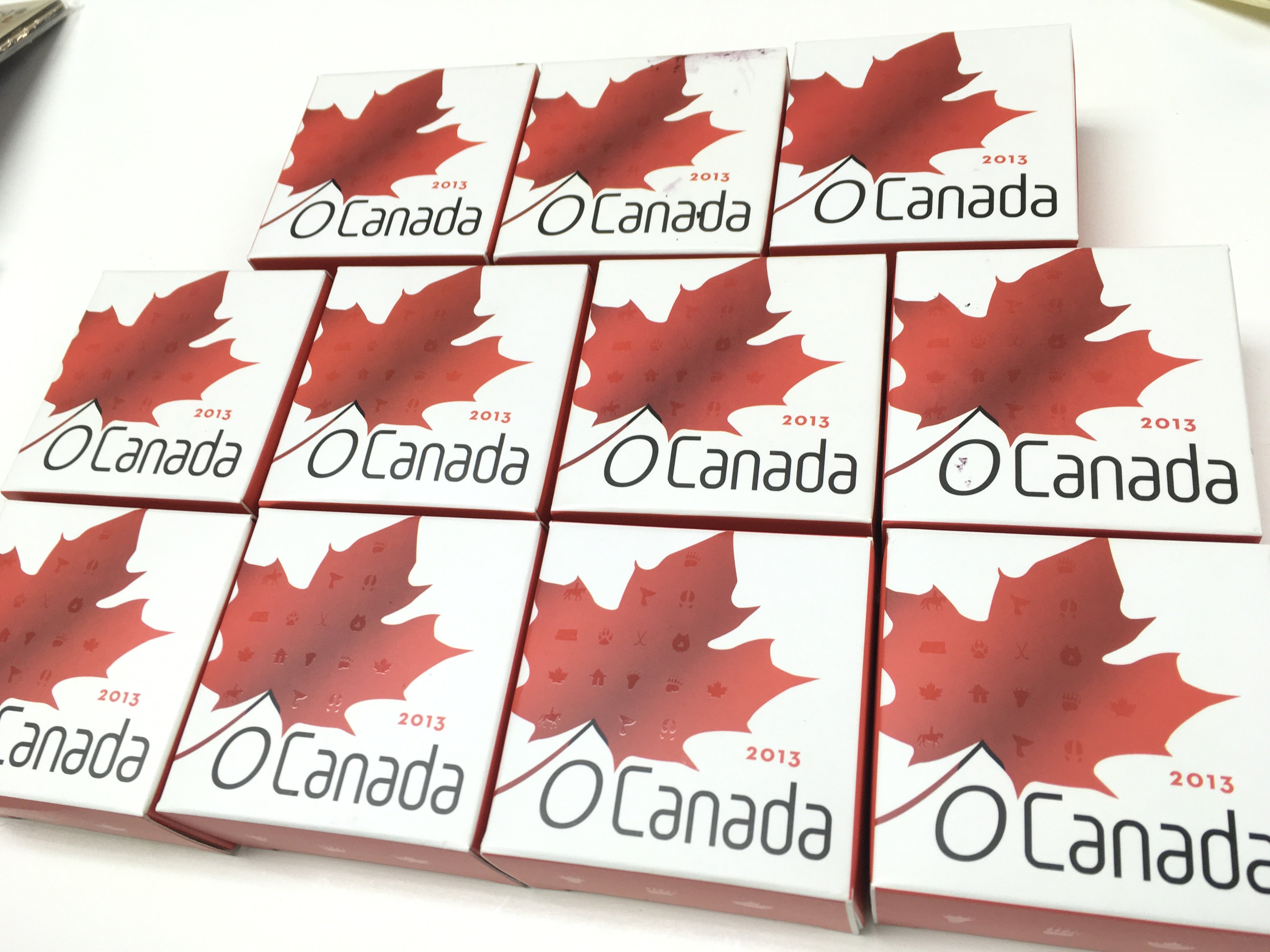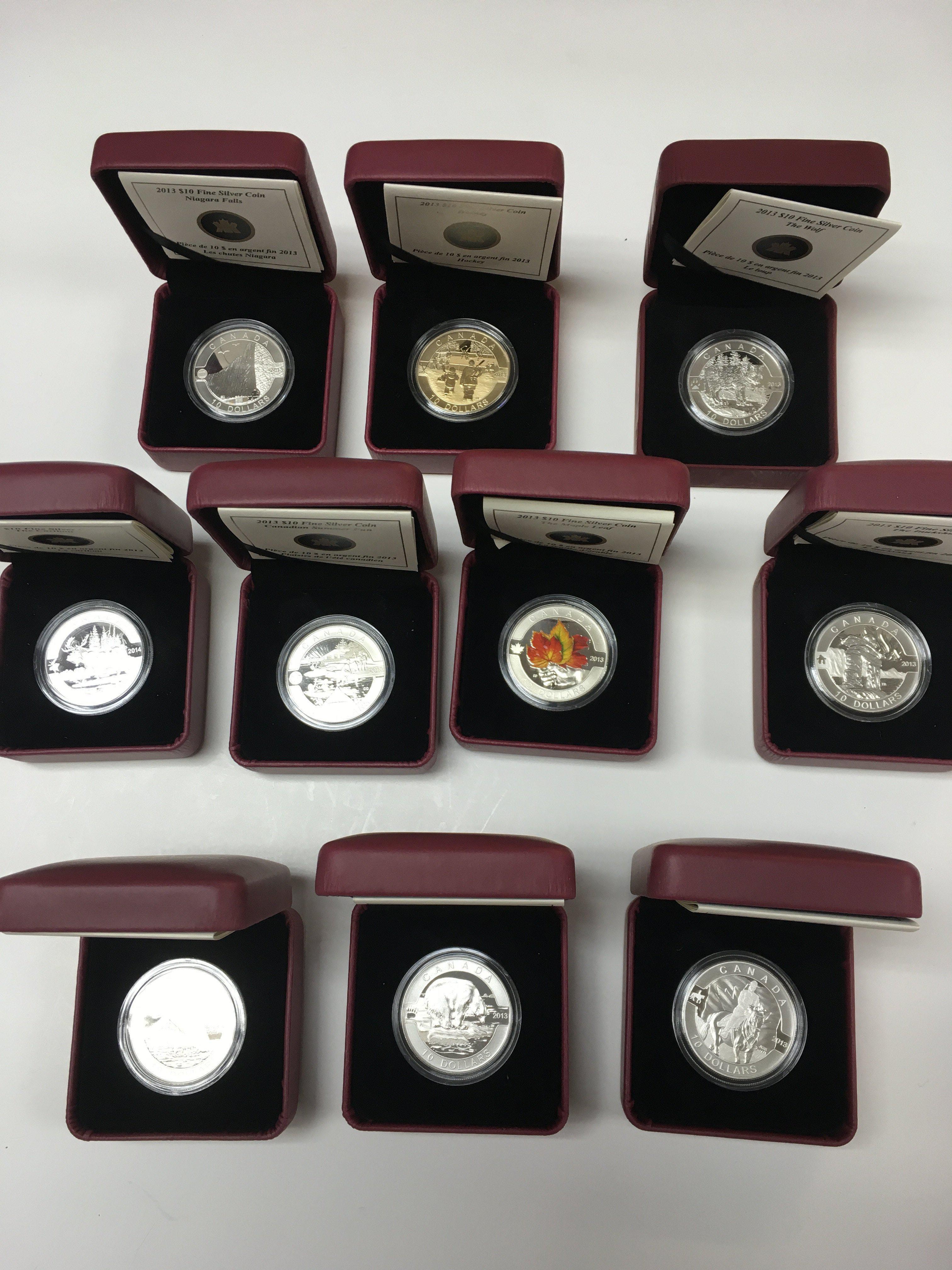 A collection of boxed silver 2013 10 dollar Canadian dollars. Postage category B