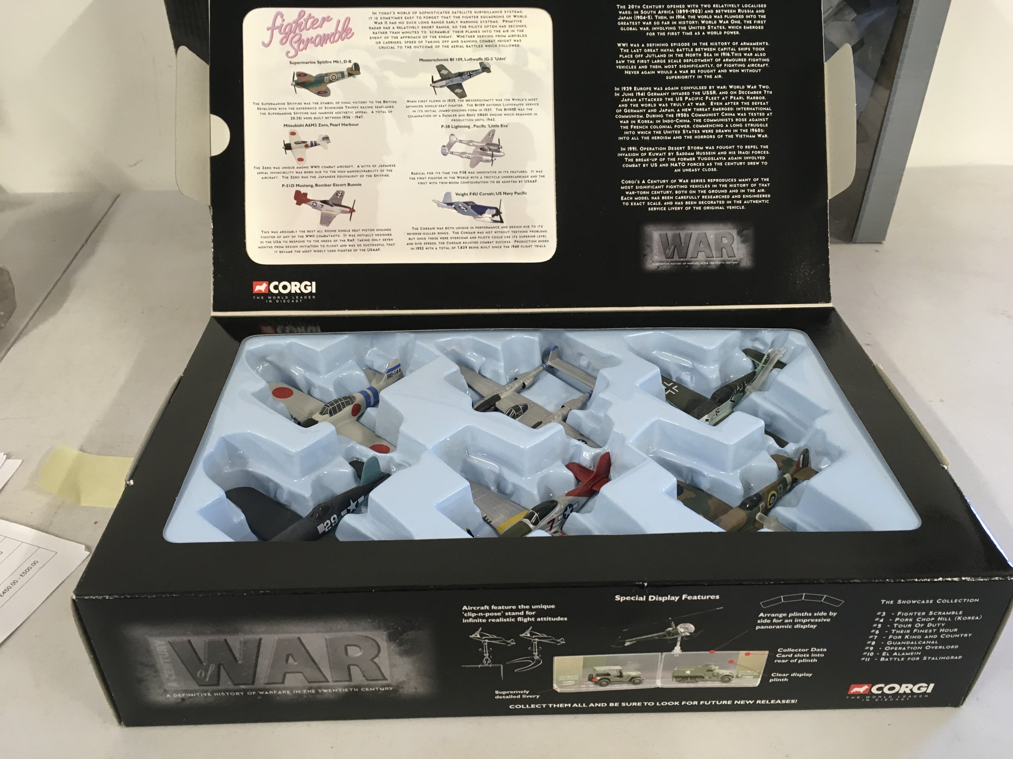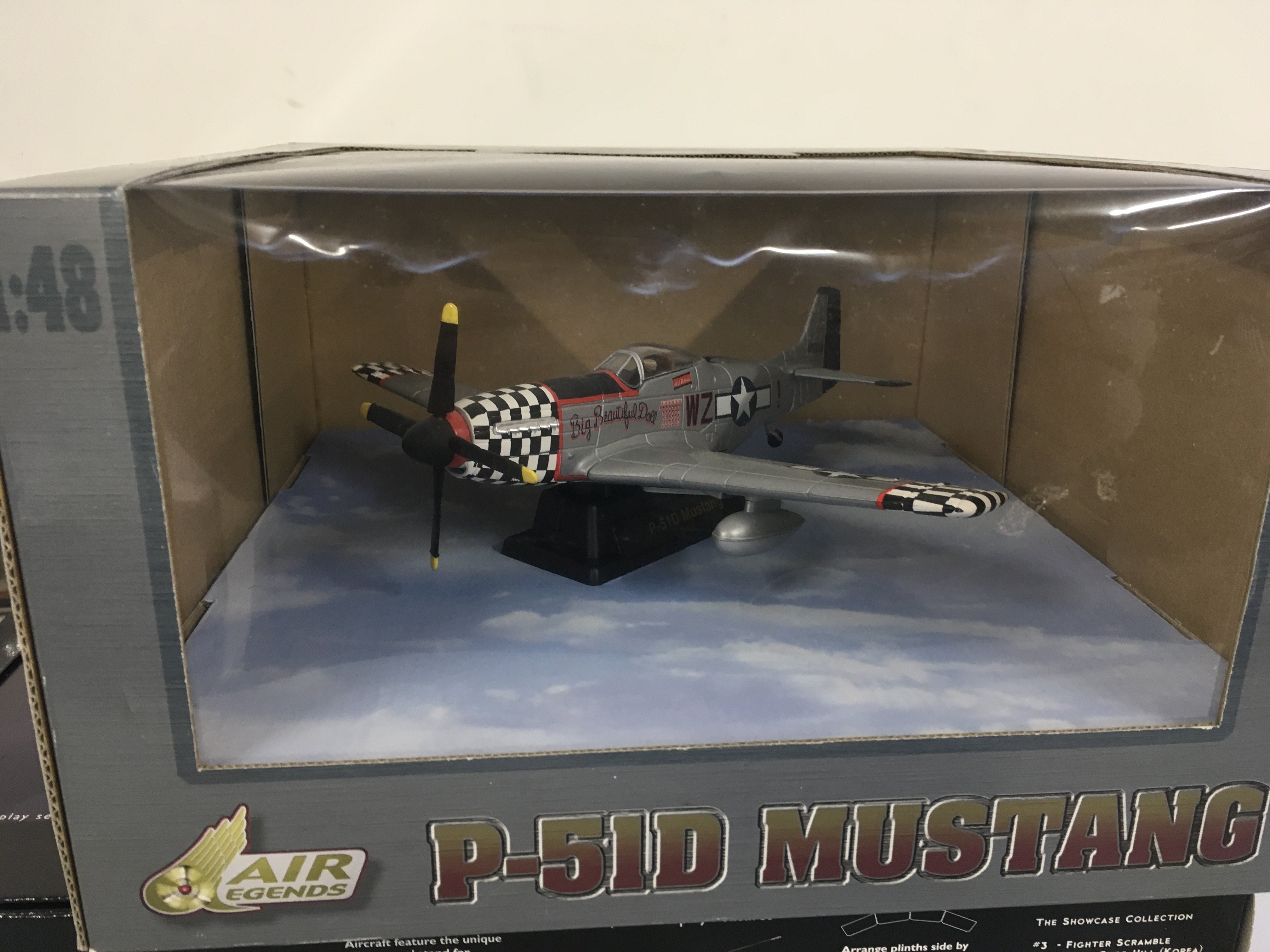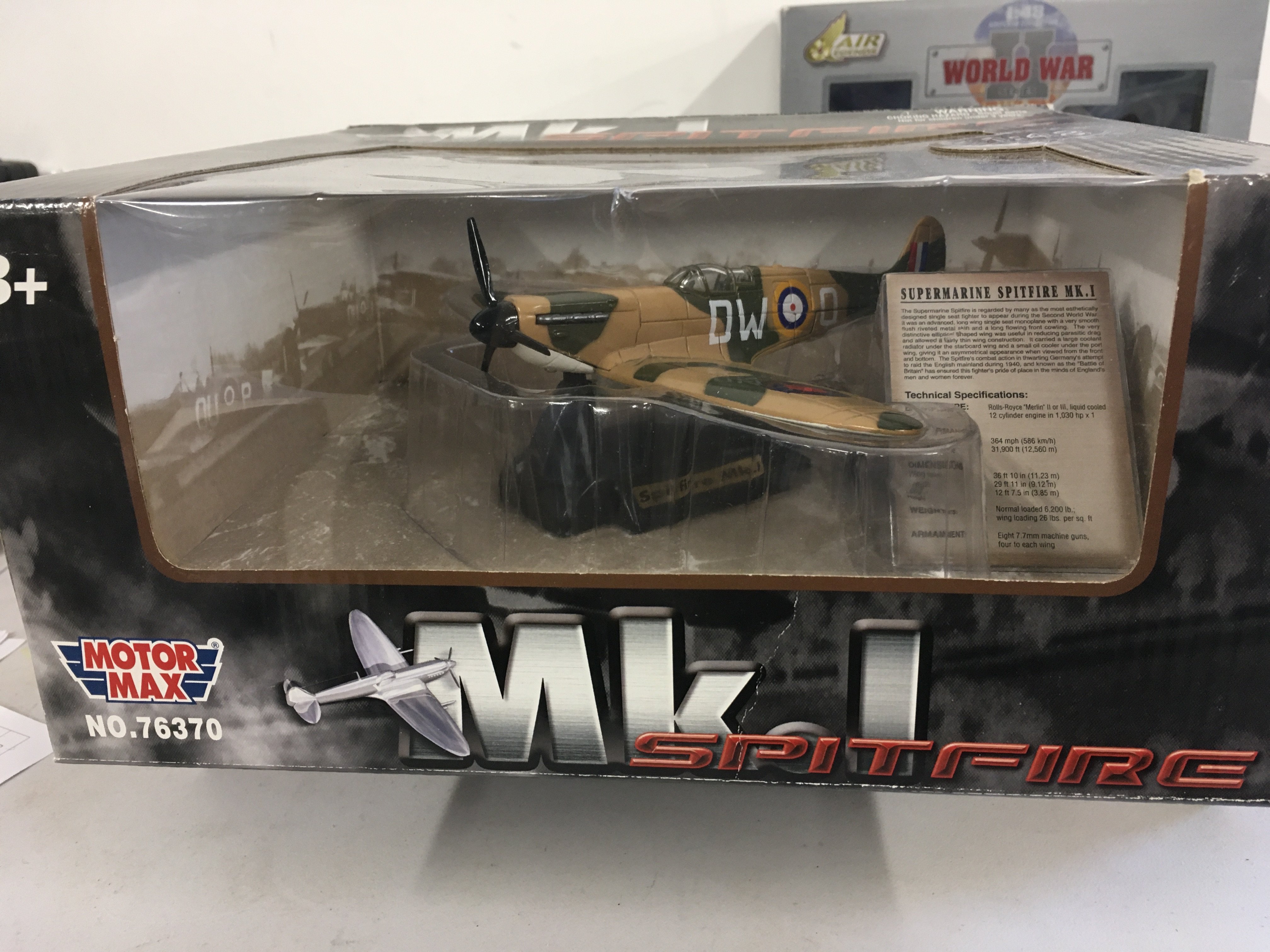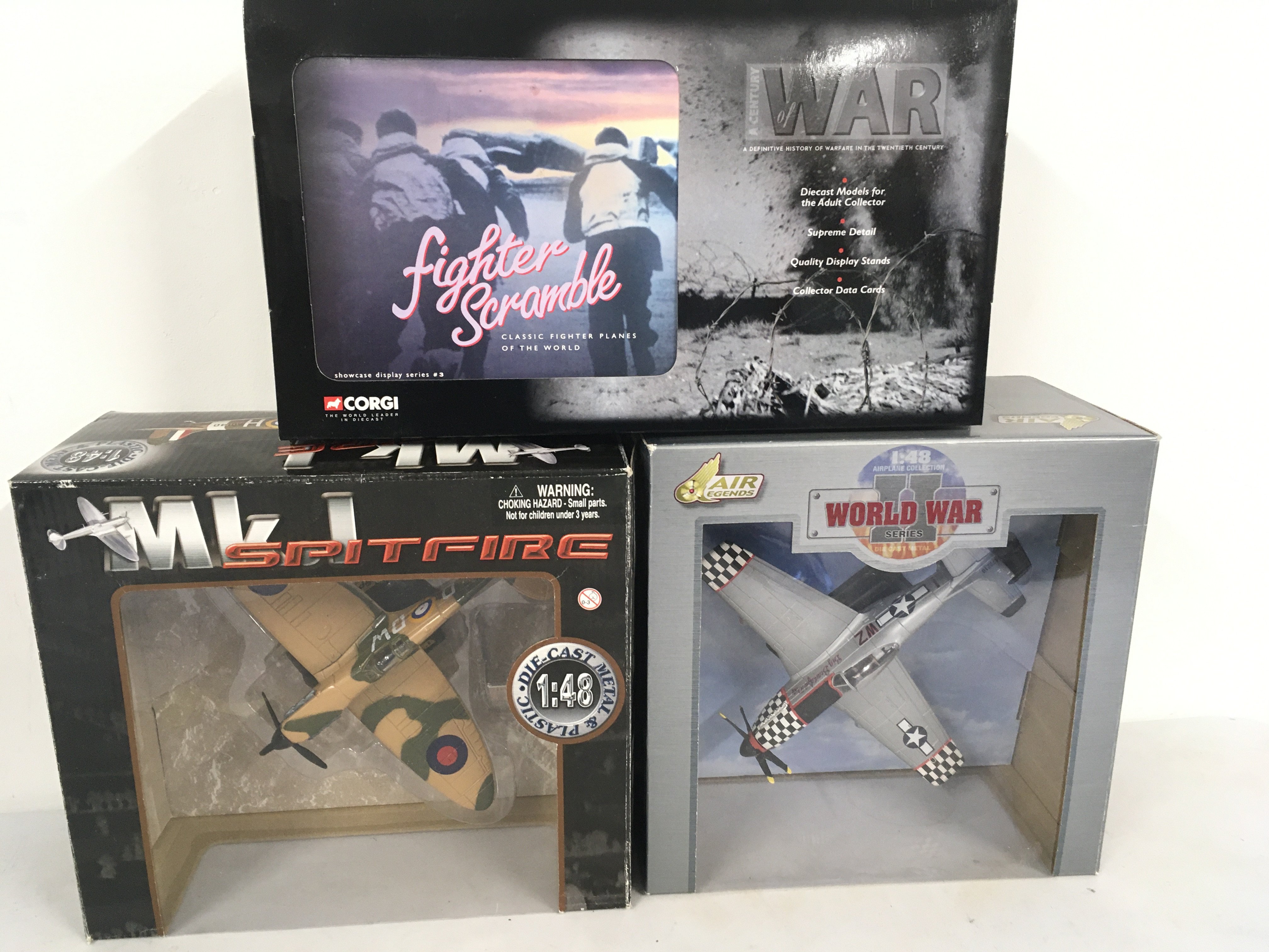 3 boxed model aircraft by Air Legends..Motor Max and Corgi. Includes fighter Scramble. P51D Mustang..Mk1 Spitfire. (3)