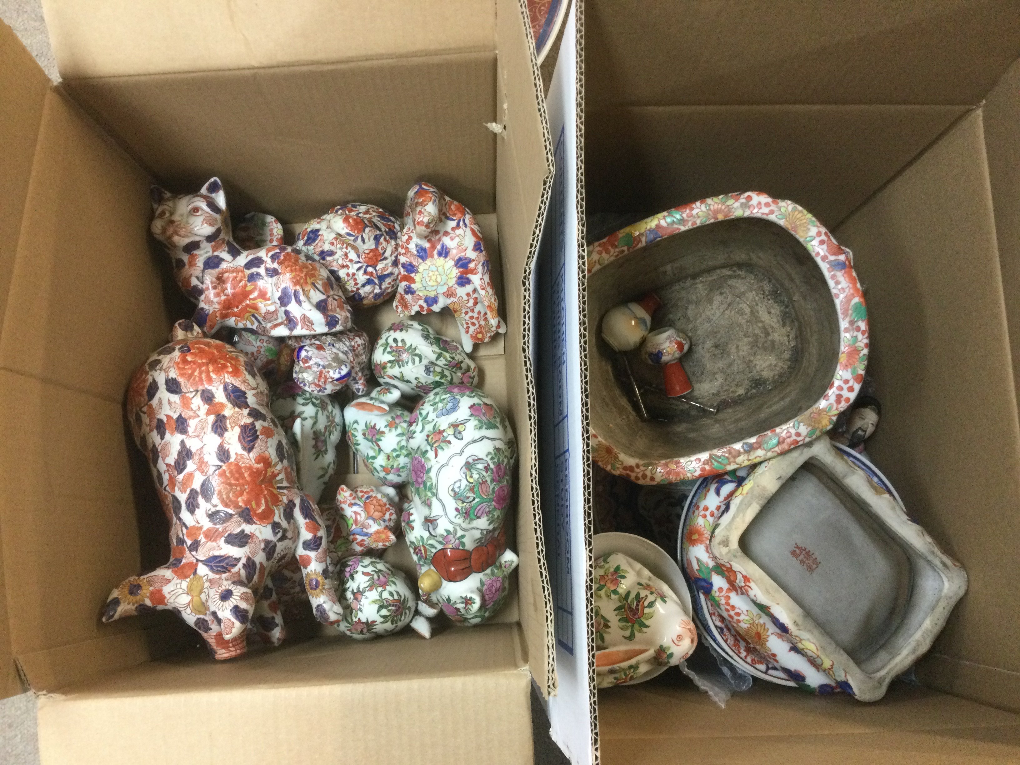 Two boxes of Oriental ceramics comprising mainly moden imari animals and plates. Shipping category D.