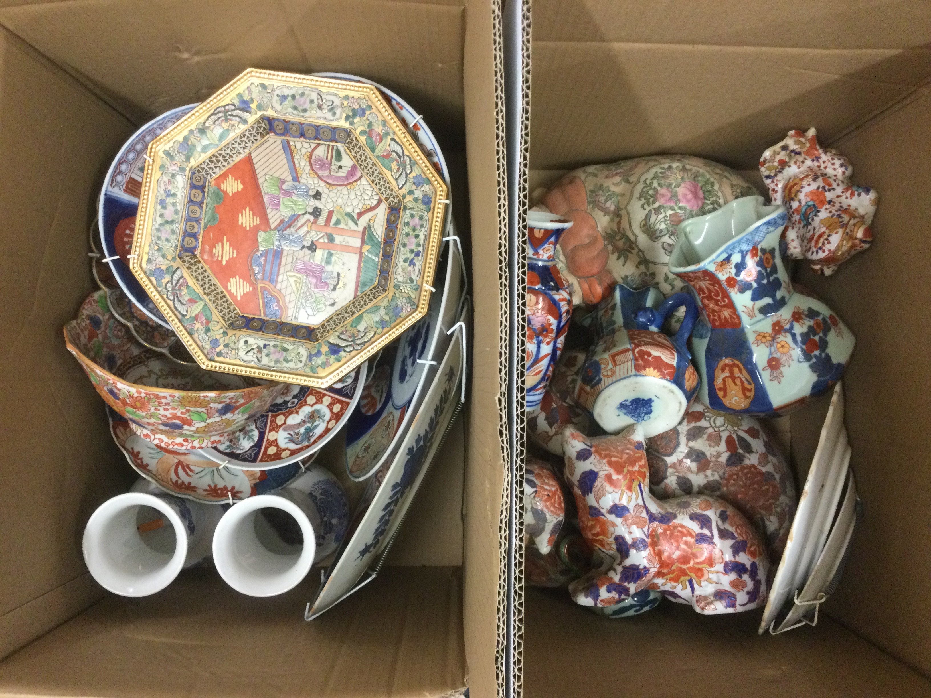Two boxes of Oriental ceramics comprising mainly modern imari figures of animals, dishes etc. Shipping category D.