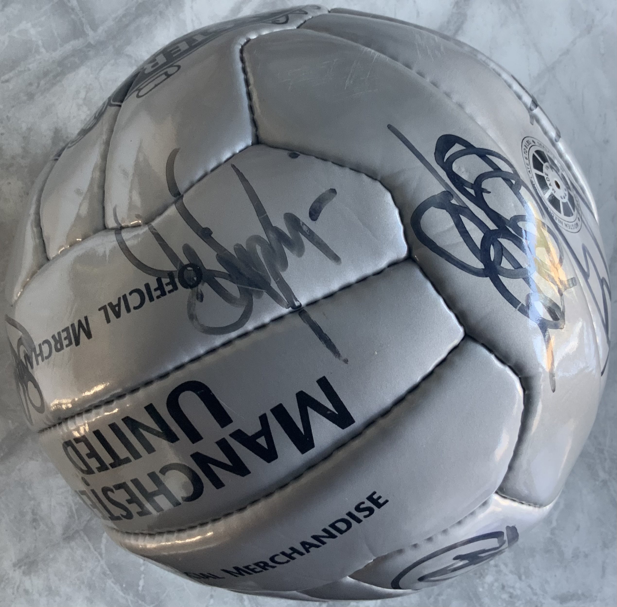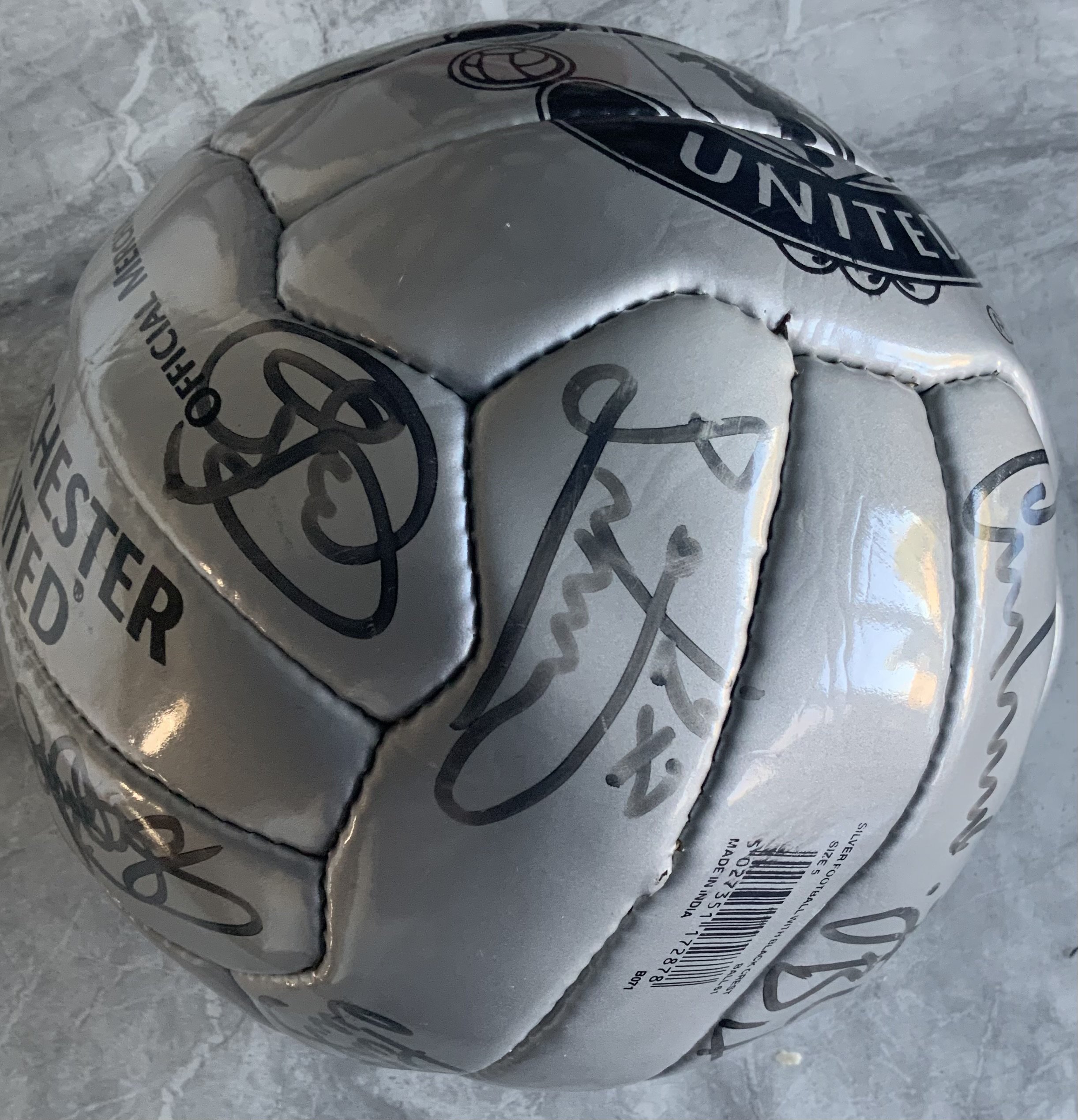 Manchester United Signed Football: Grey official Manchester United football from around the millennium with autographs to include Sheringham Fortune Irwin Solskjaer Gary + Phil Neville Silvestre and many others.