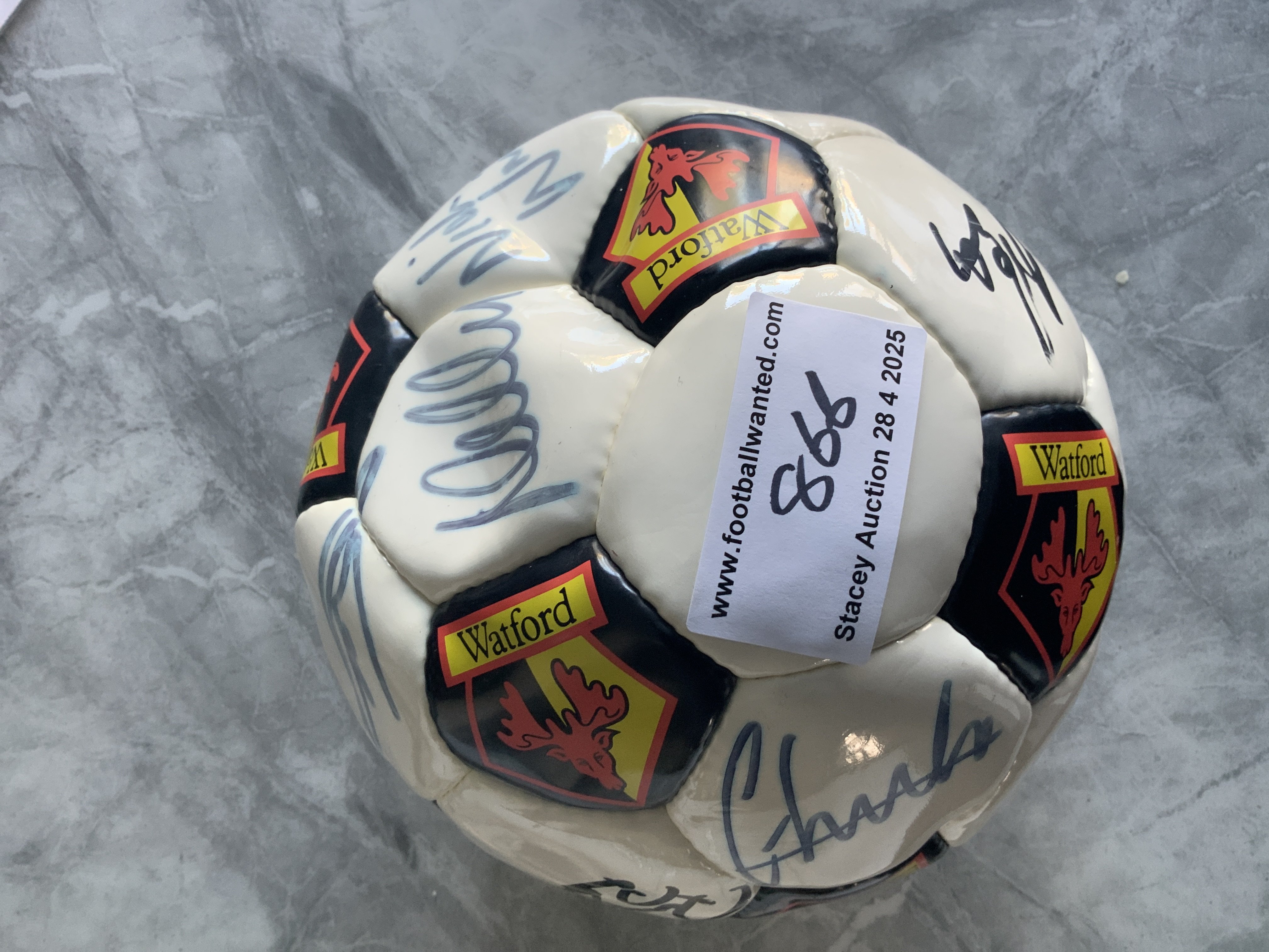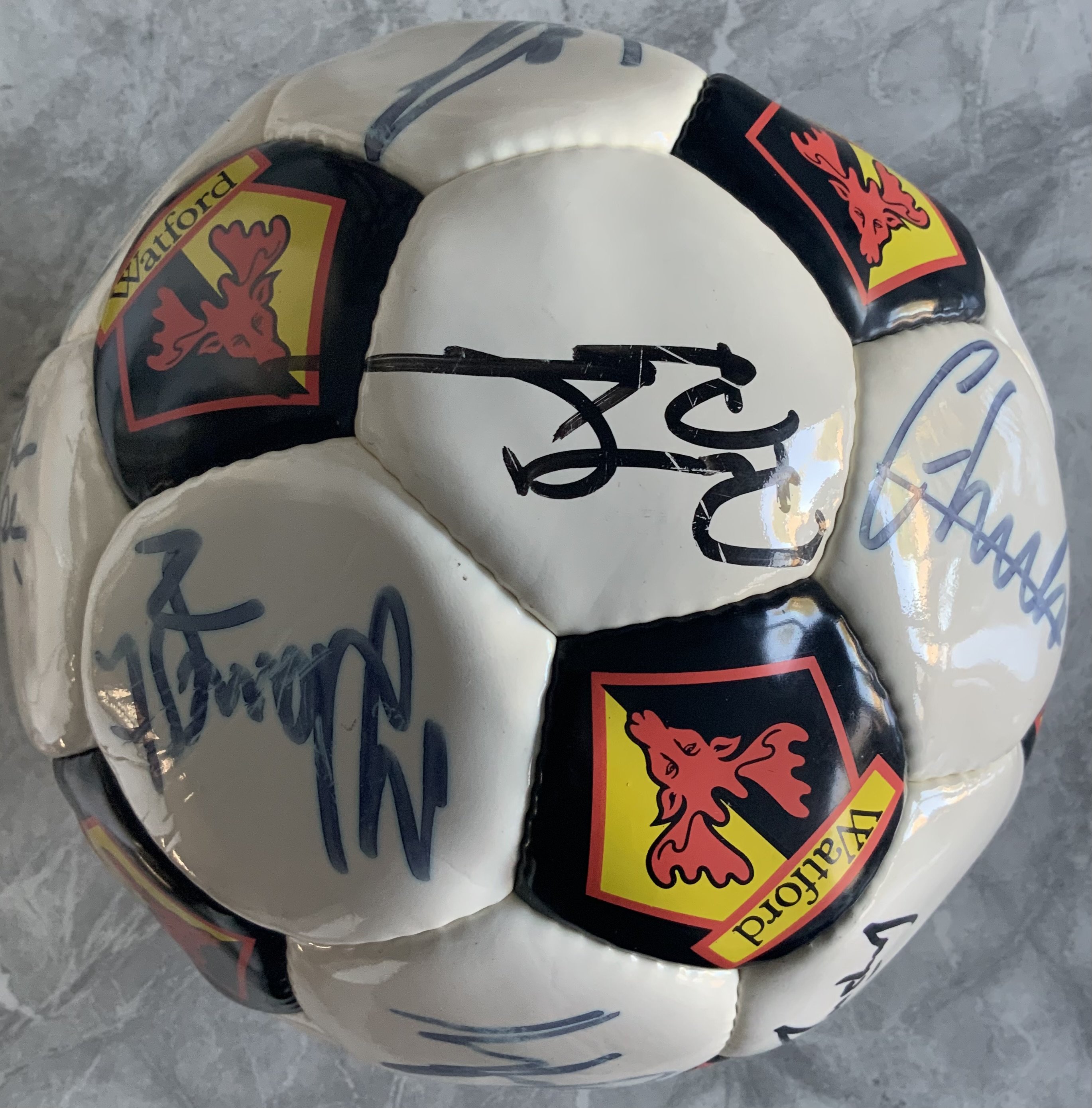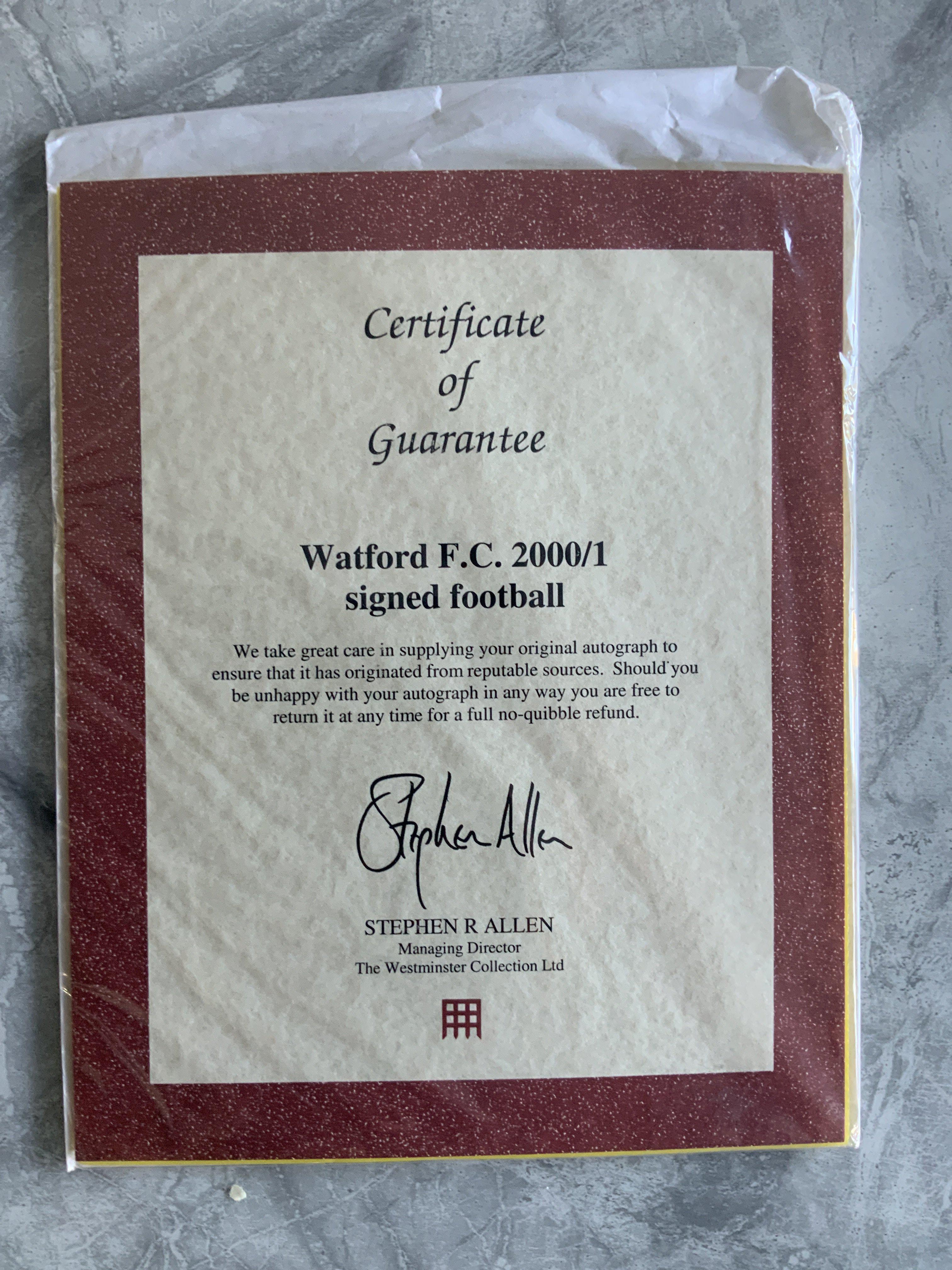 Watford 2000 - 2001 Squad Signed Football: Watford official football with club badge throughout with many autographs including Nick Wright. COA from reputable Westminster Collection.