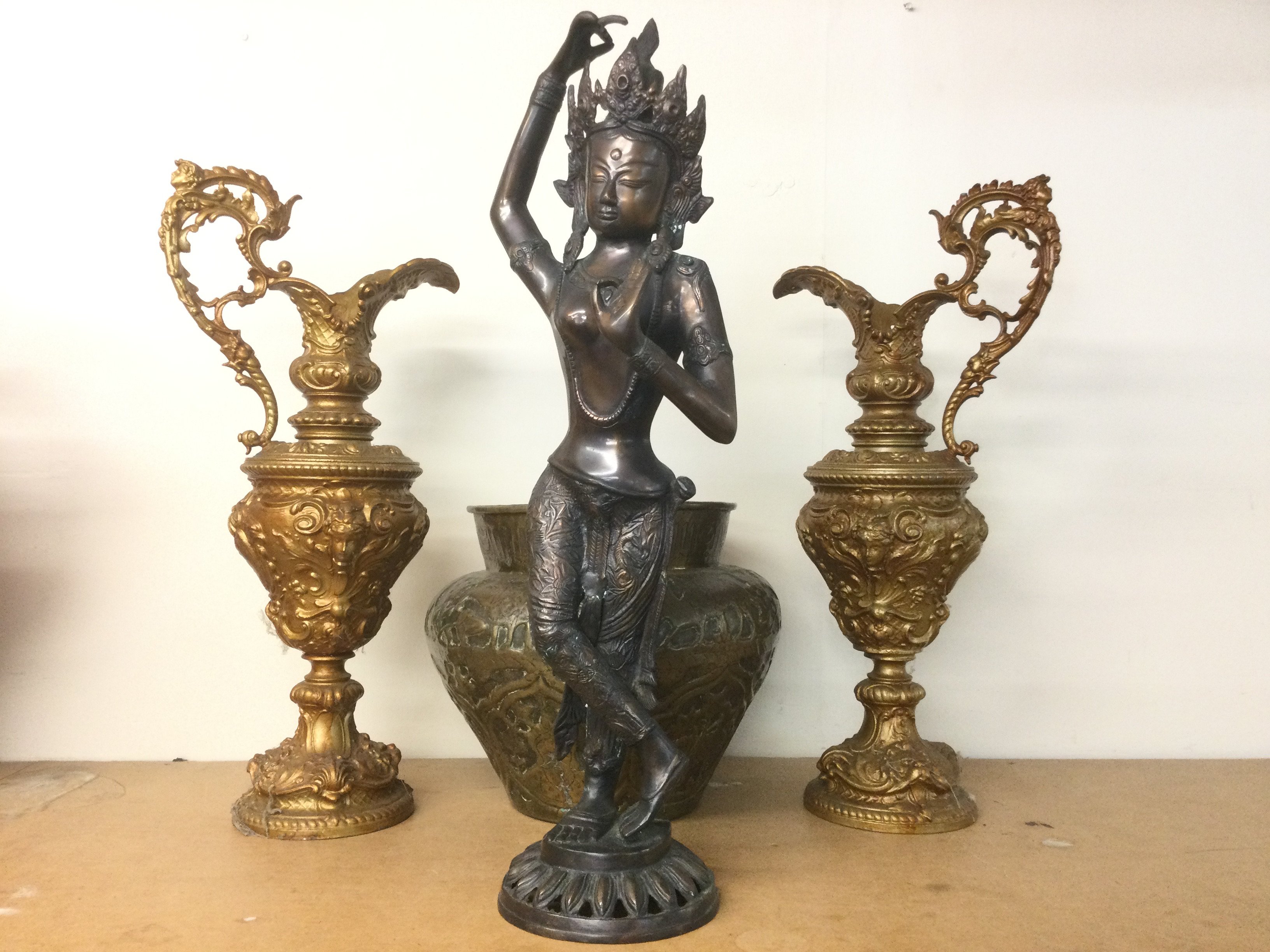 A large bronzed Tibetan figure, approx height 66cm, a pair of ewers and a mixed metal vase. Shipping category D.
