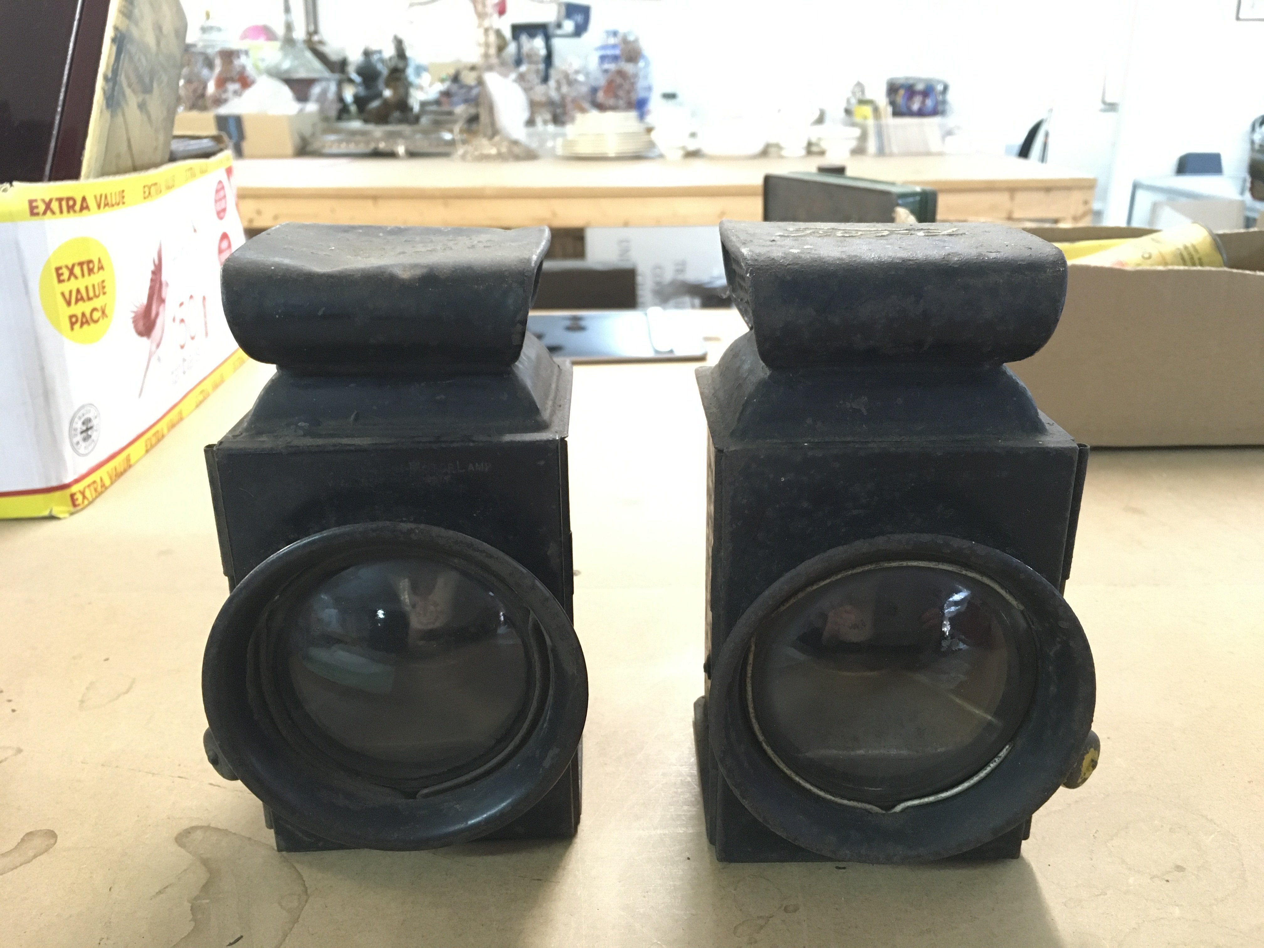 Early black painted car lamps with burners , one impress Ford . This lot cannot be posted