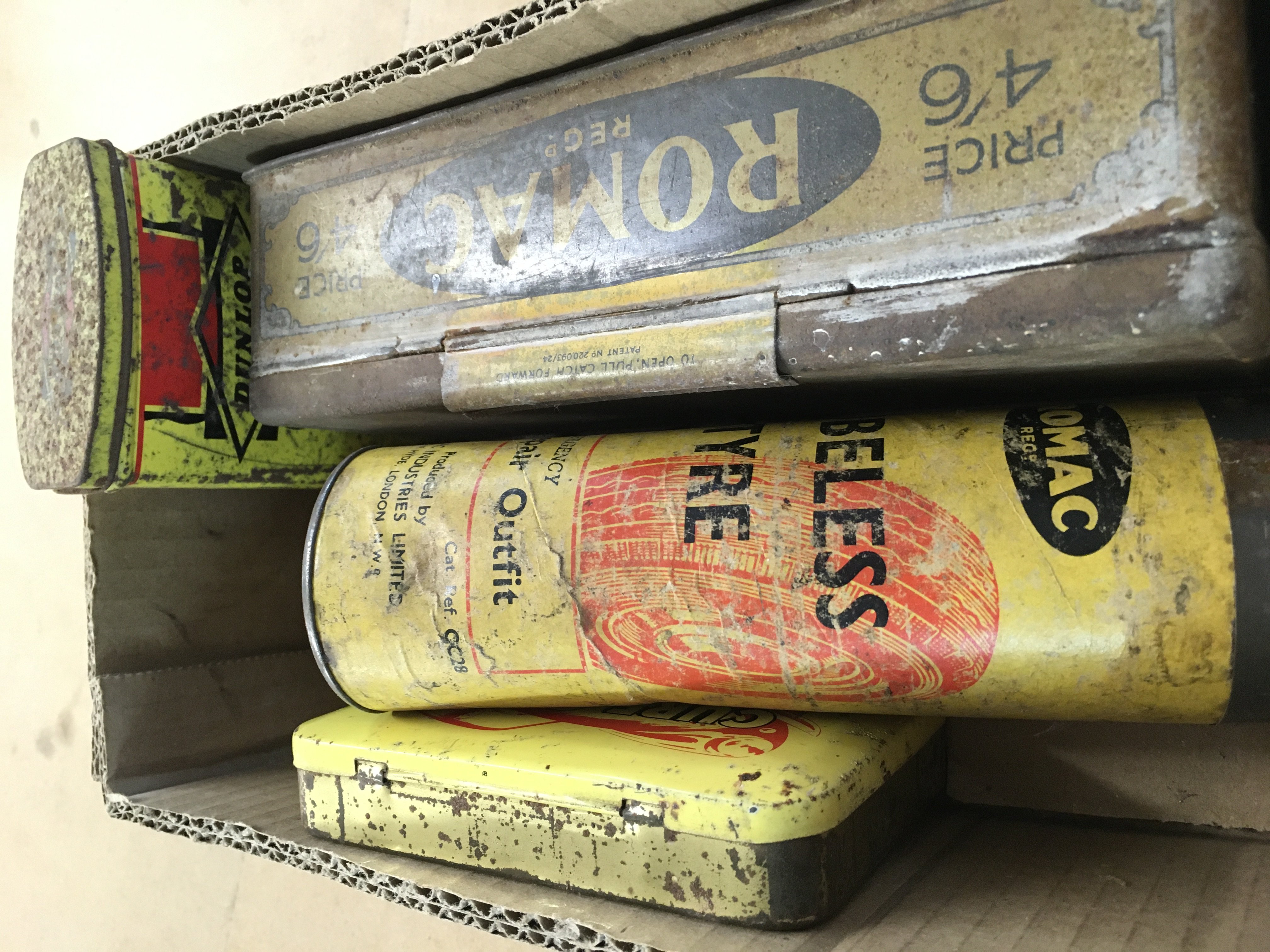 Early Romac puncture repair pack and six other puncture tins . Postage category B