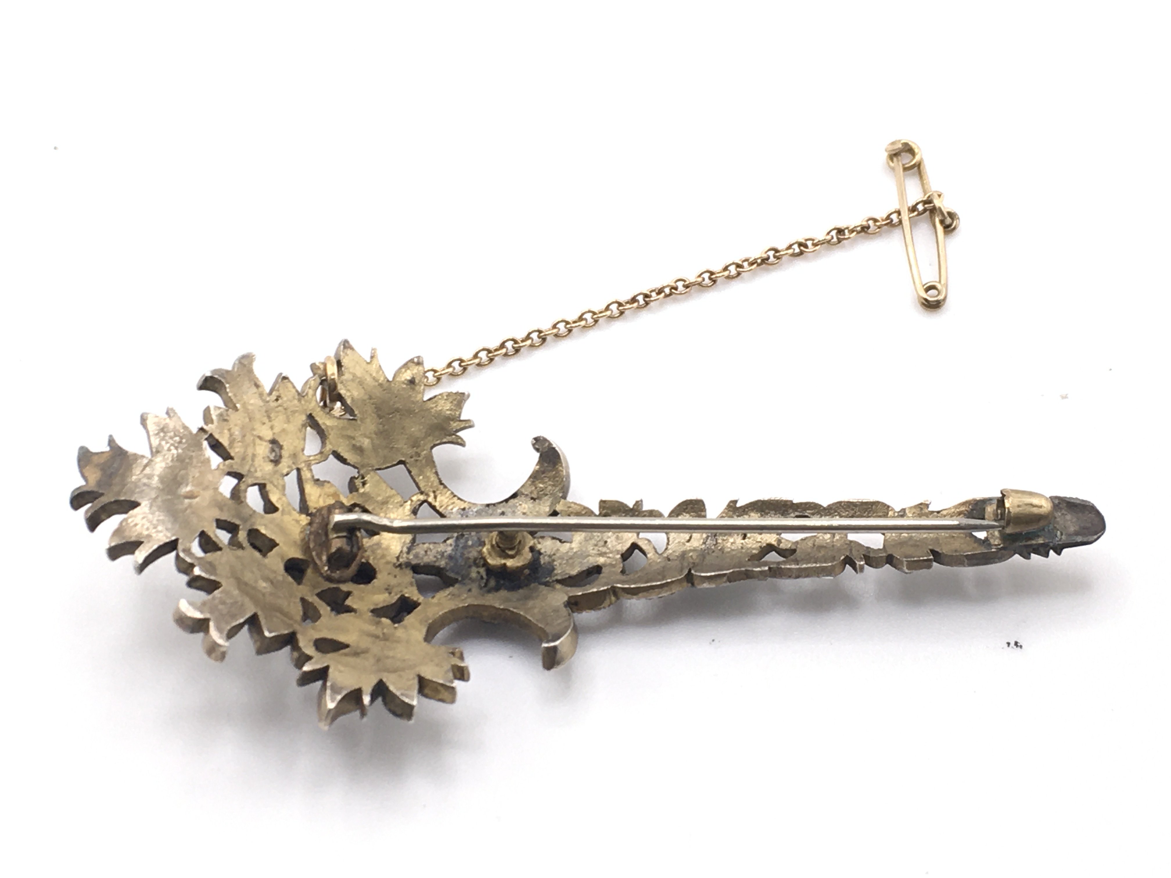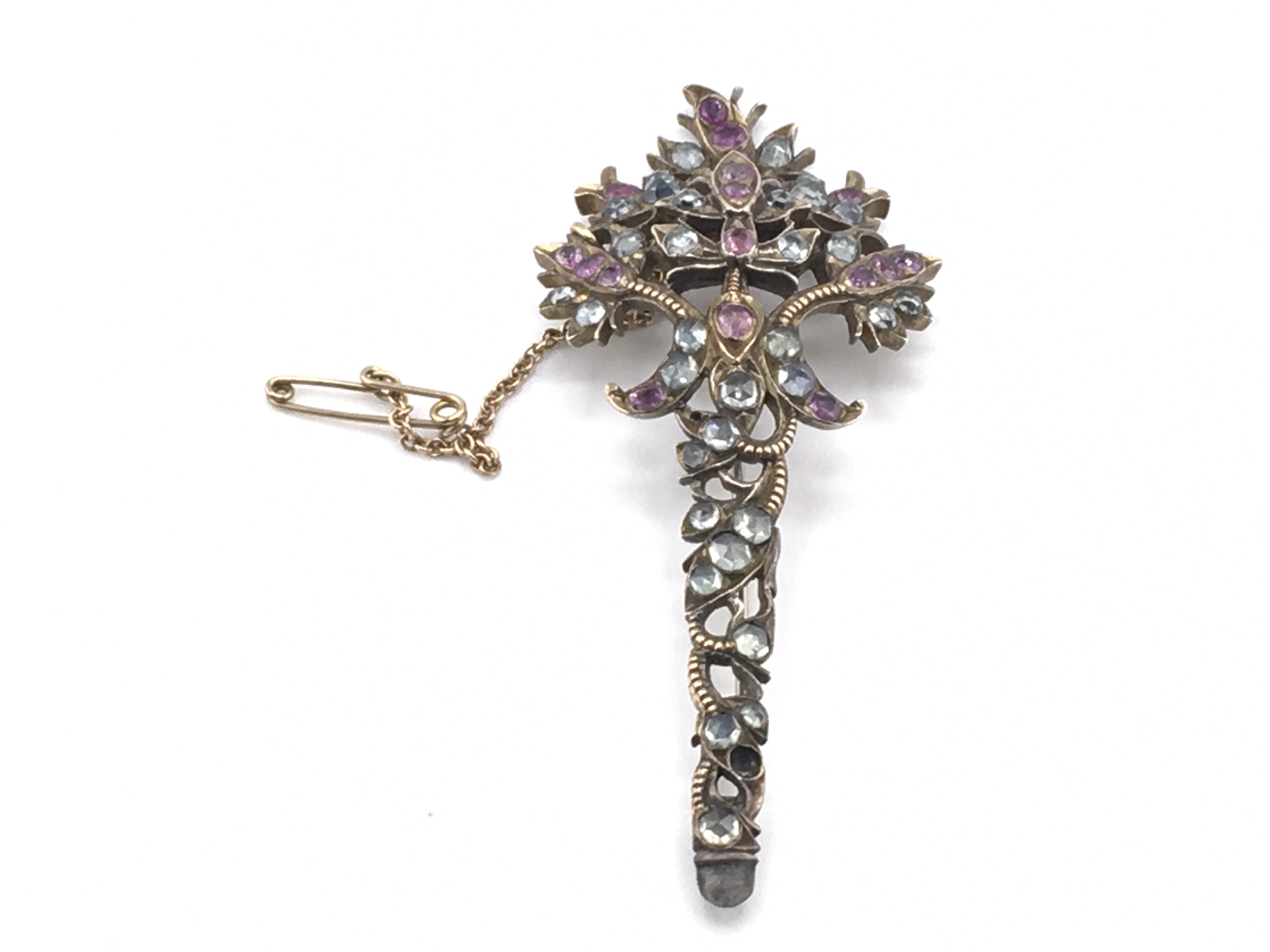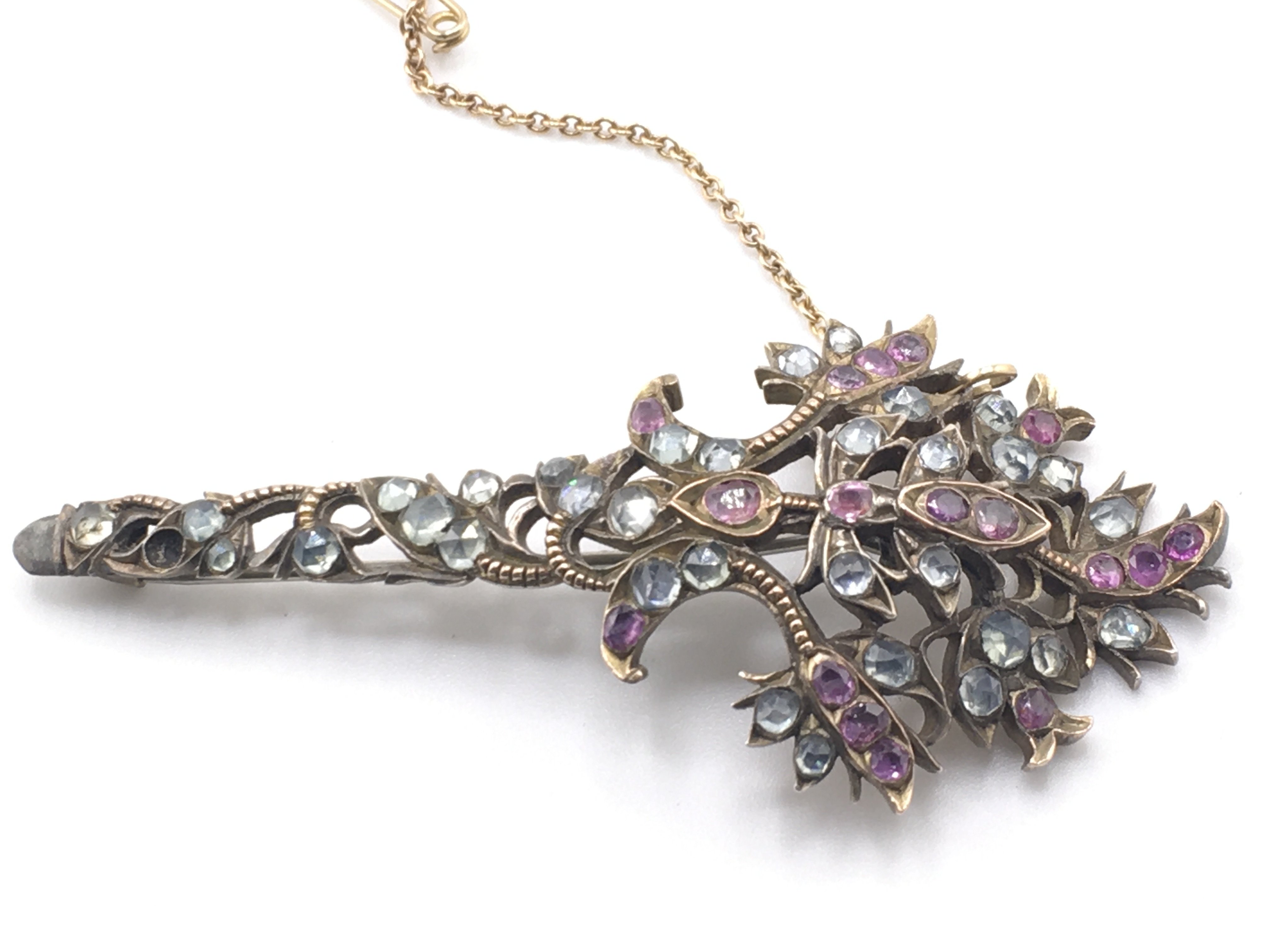 A fine Edwardian brooch (conversion) inset with a spray of Pink rubies and Aquamarine rose cut stones, possibly originally a section from a tiara. (Missing one stone), inconclusive results for metal (gold/silver). 7.5cm x 3.5cm. Total weight 15.60g.