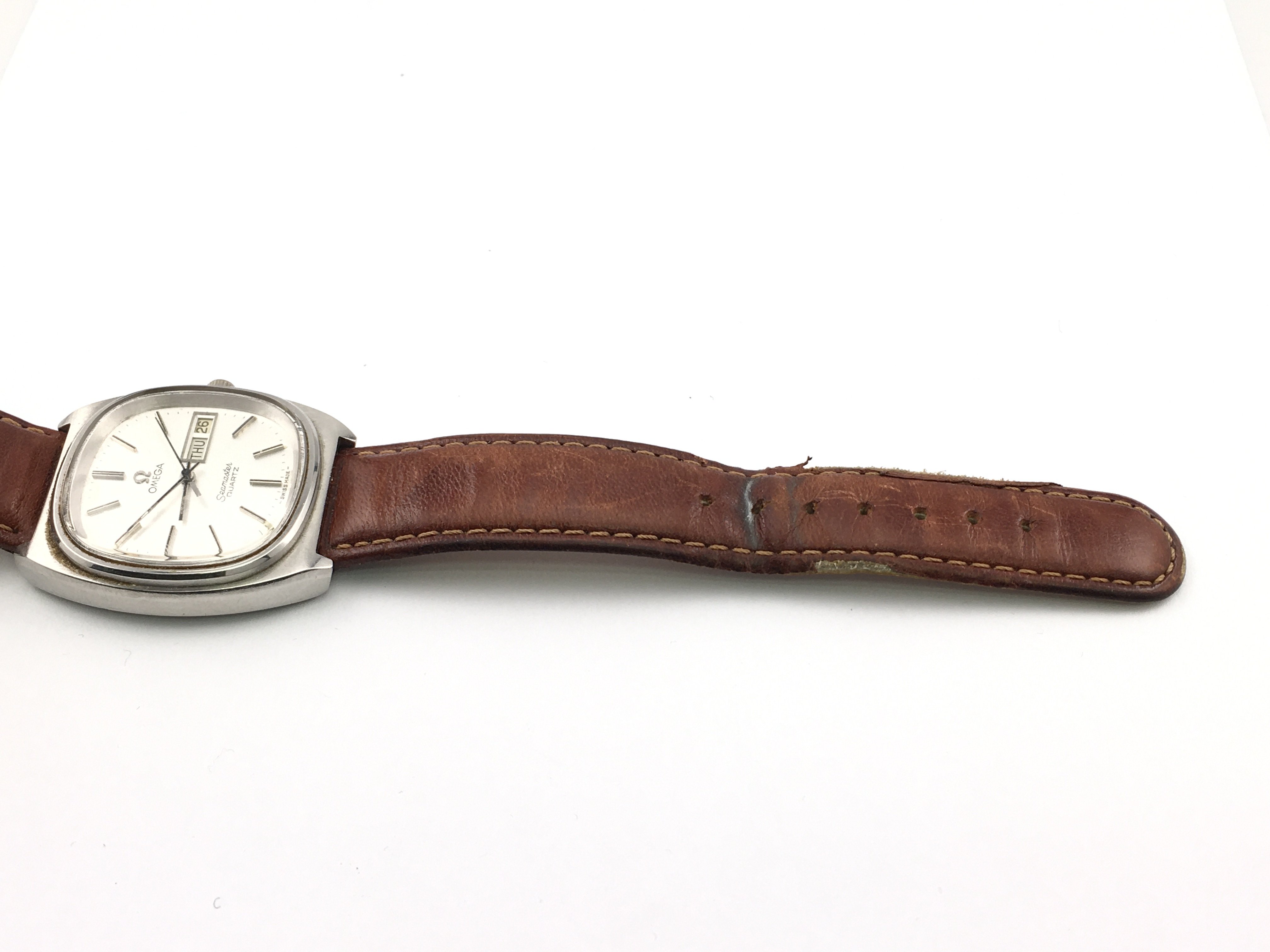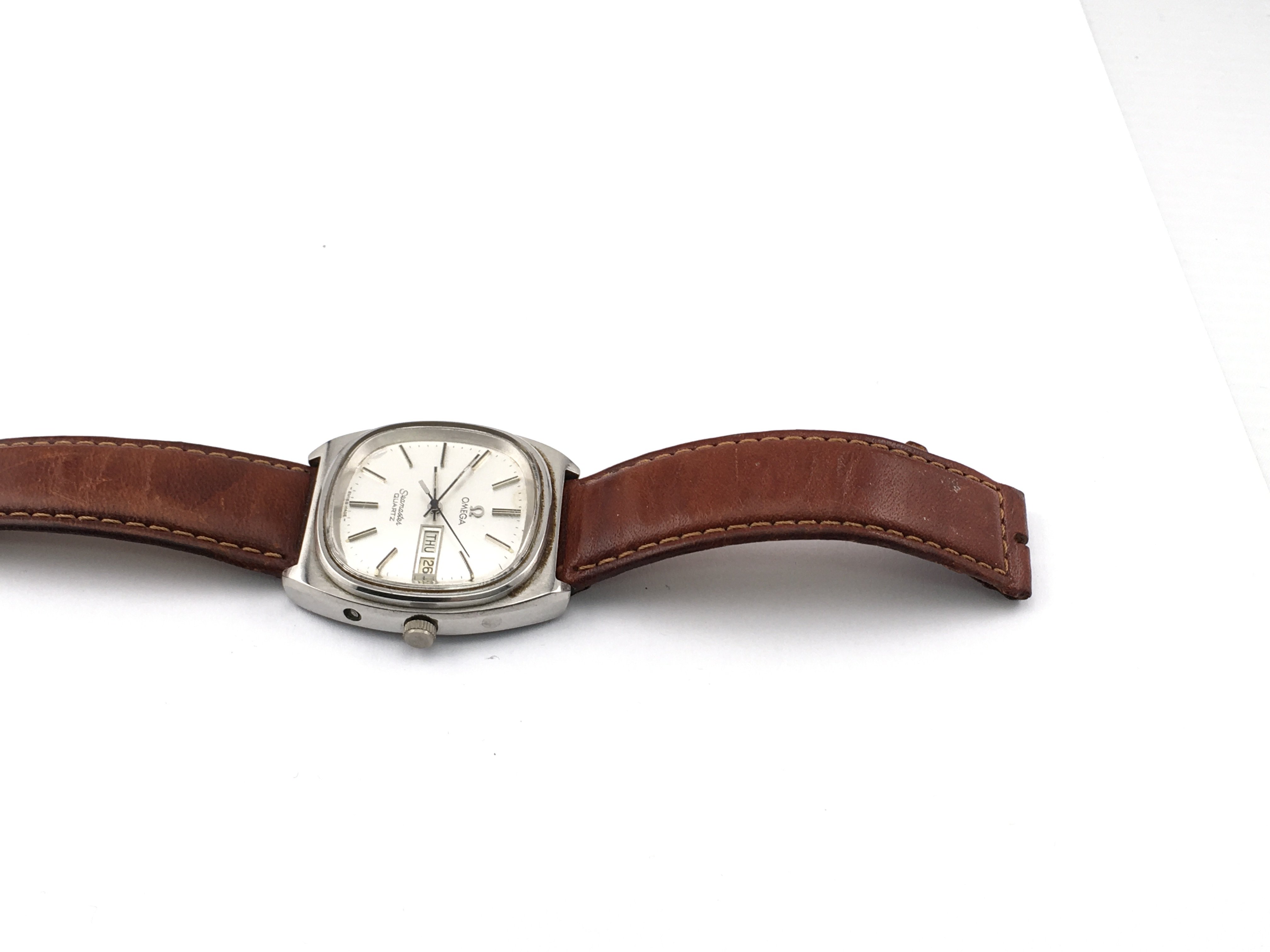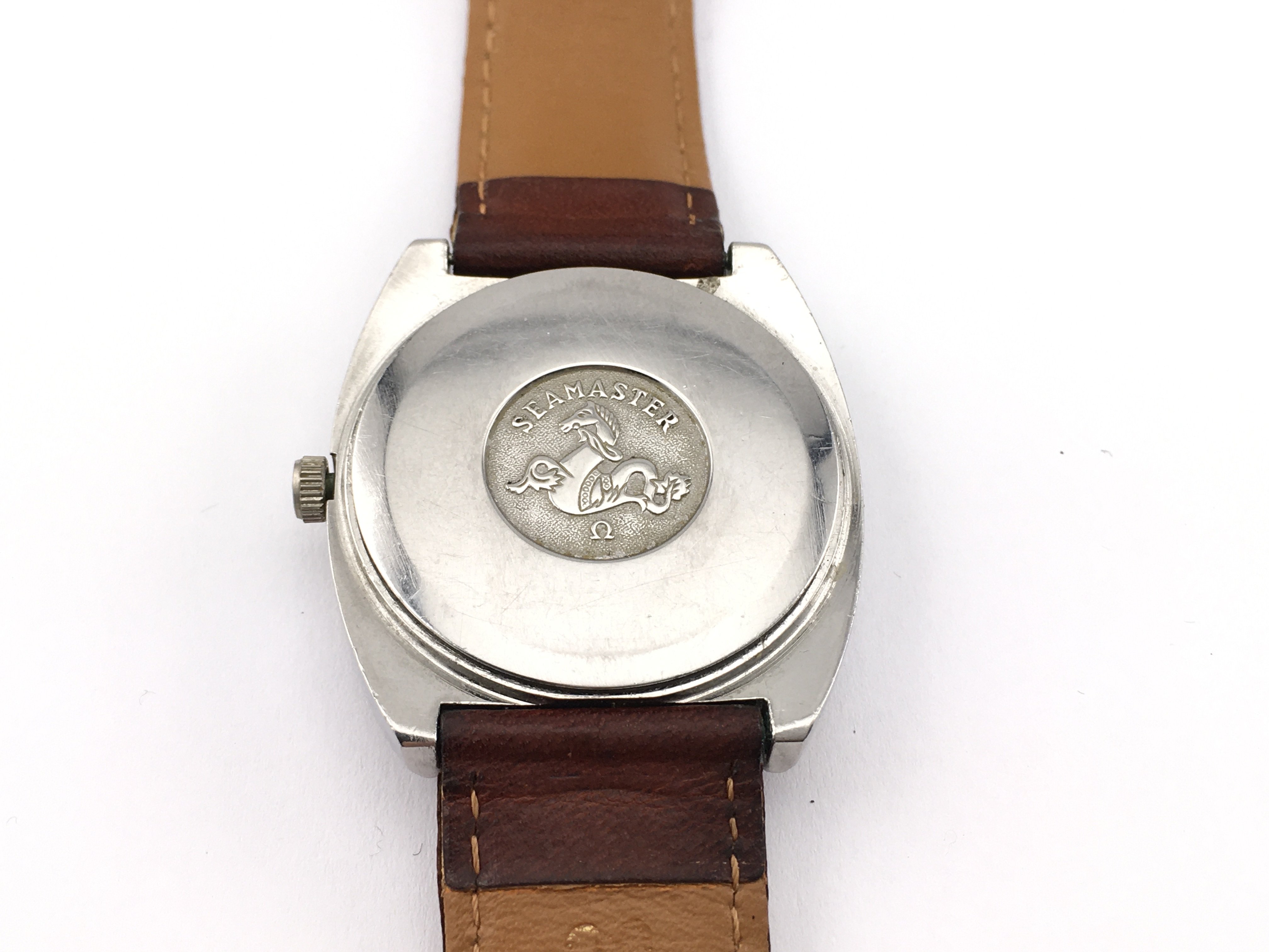 A vintage Omega Seamaster quartz watch with silver dial and brown leather strap. Case approximately 36mm. Not seen running. Postage B