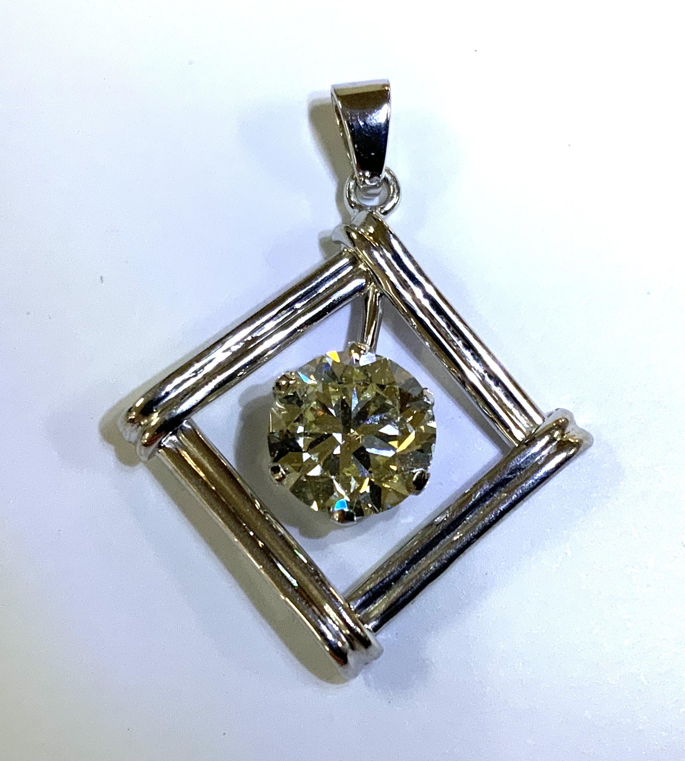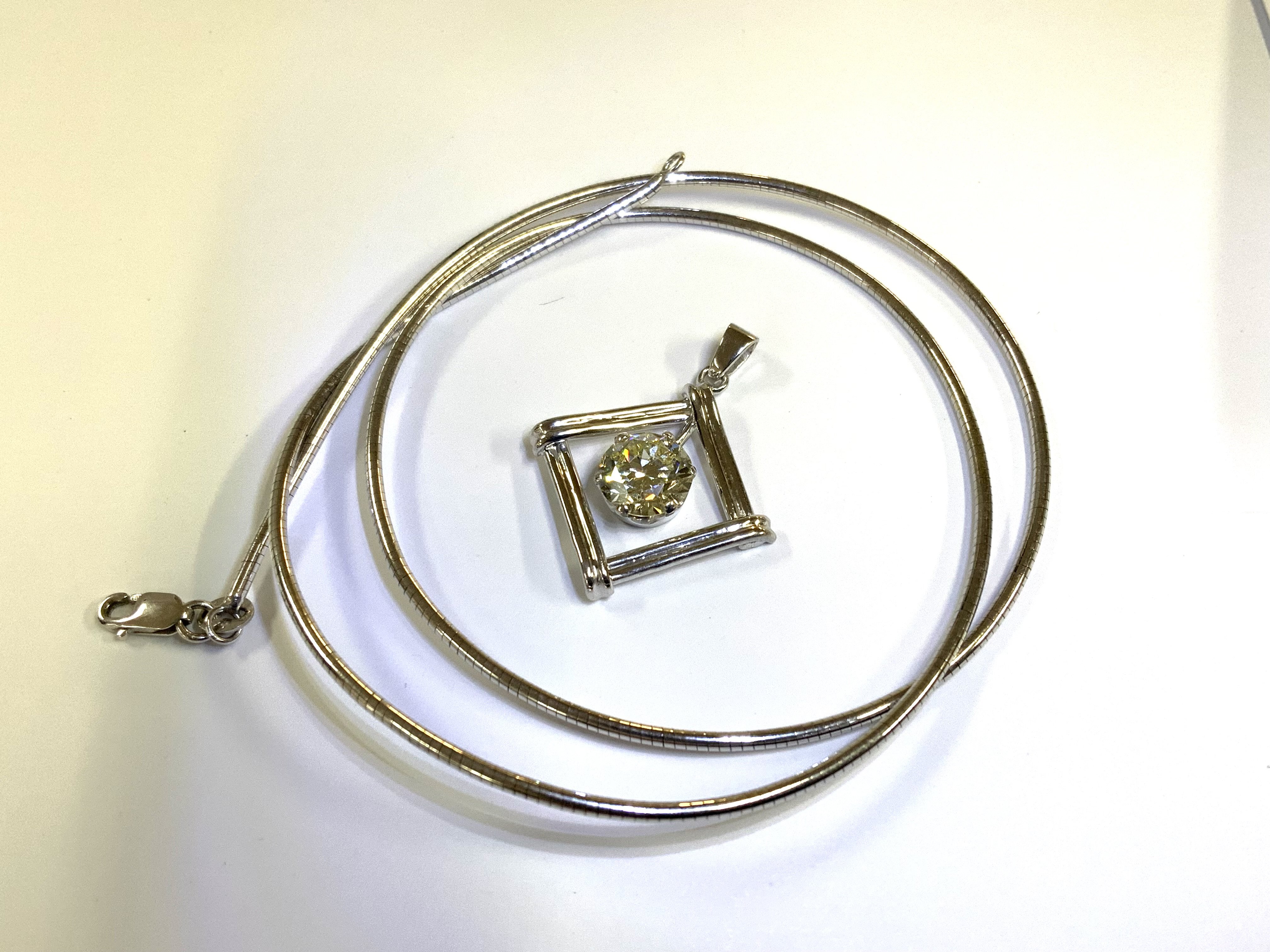A single 2.05ct round brilliant cut diamond, Colour O/P, Clarity VS2 ( stone measurements 8.17-8.30 x 4.85mm. Mounted in an 6 claw 9ct white gold pendant mount with a 14ct gold rope necklace. (A)