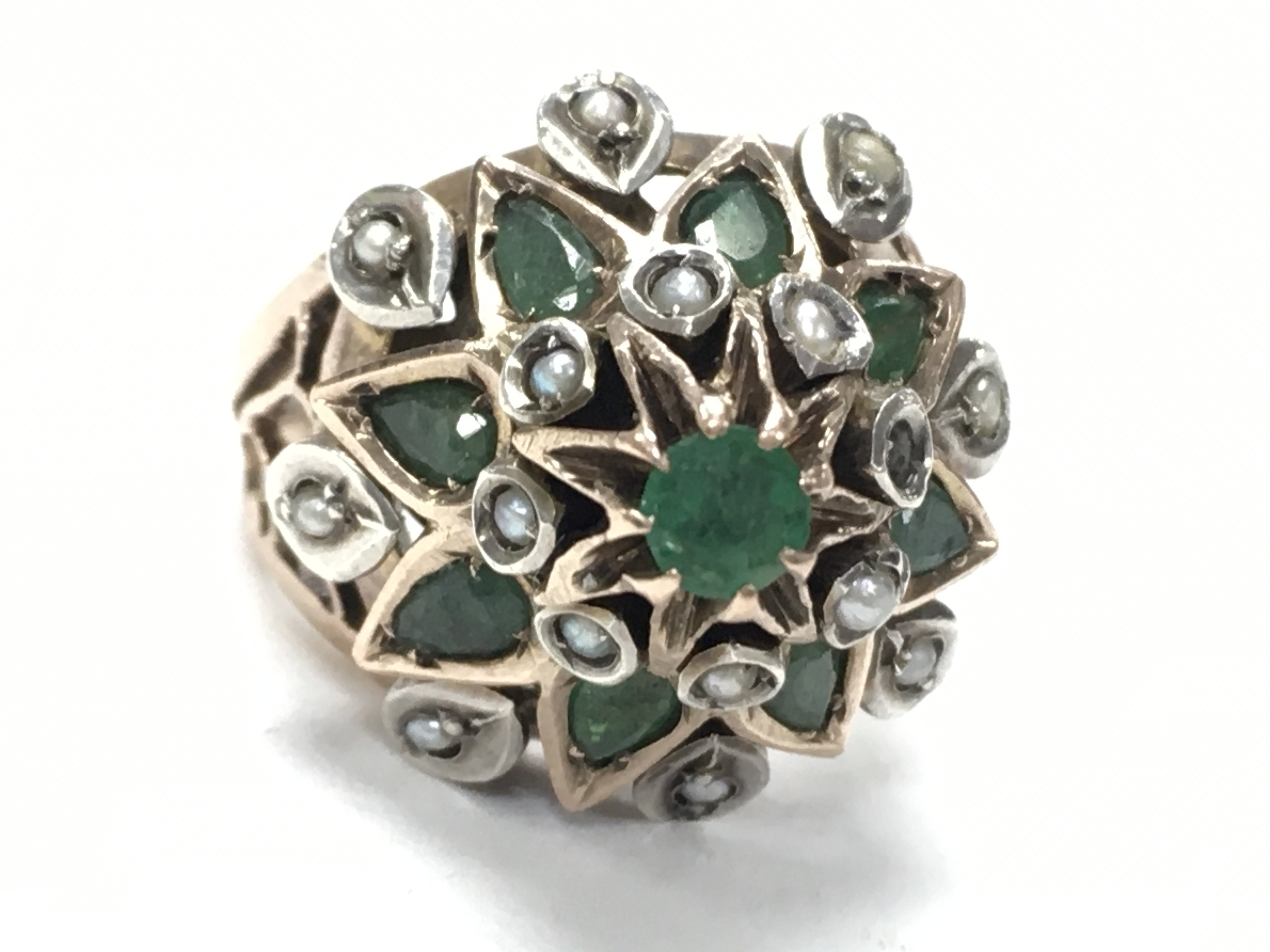 A 9ct gold emerald and pearl set dress ring , size J/K. Total weight 5.8g Postage category A
