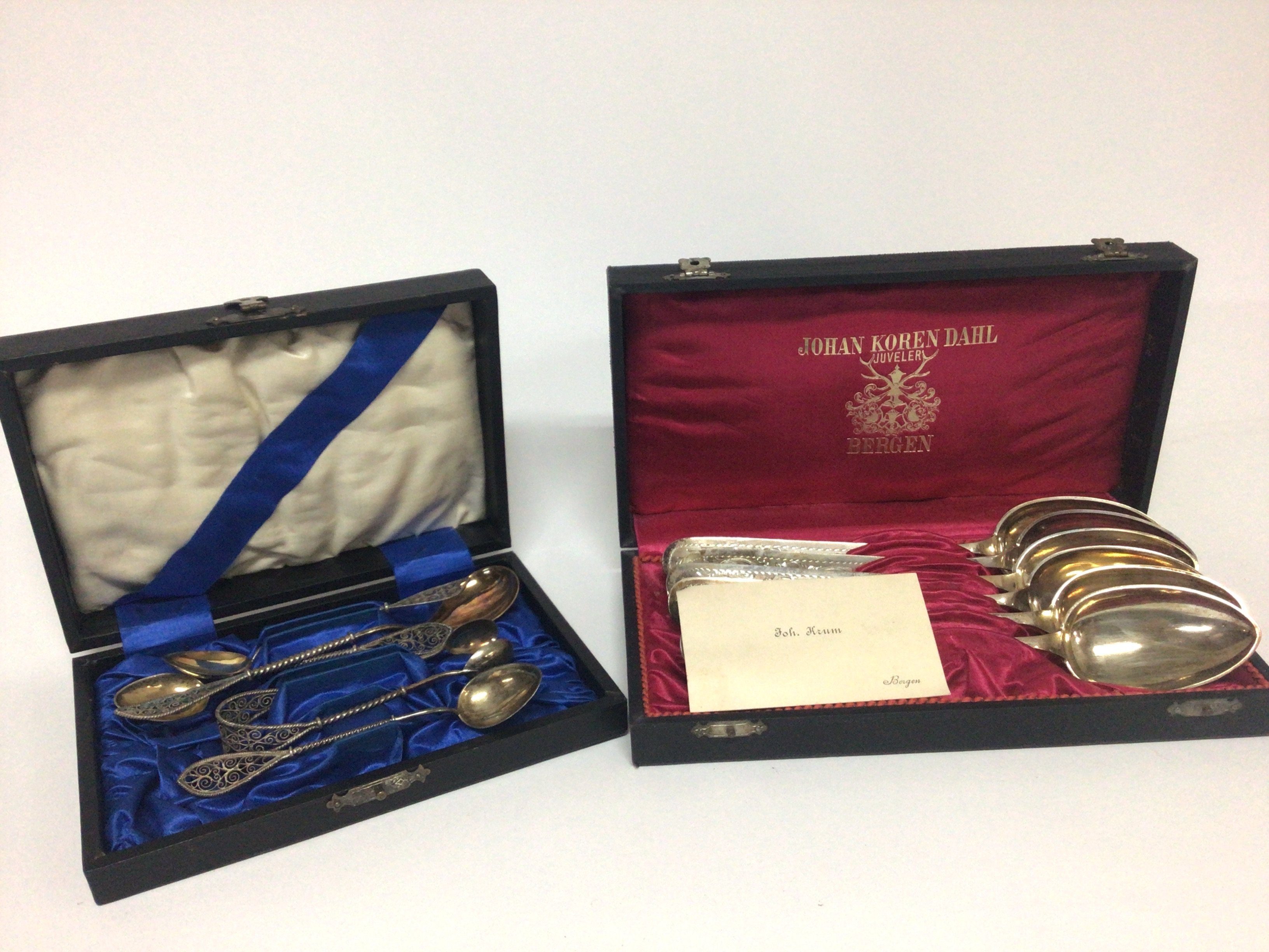 A cased set of Norwegian silver spoons Johan Korean Dahl Bergen and a cased set of filigree tea spoons and tongs.