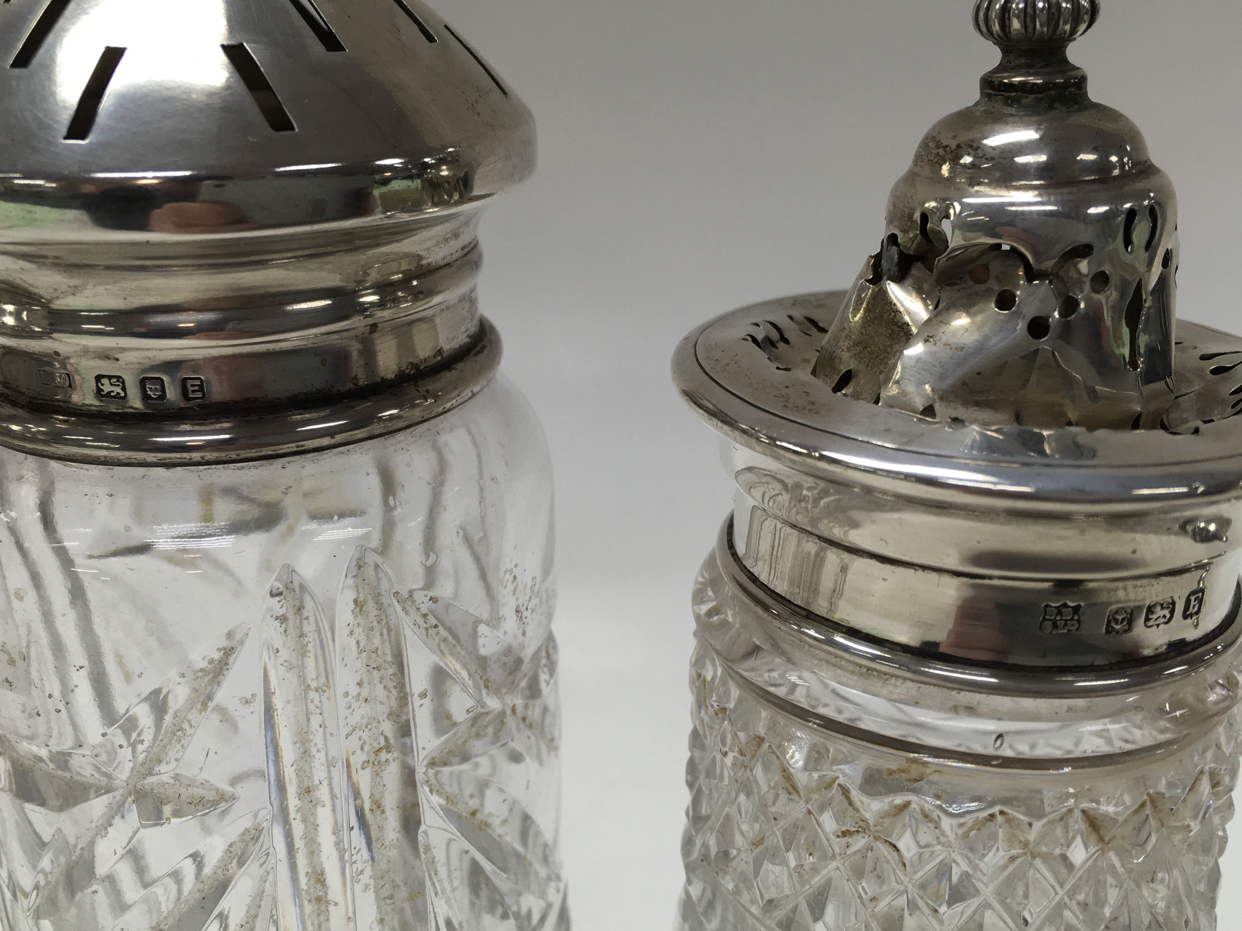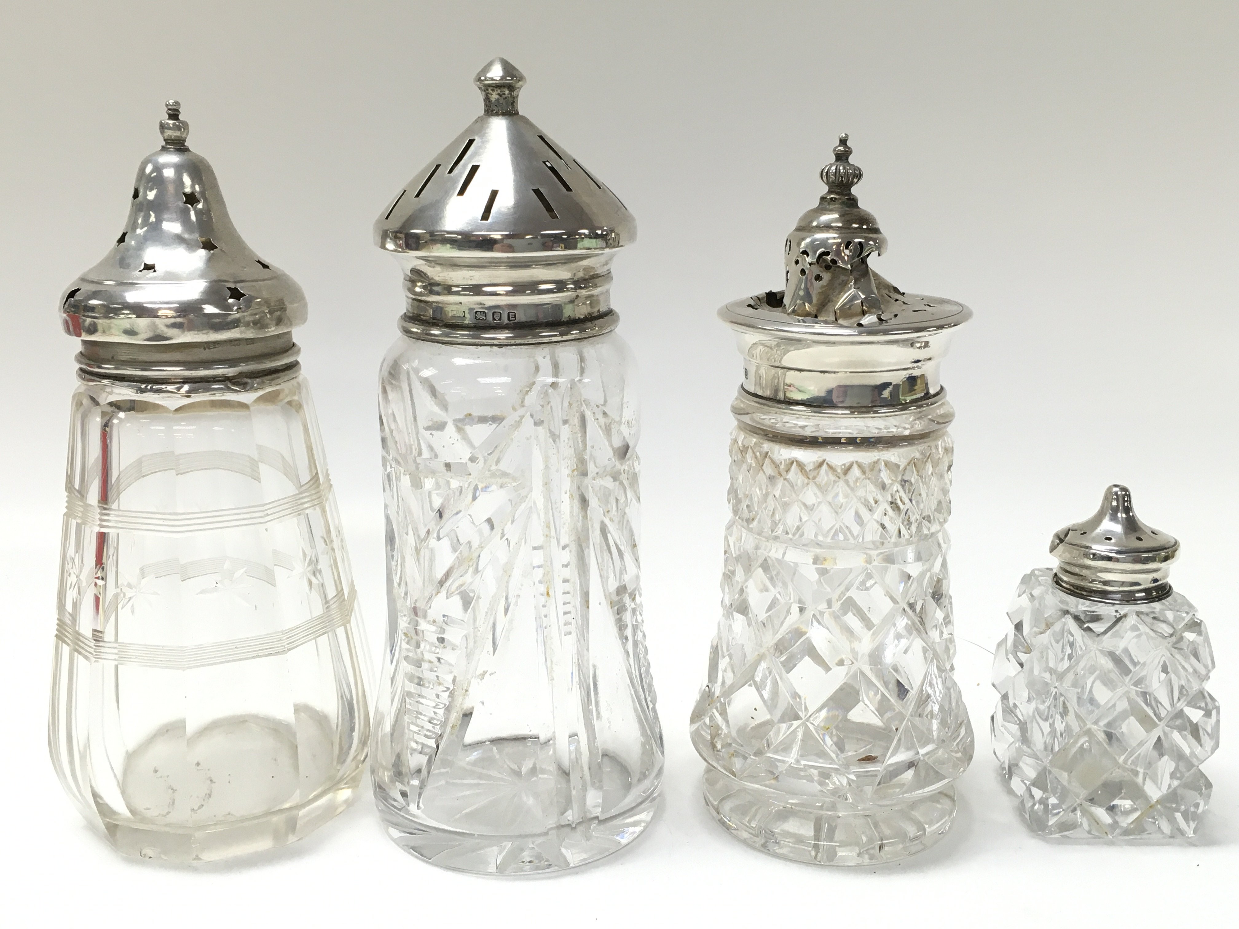 Four cut glass sugar casters with silver hallmarked tops, this lot cannot be posted