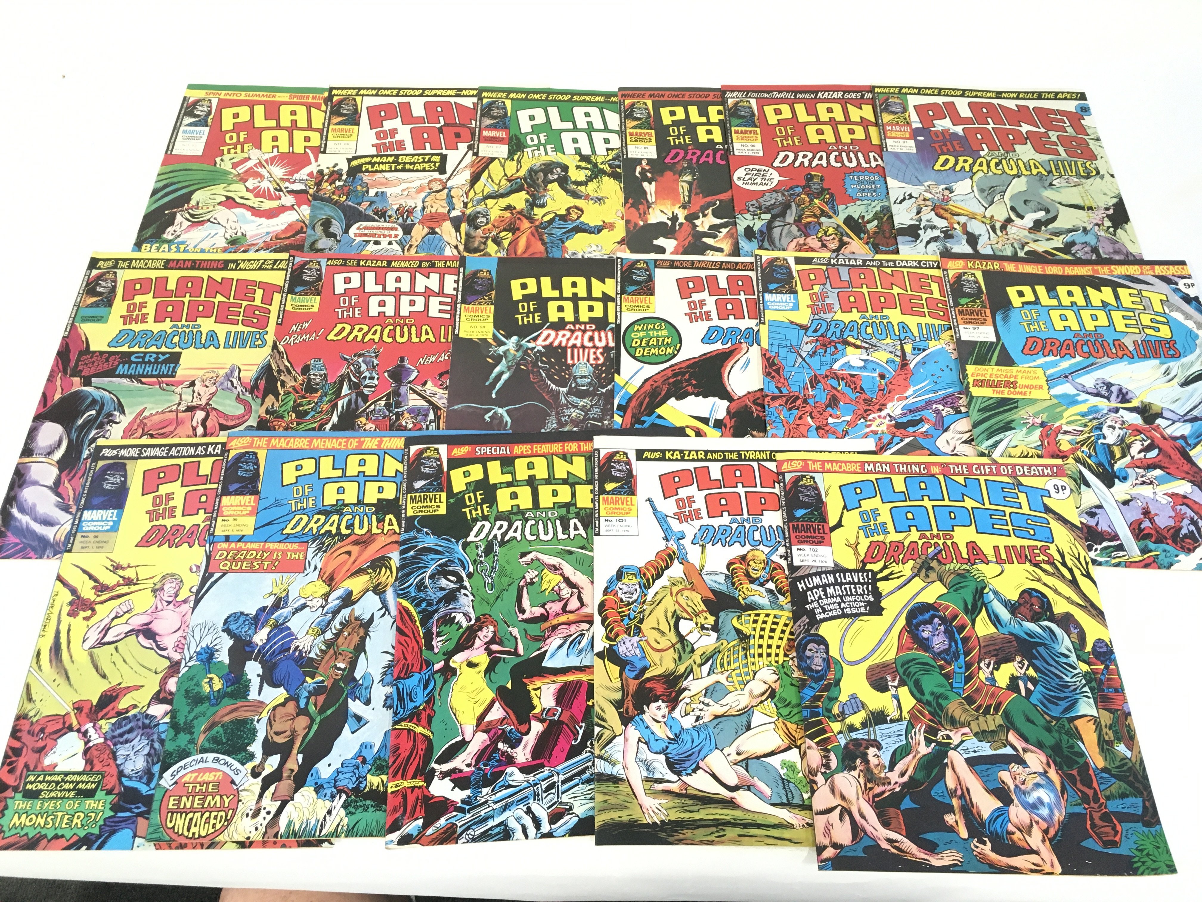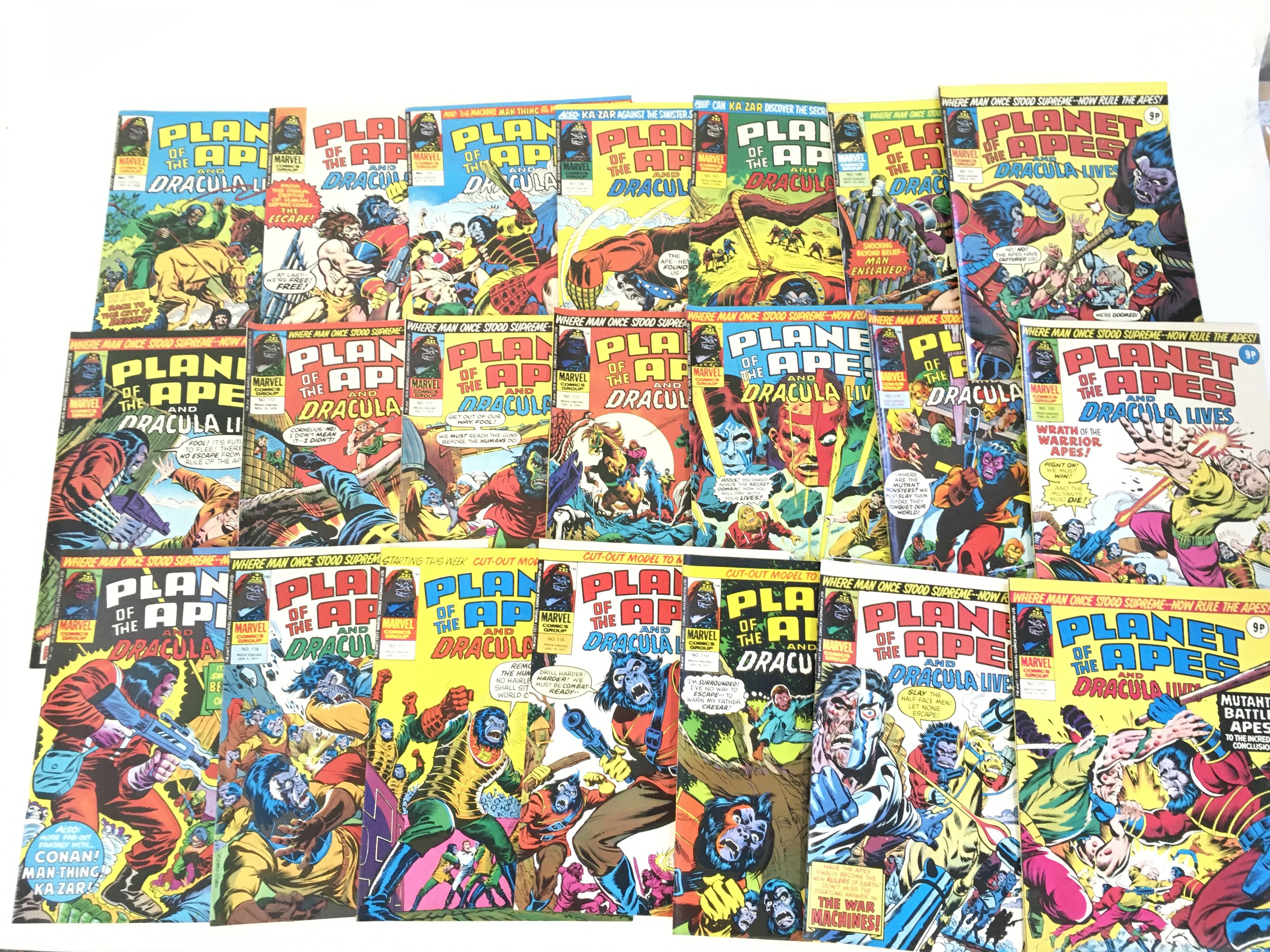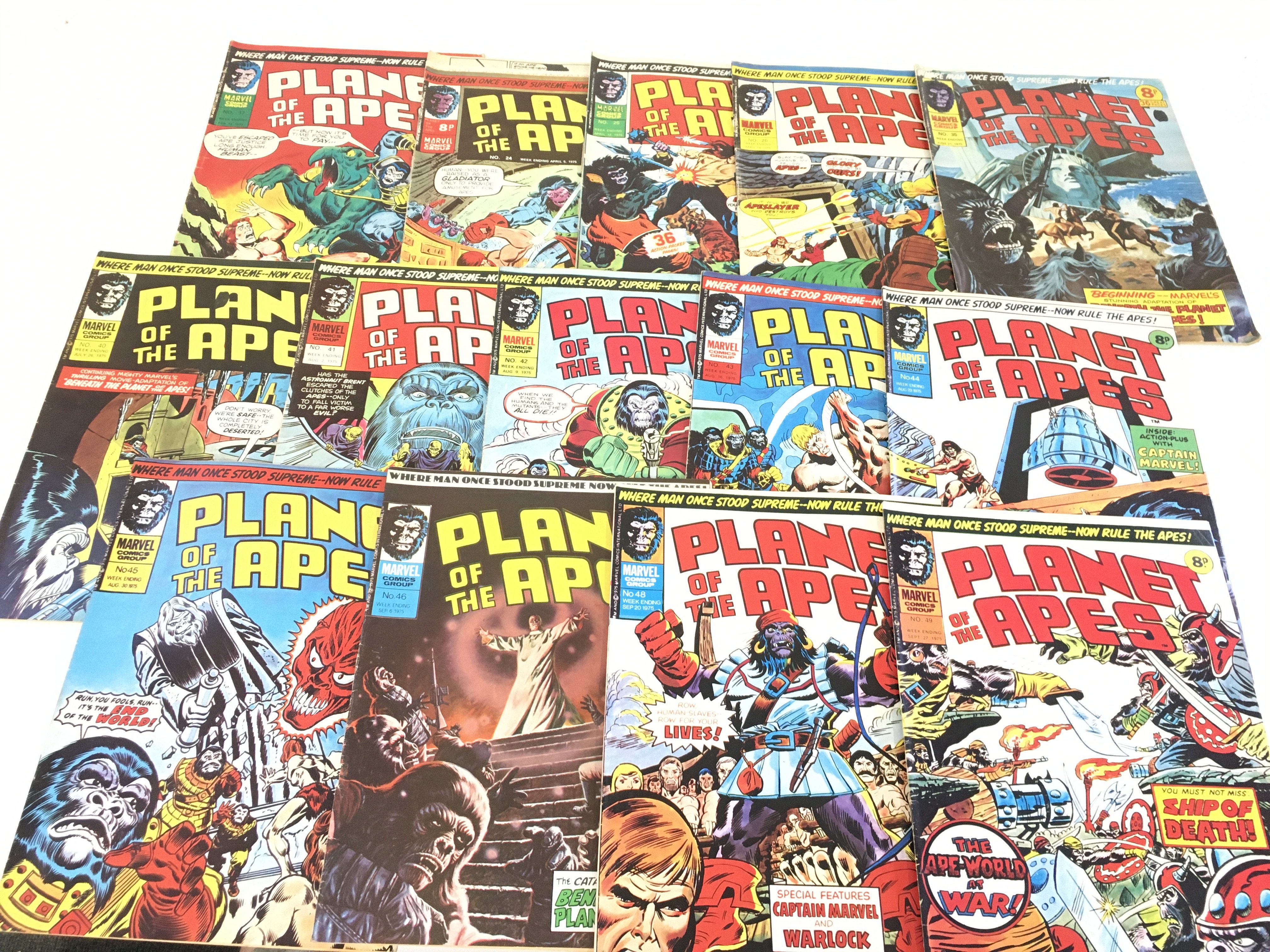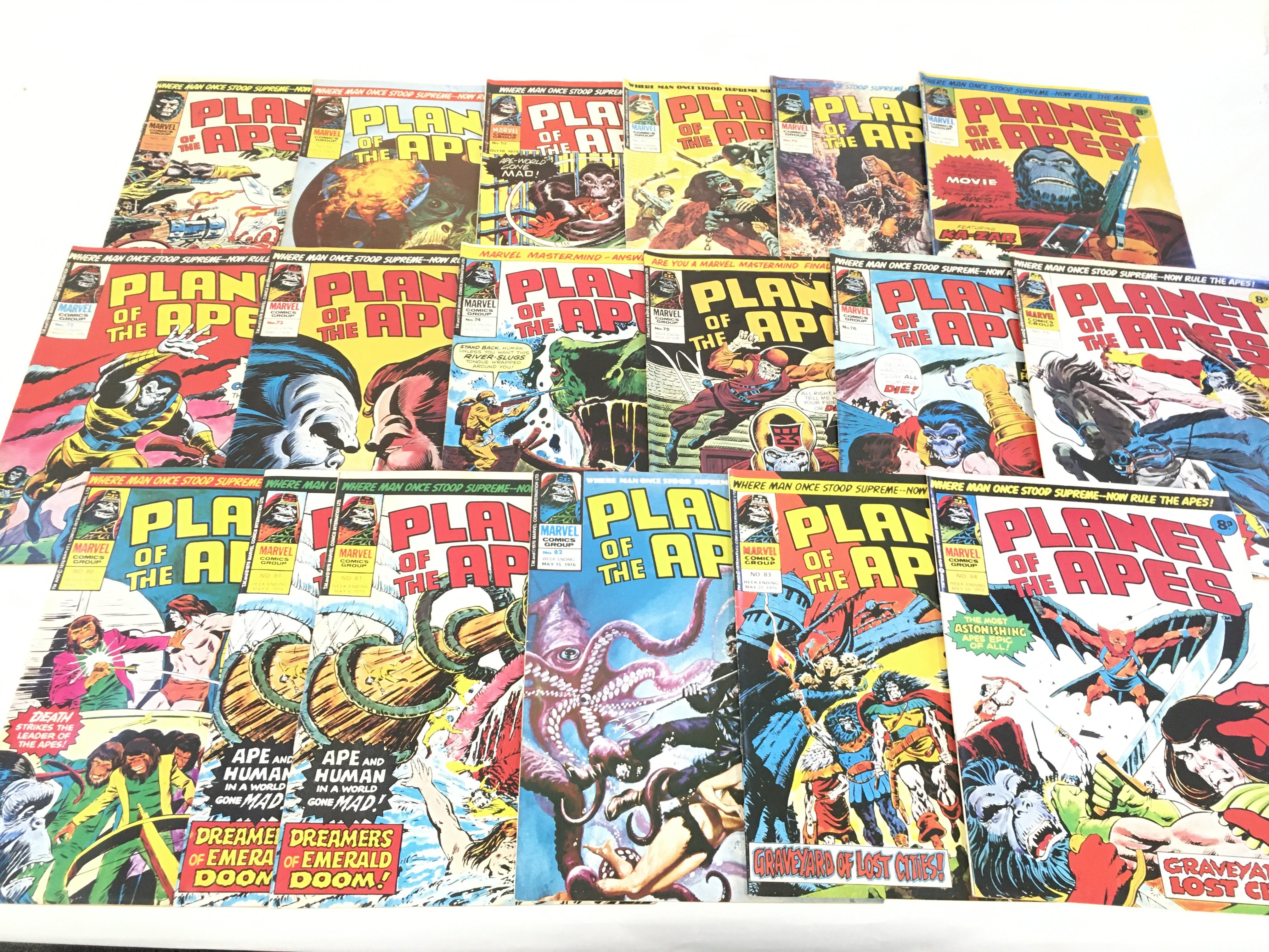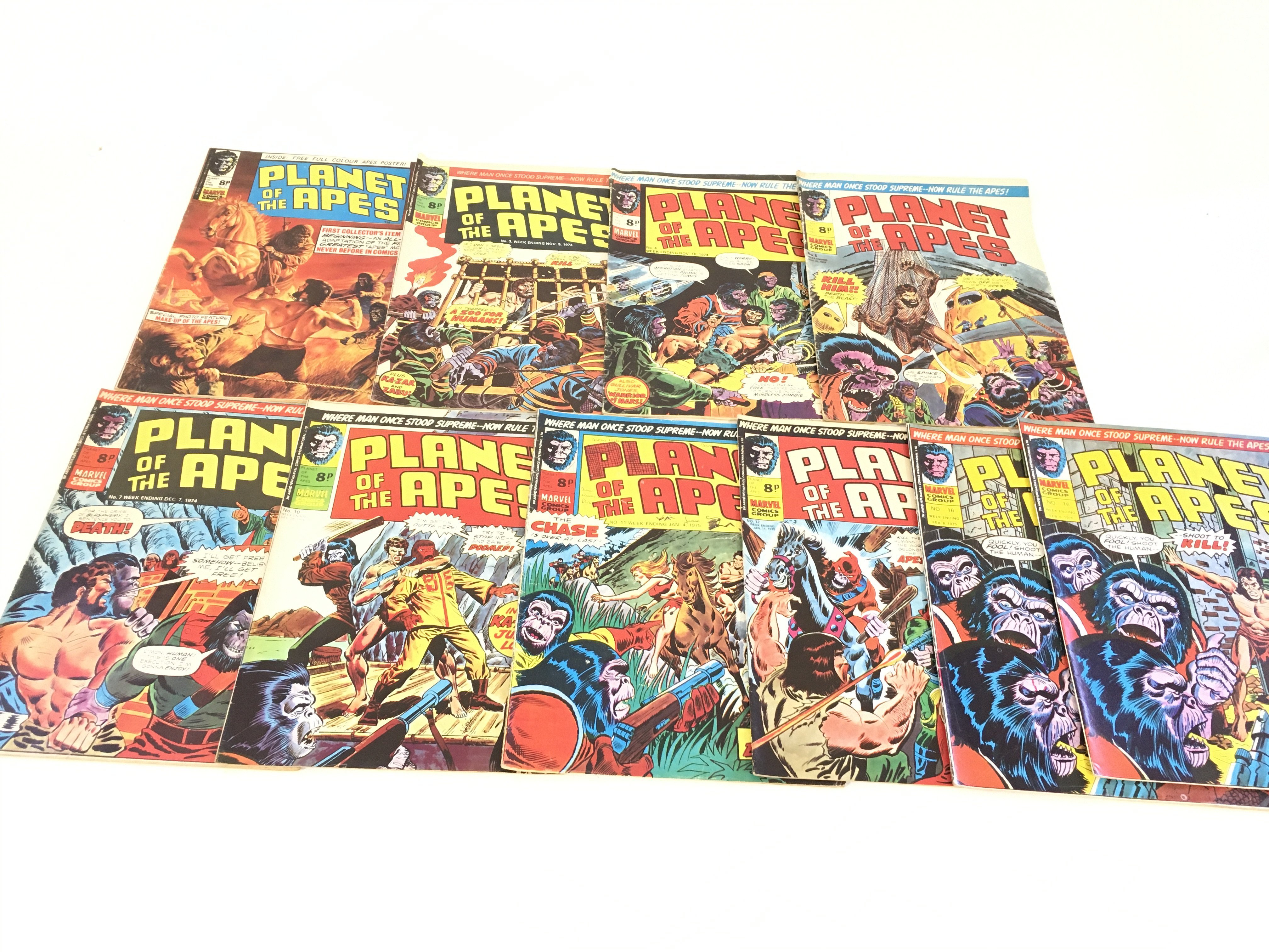 A box containing approximately 140 1970's marvel comics. Consisting of The Incredible Hulk and Planet of the Apes, including a first issue planet of the apes.