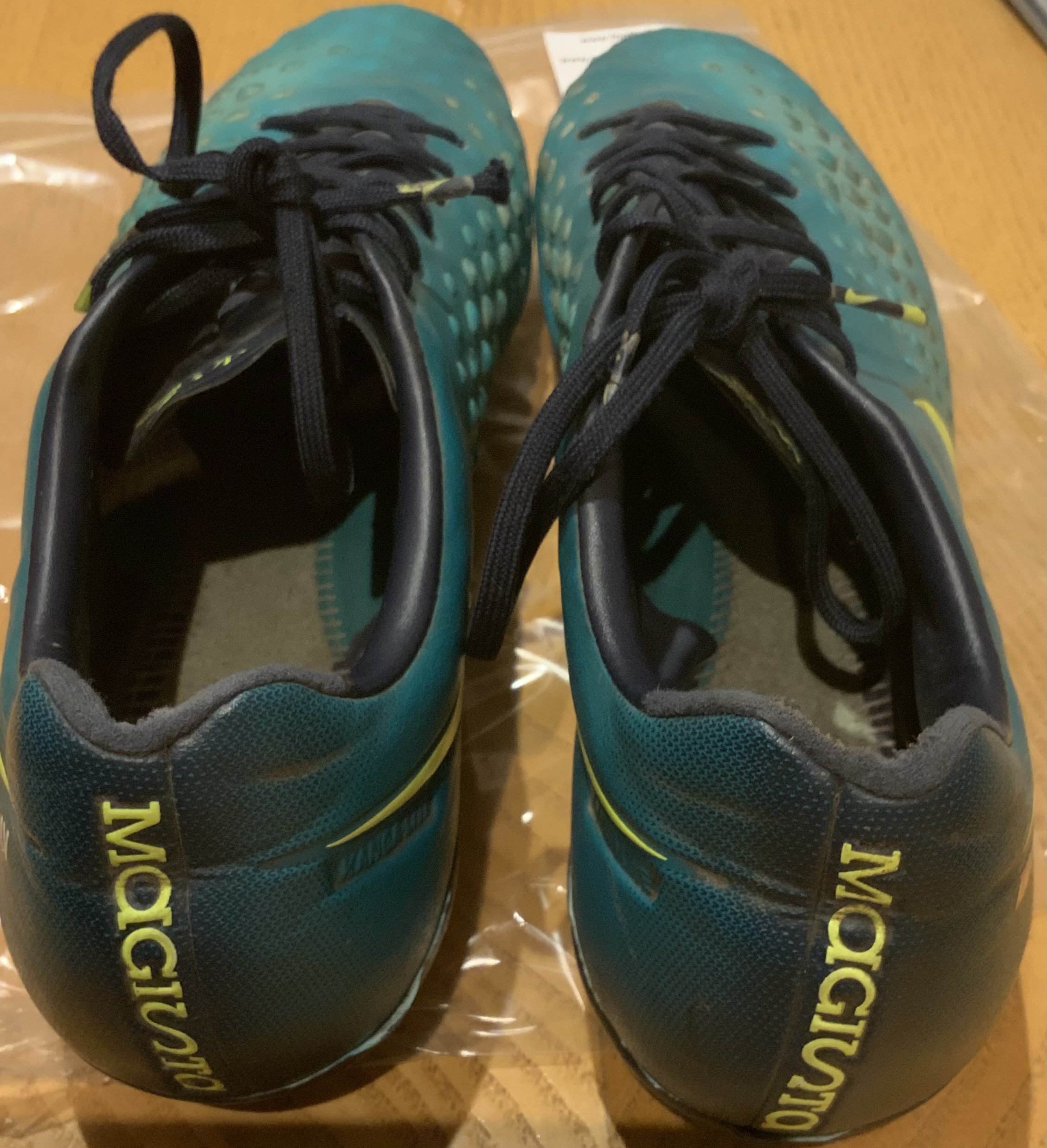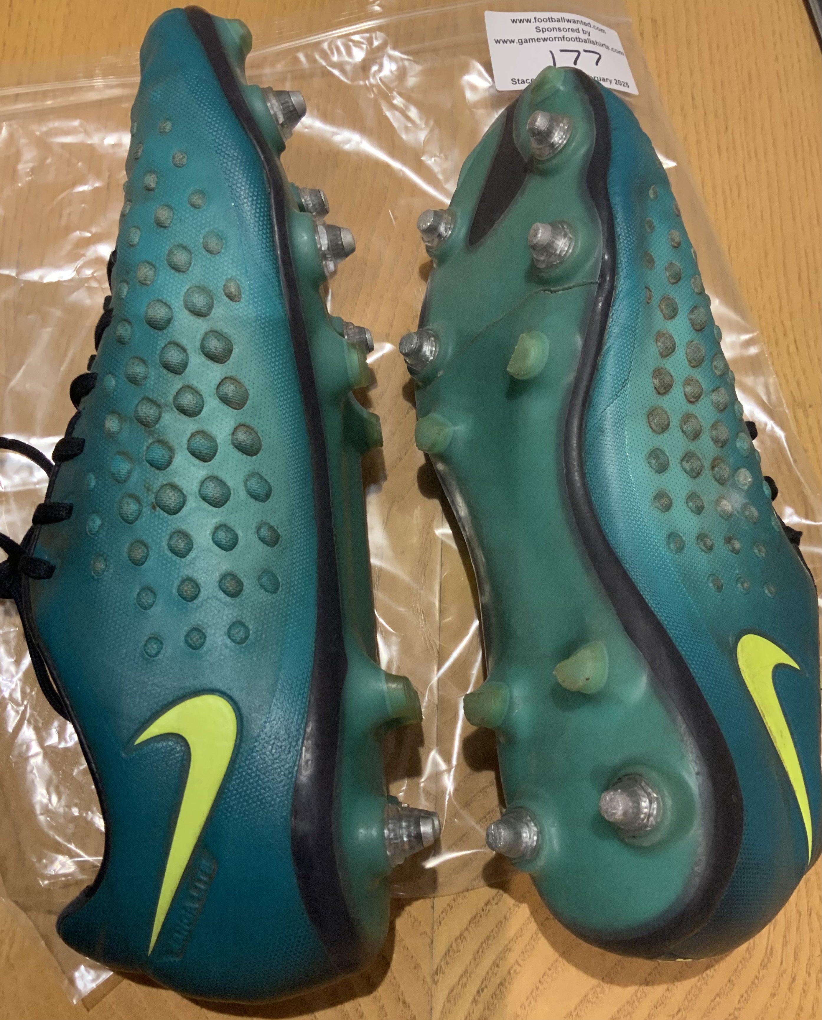 Middlesbrough + Spain Victor Valdes Match Worn Football Boots: Nike Magista. Sole of right boot is split. VV embroidered onto both boots which also have Spanish flag.