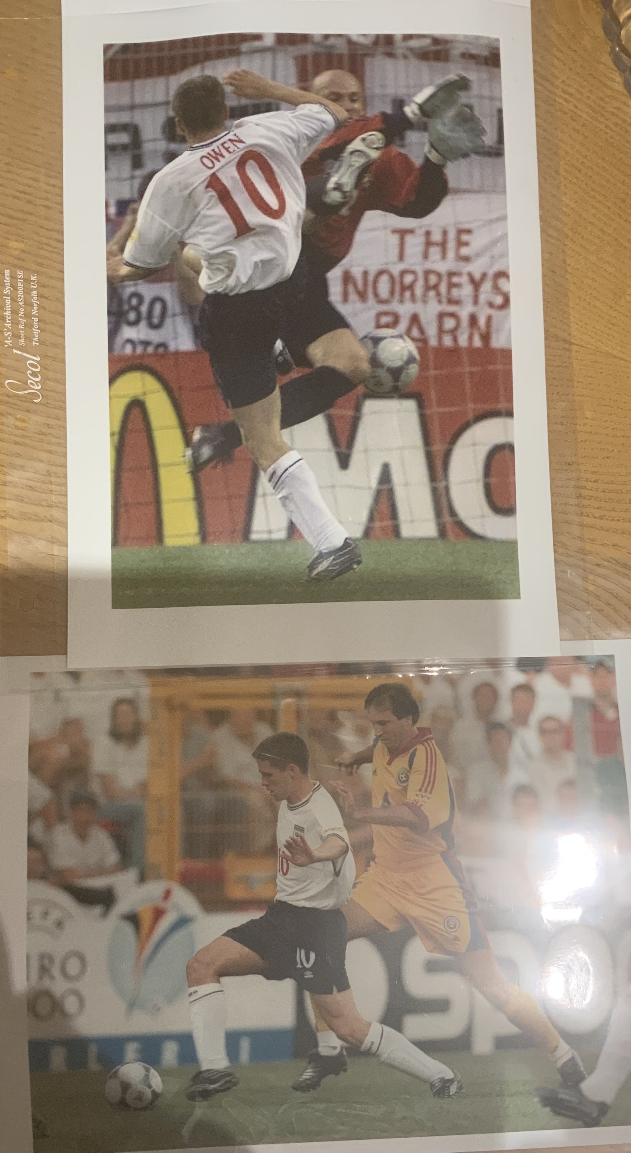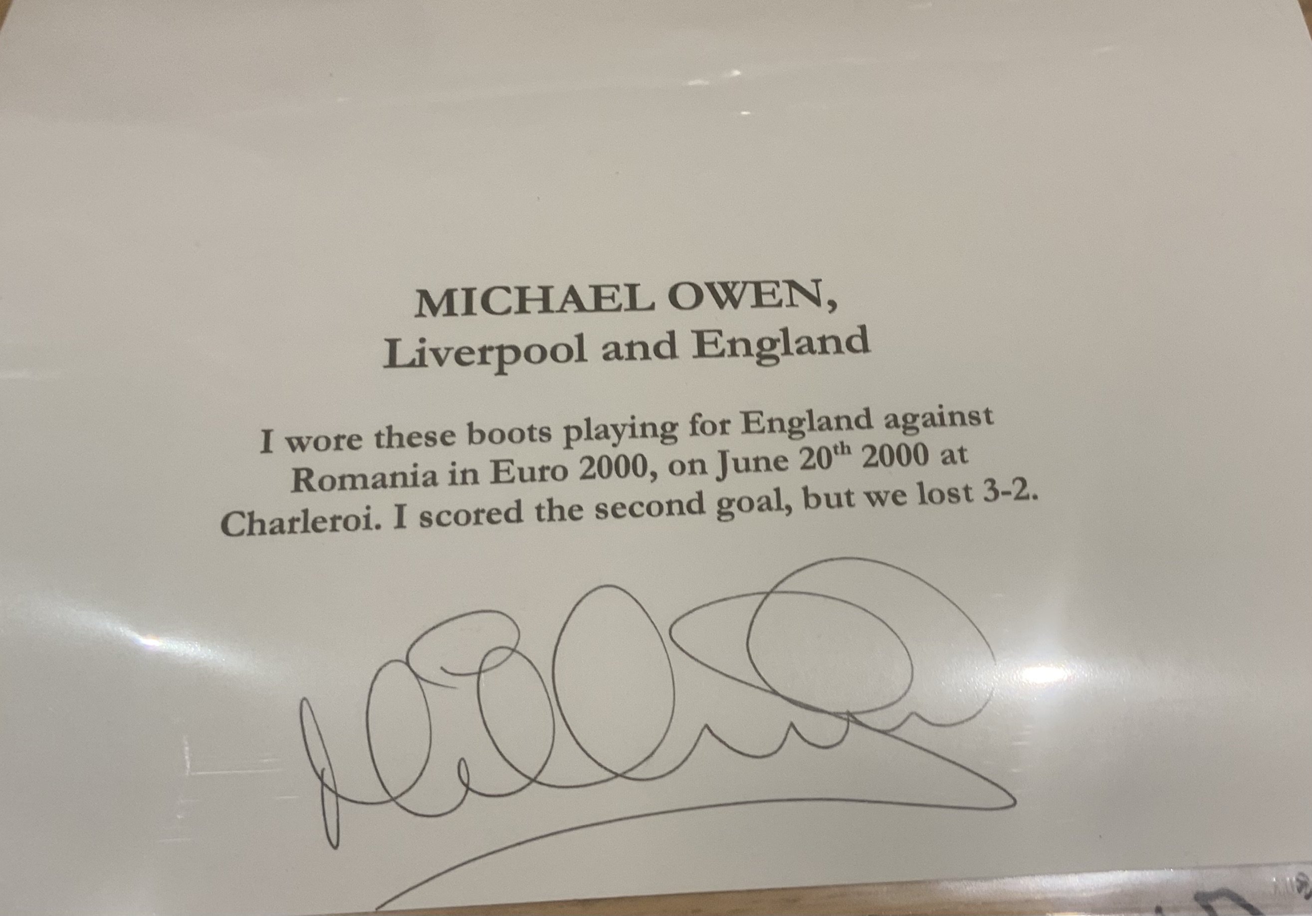 England Match Worn Michael Owen Football Boots: COA signed by player without dedication. Includes two press photos of Owen wearing the boots in Euro 2000 v Rumania.