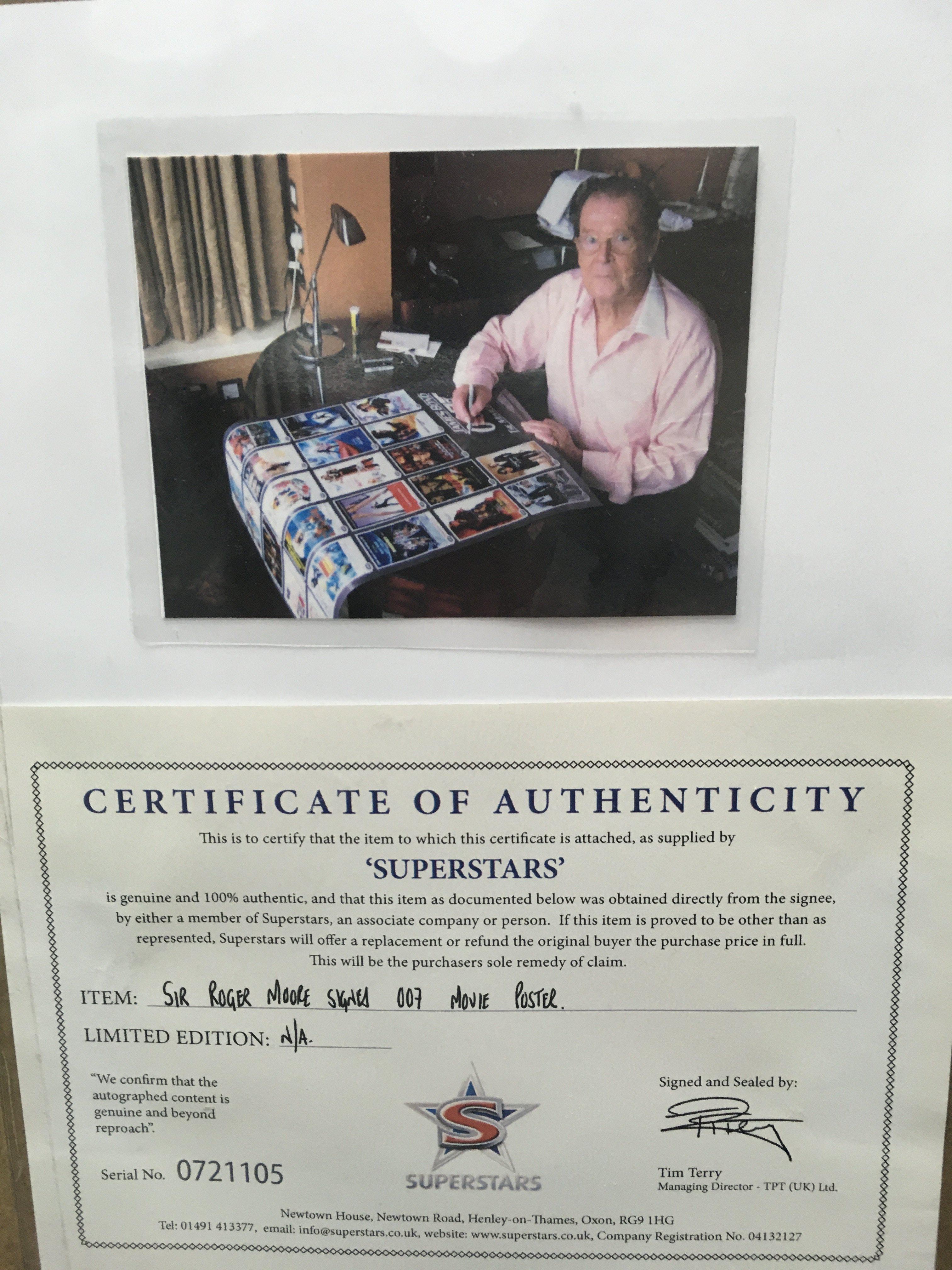 A James Bond posted framed and signed Roger Moore with COA and photo proof. Frame size 65x86cm This lot cannot be posted