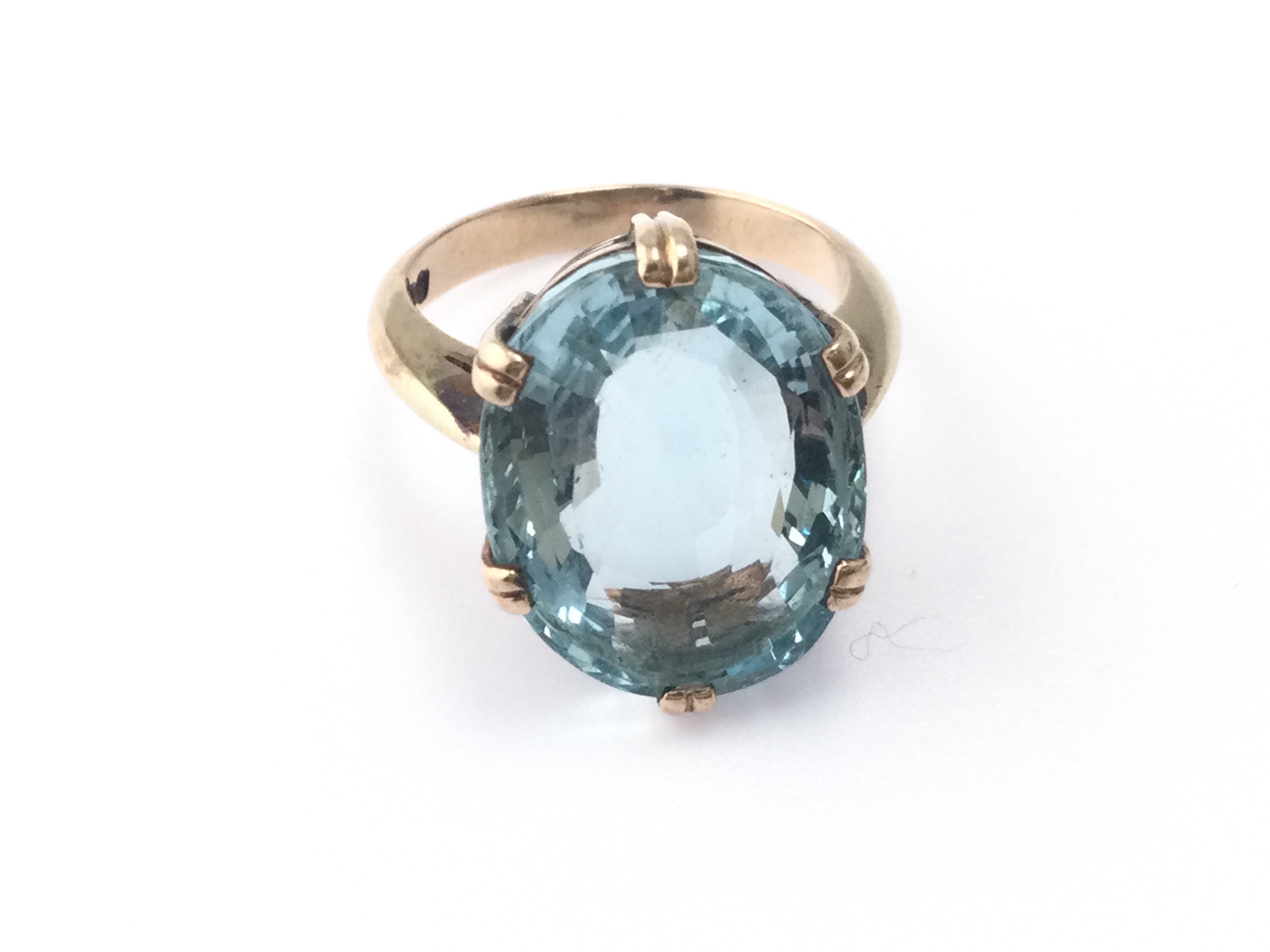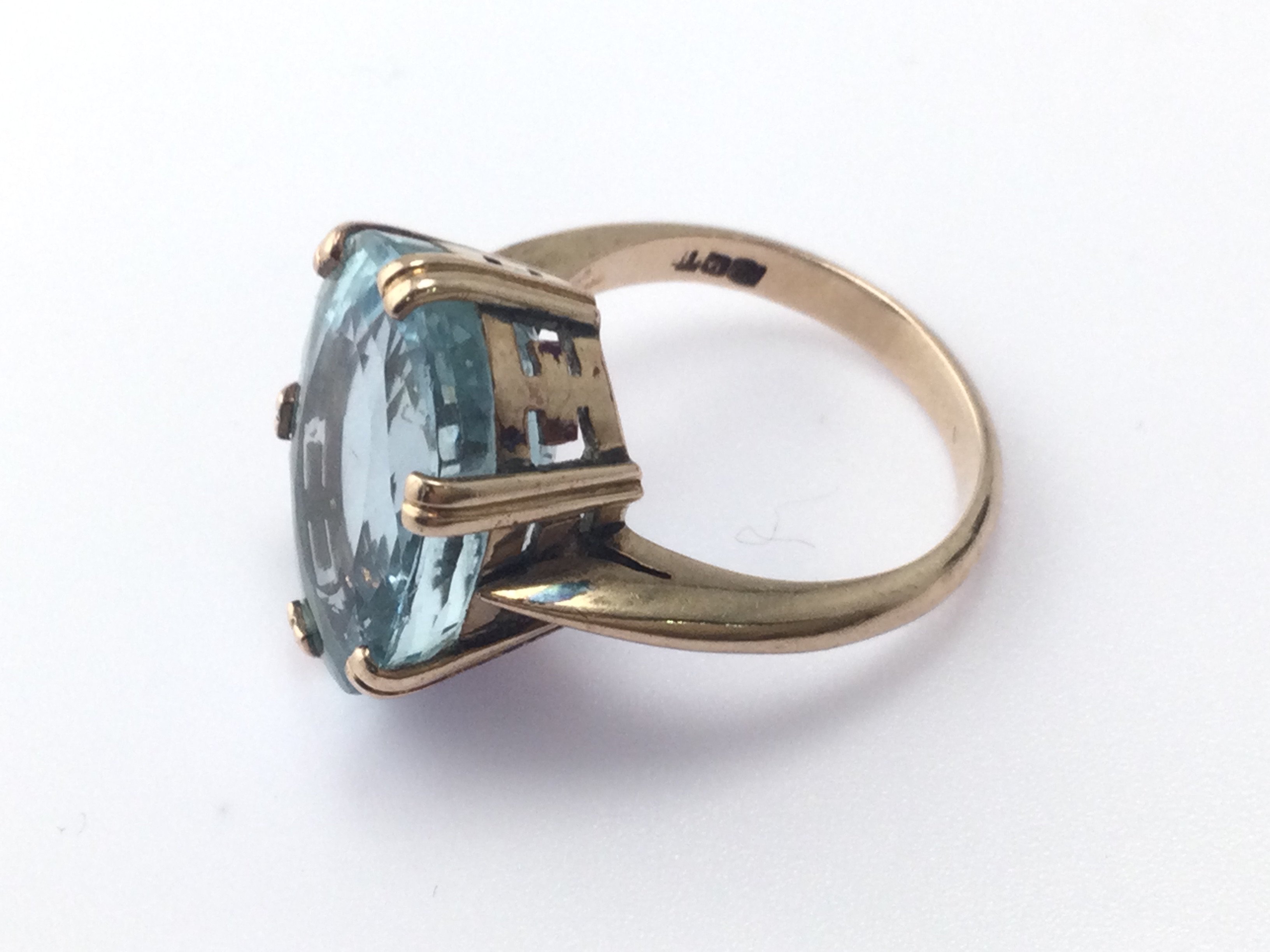 A 9ct larg oval cut aquamarine ring. Size J 1/2 and 5.89g Postage a