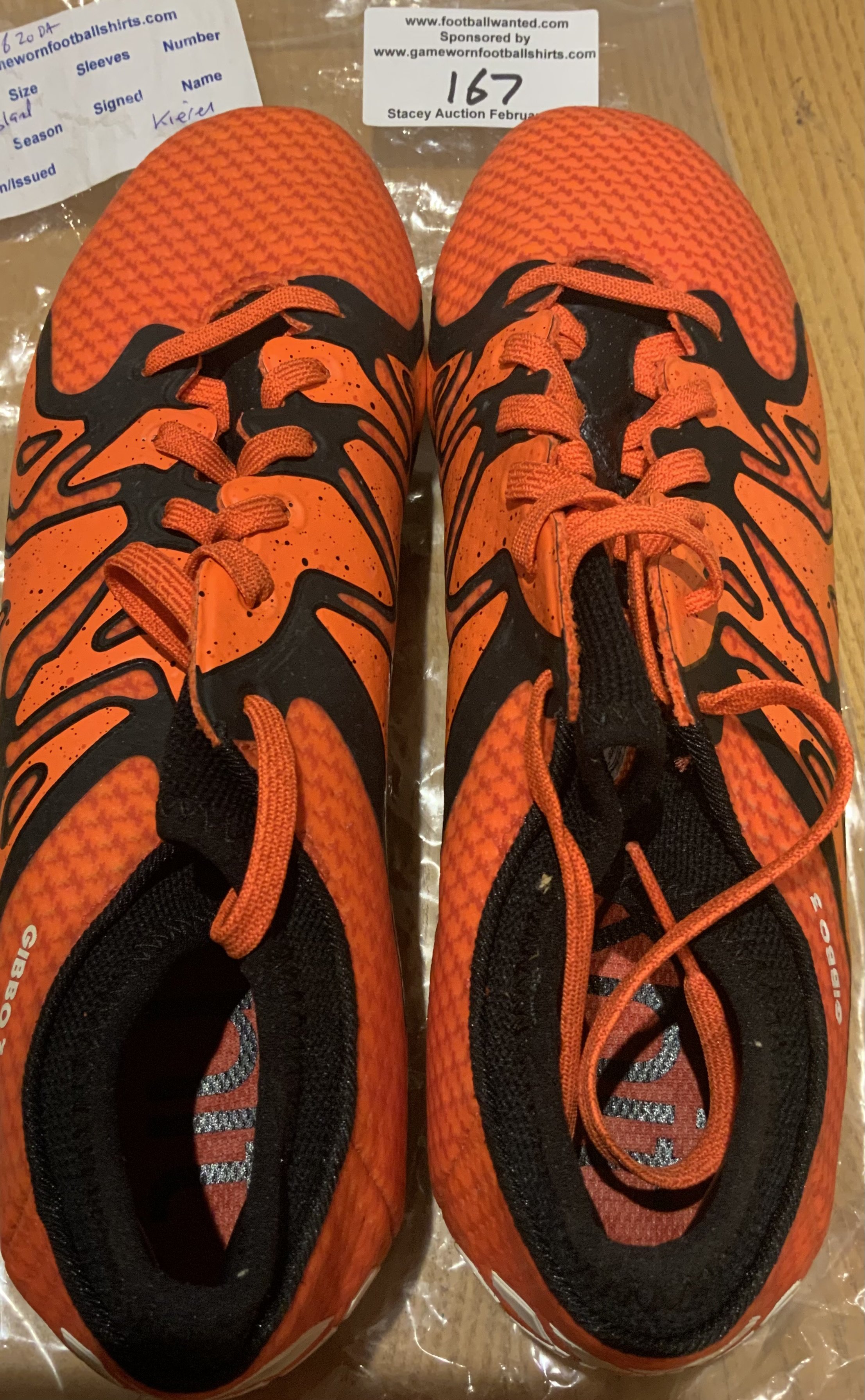 Arsenal Match Worn Kieran Gibbs Football Boots: Pair of orange Adidas boots both having Gibbo 3 transferred to side.