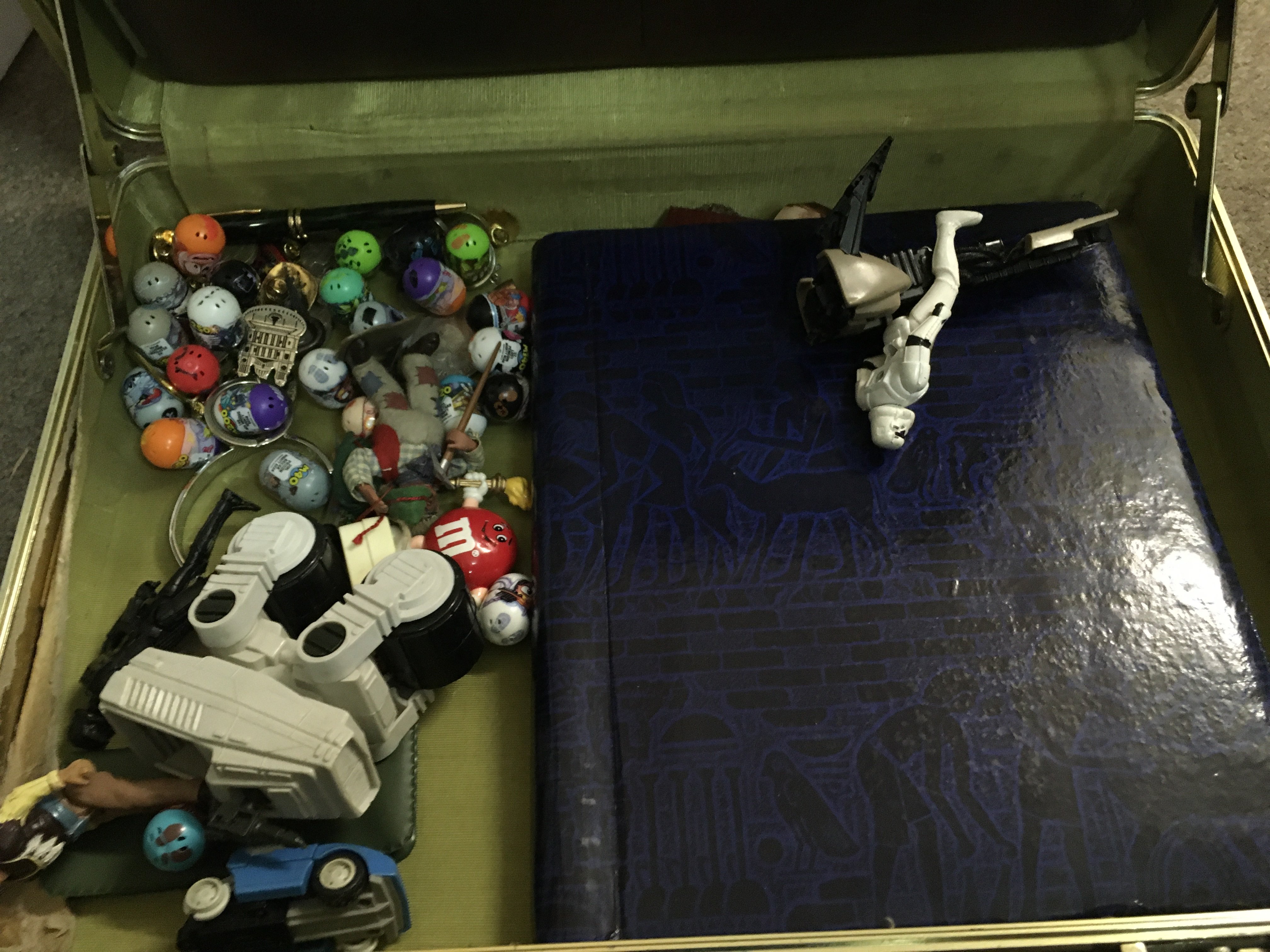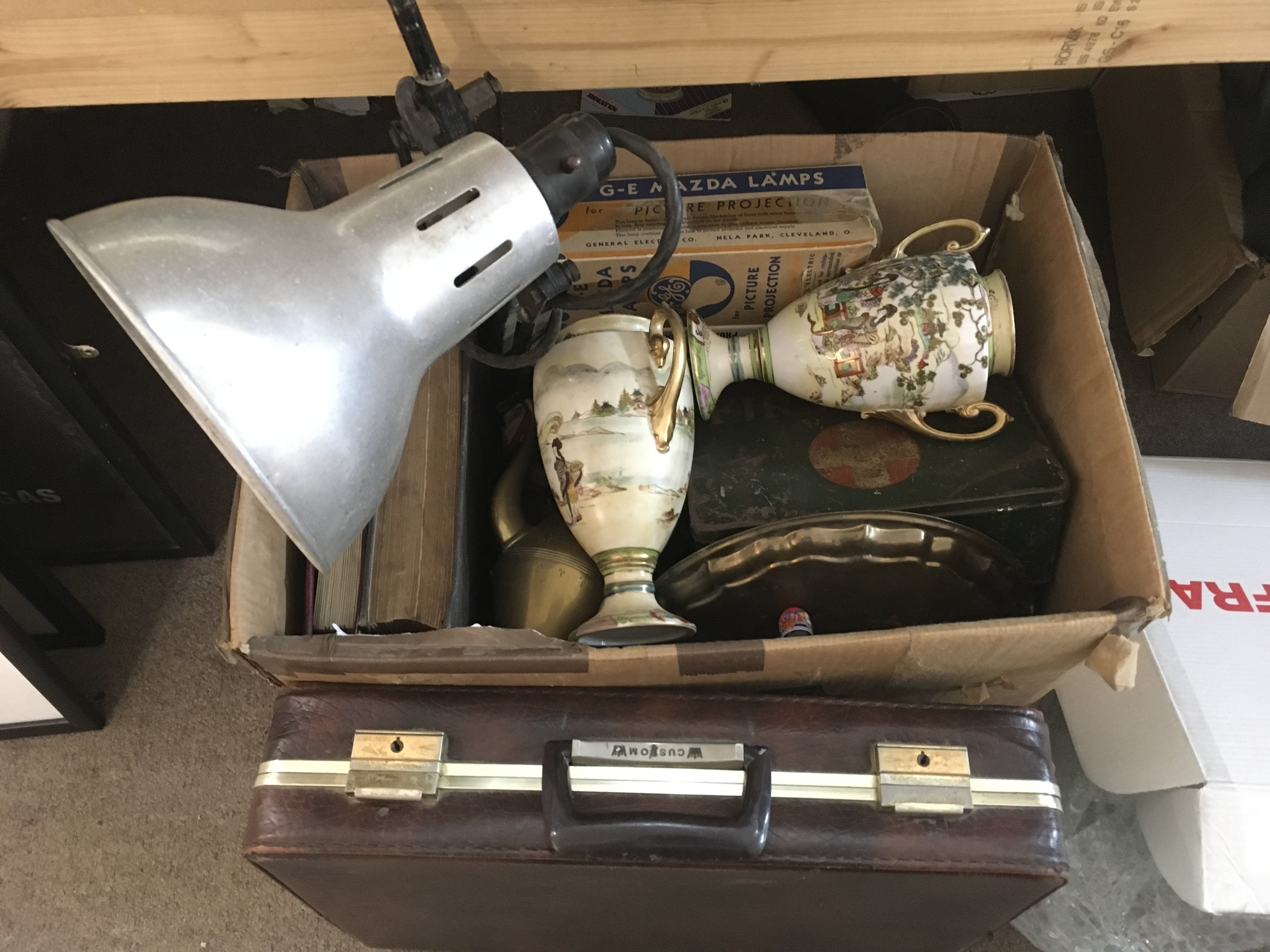 Assorted oddments including a projector, bulbs, briefcase with toys, documents. This lot cannot be posted