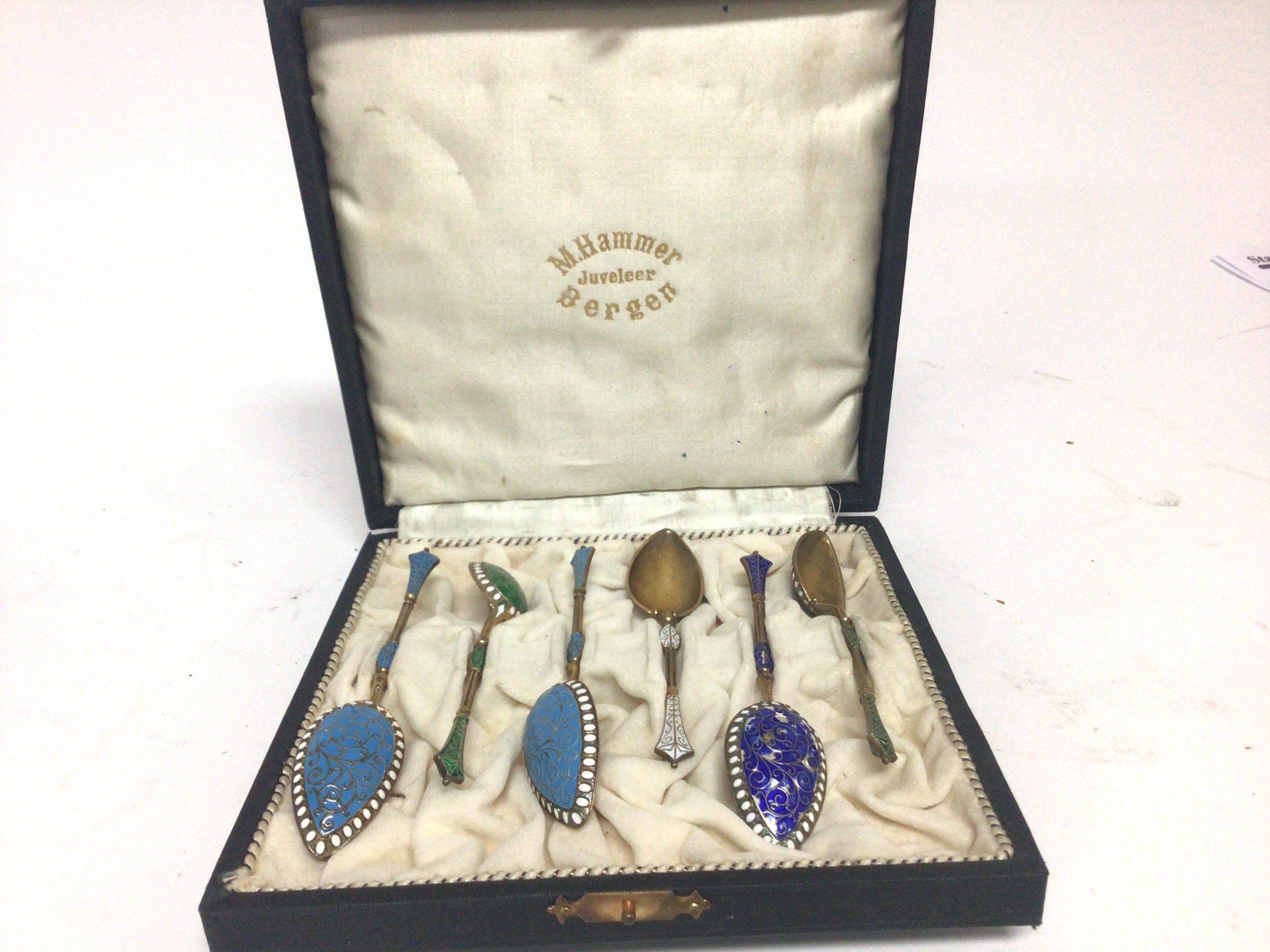 A cased set of six coloured enamel and silver Norwegian teaspoons spoons