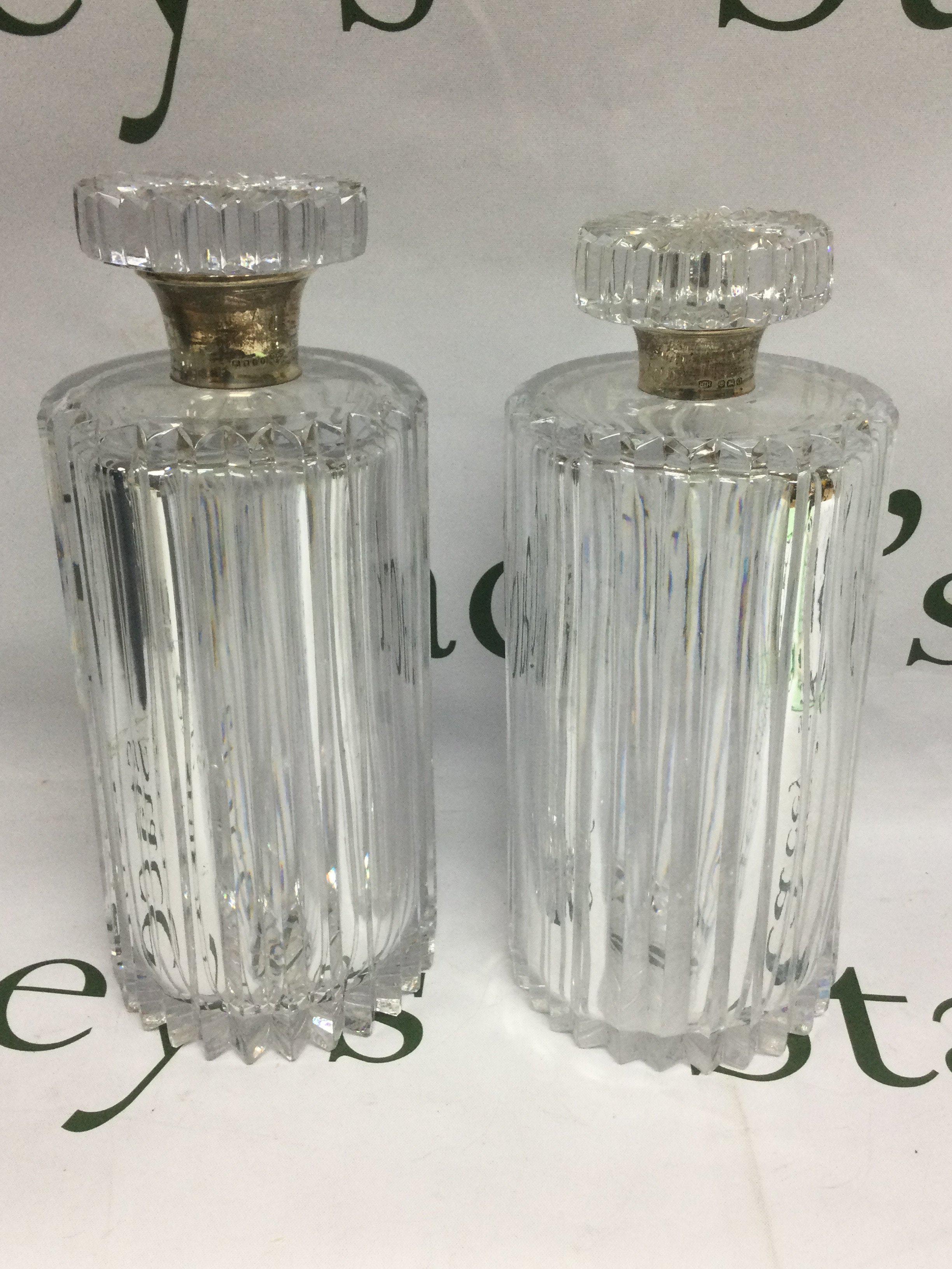 Two silver collared glass decanters of modernist form, tallest approx 23.5cm. Shipping category D.