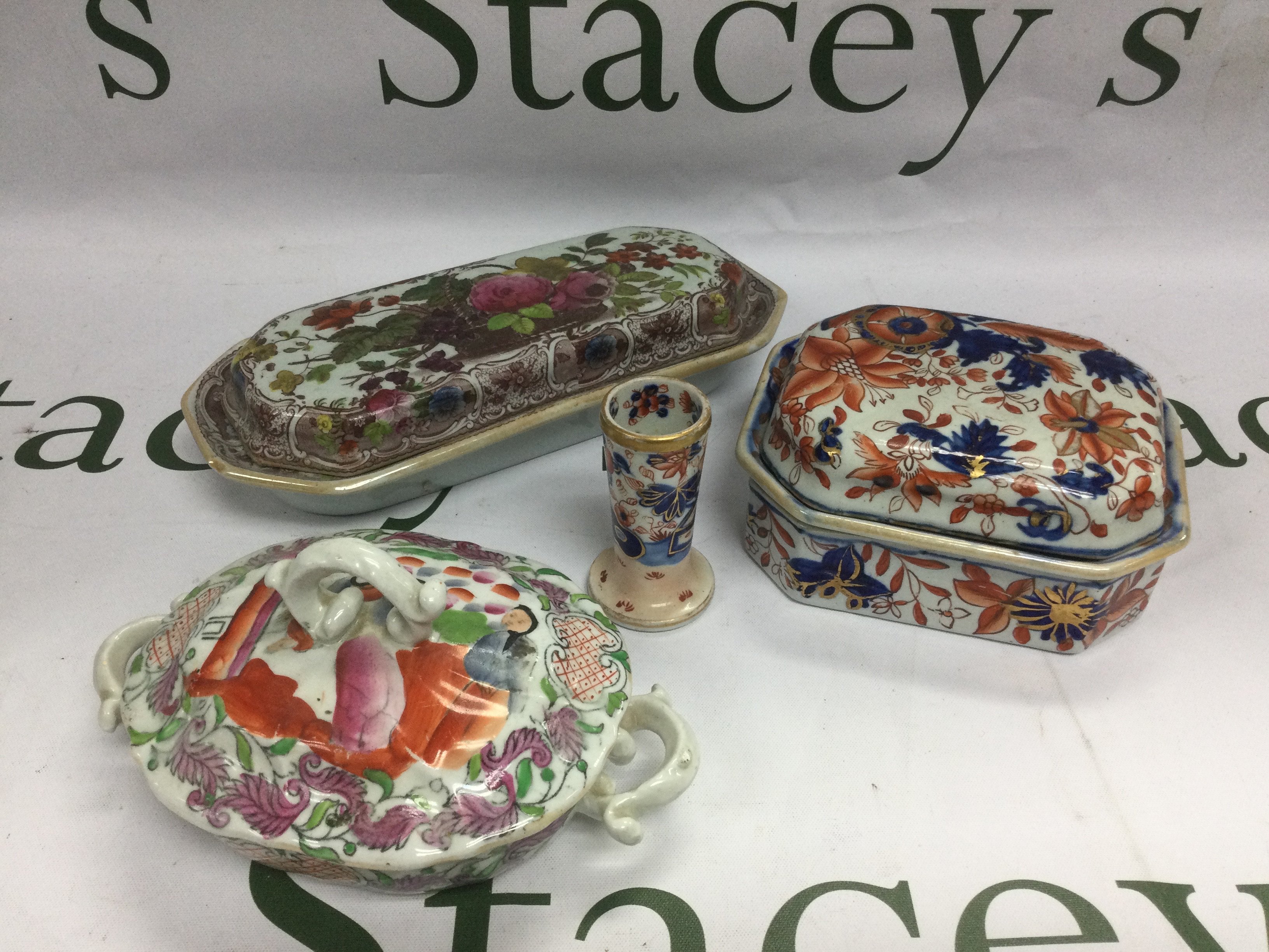 A Mason's ironstone imari soap dish plus two others and a bud vase (4). Shipping category D.