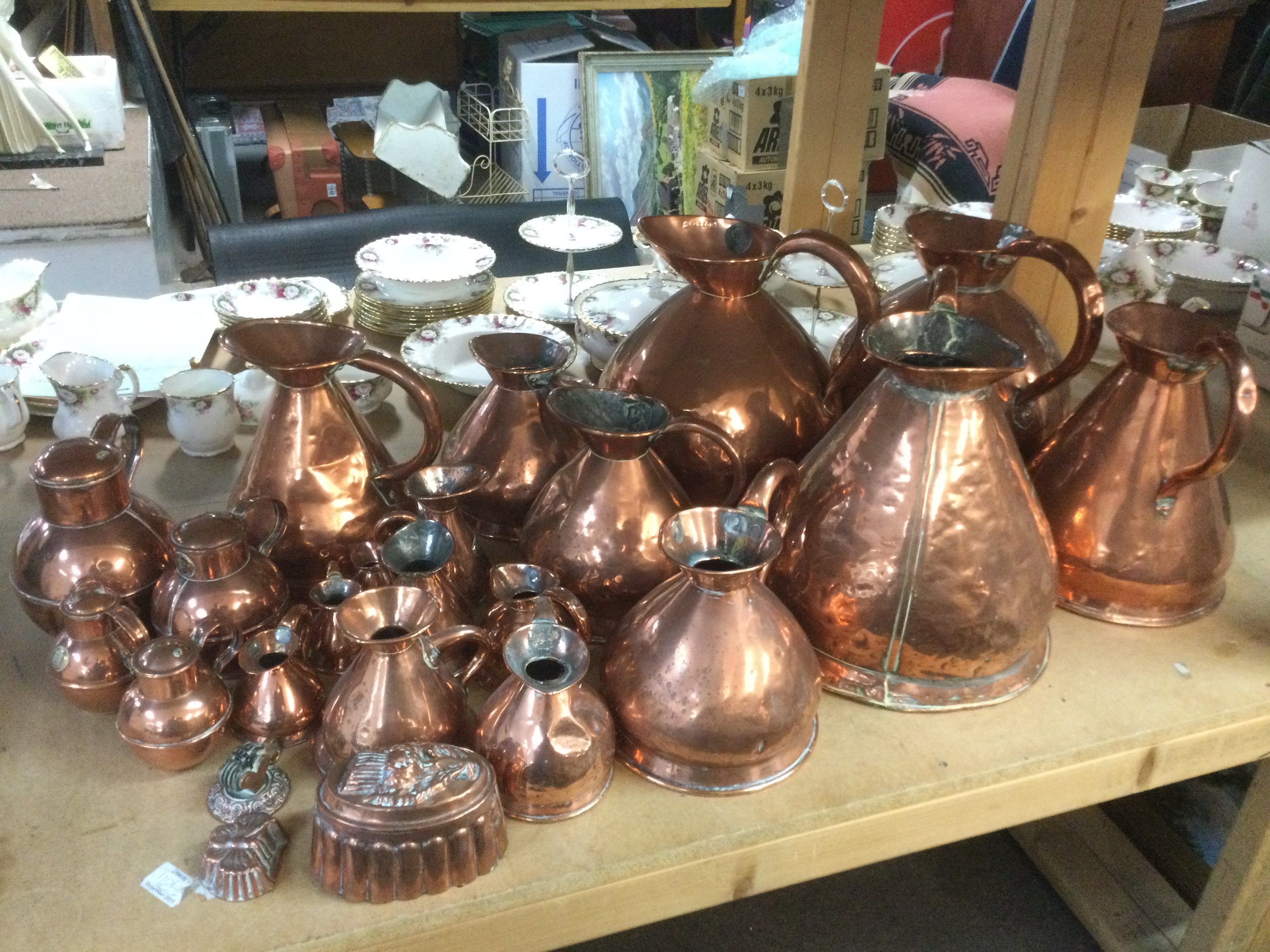 A large collection of antique copper jugs, measures, jelly moulds etc. Shipping category D.