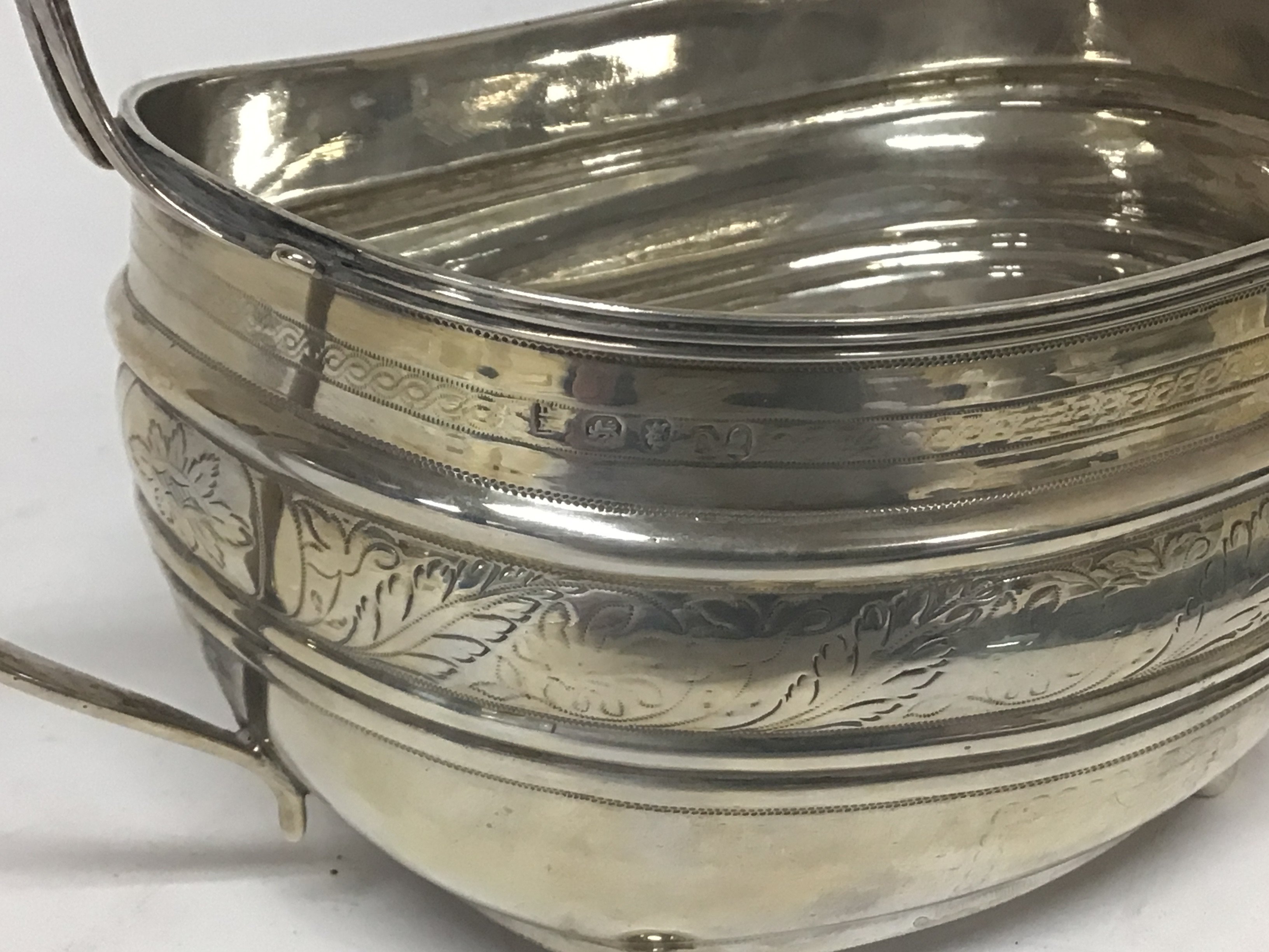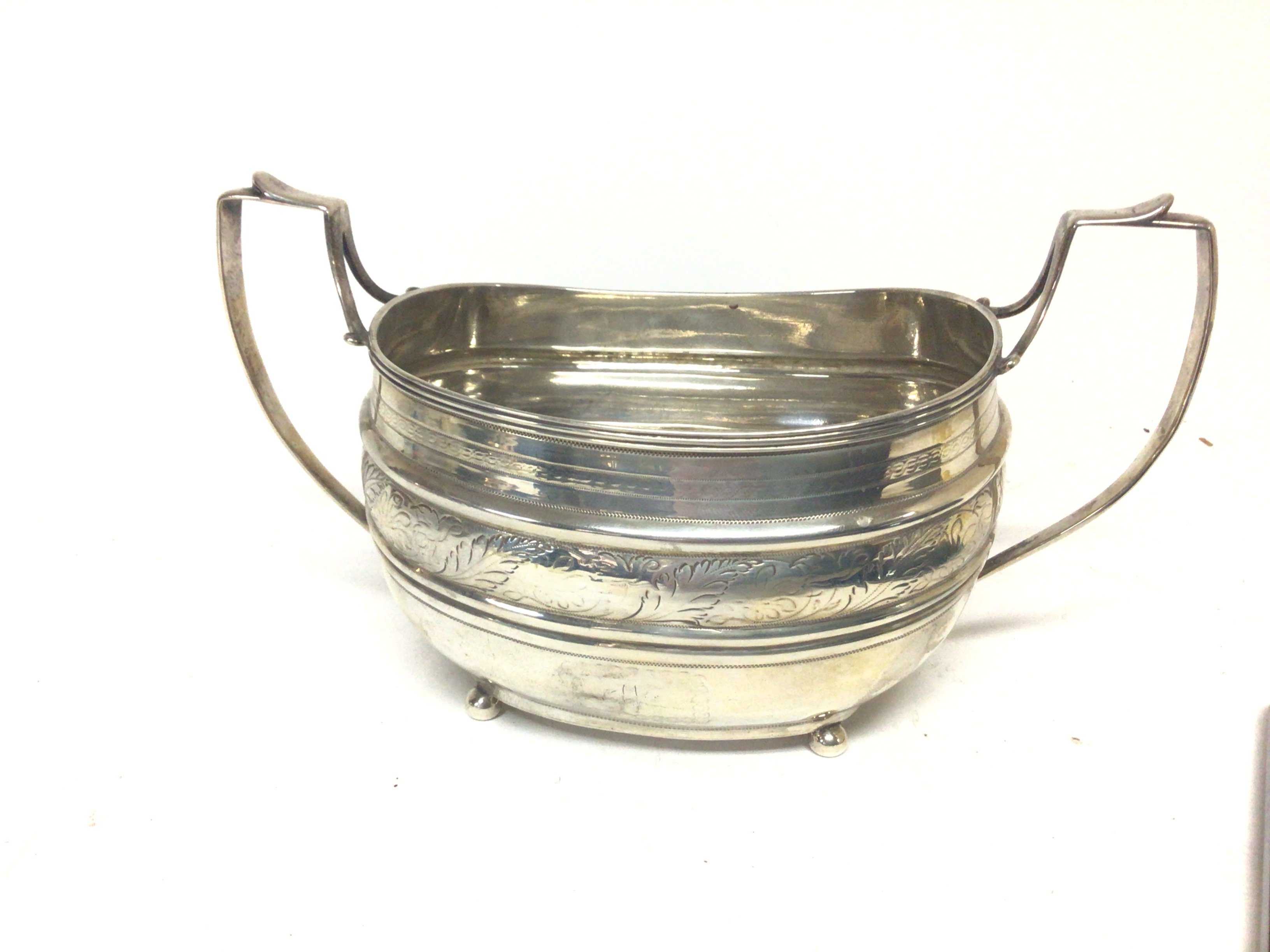 A George III silver sugar bowl London hallmarks. With raised handles and engraved floral pattern. 260g