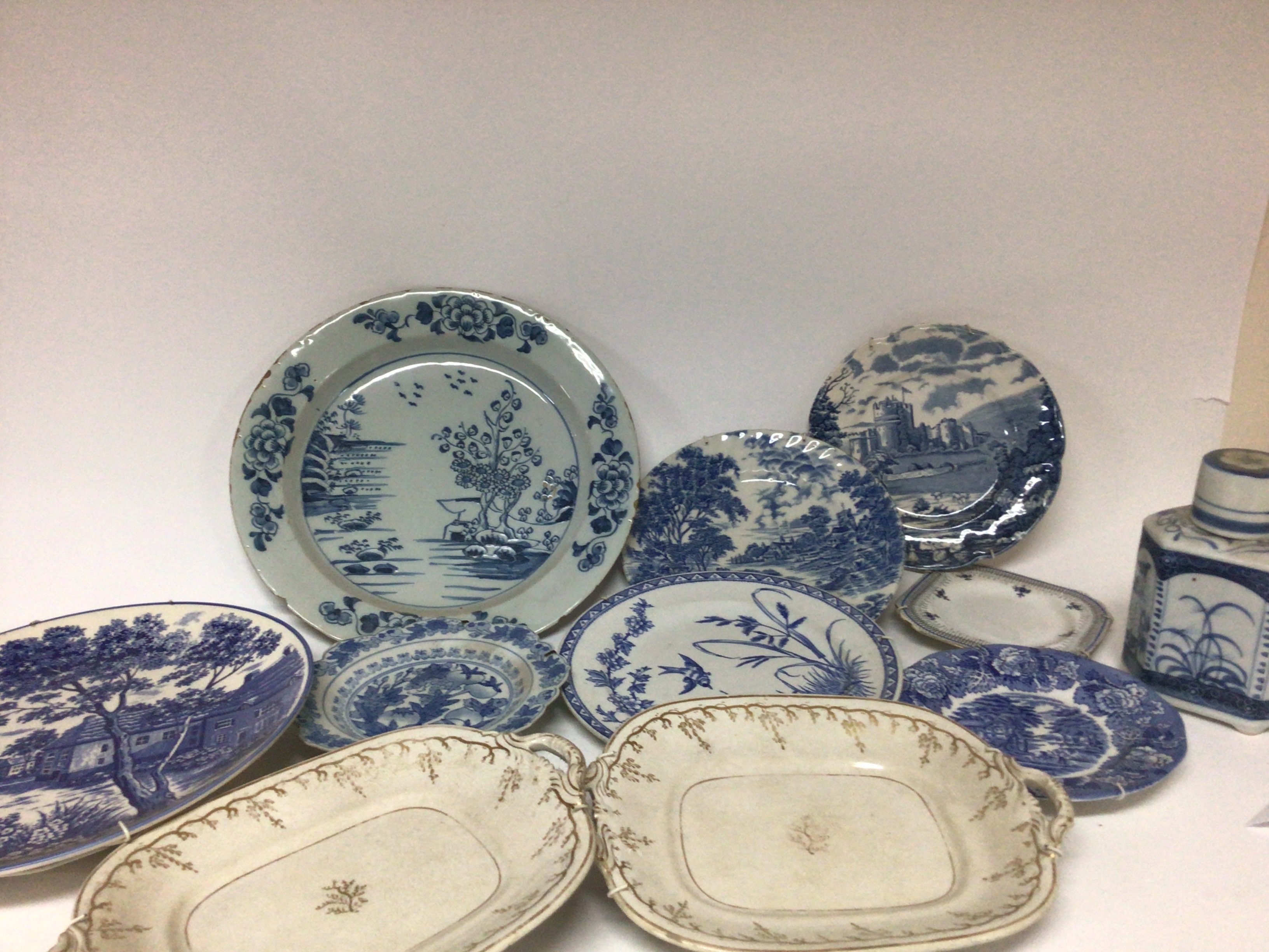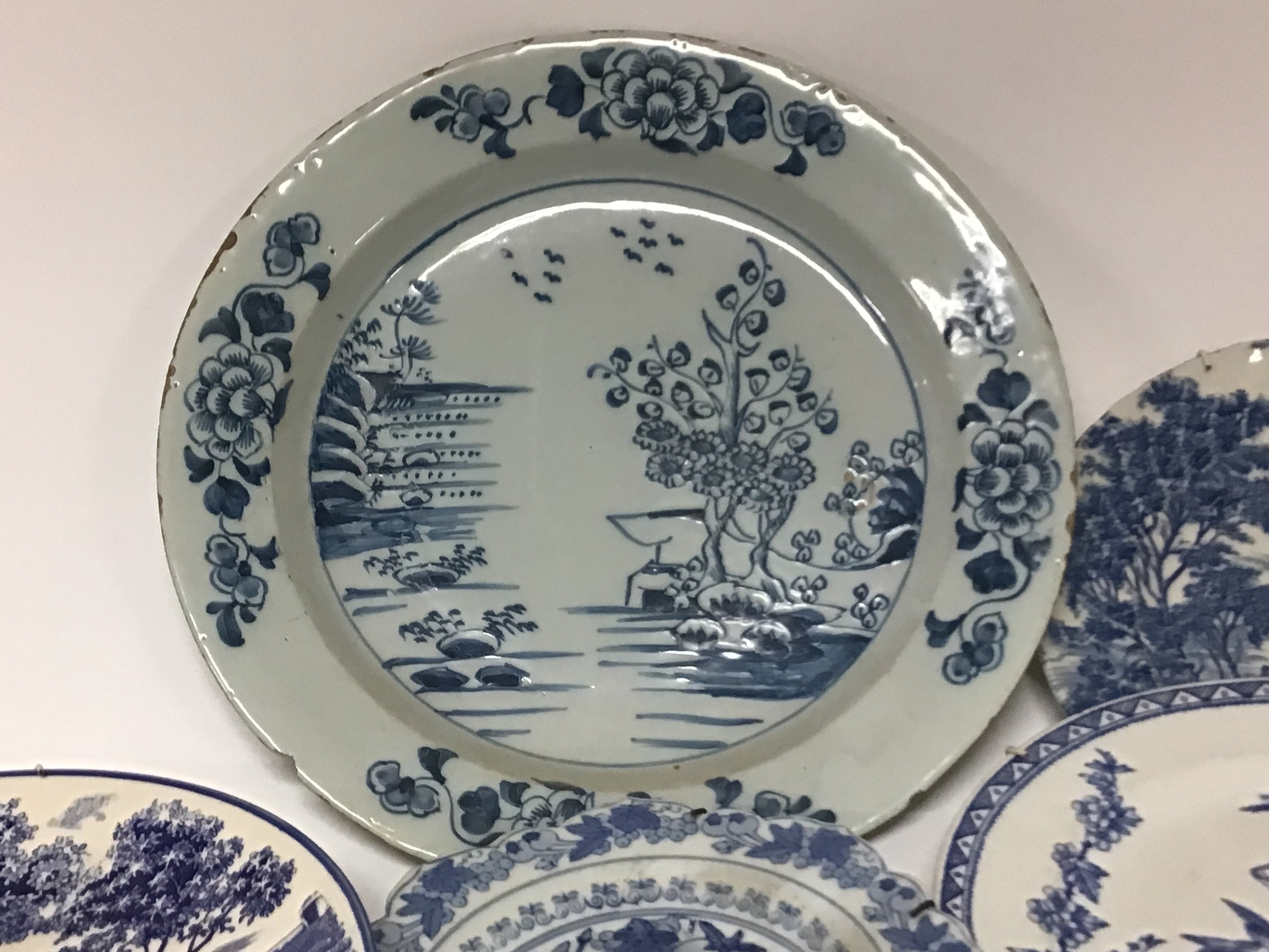 An 18th century delft plate minor chips width to the edge 35cm diameter and a collection of other blue and white plates.