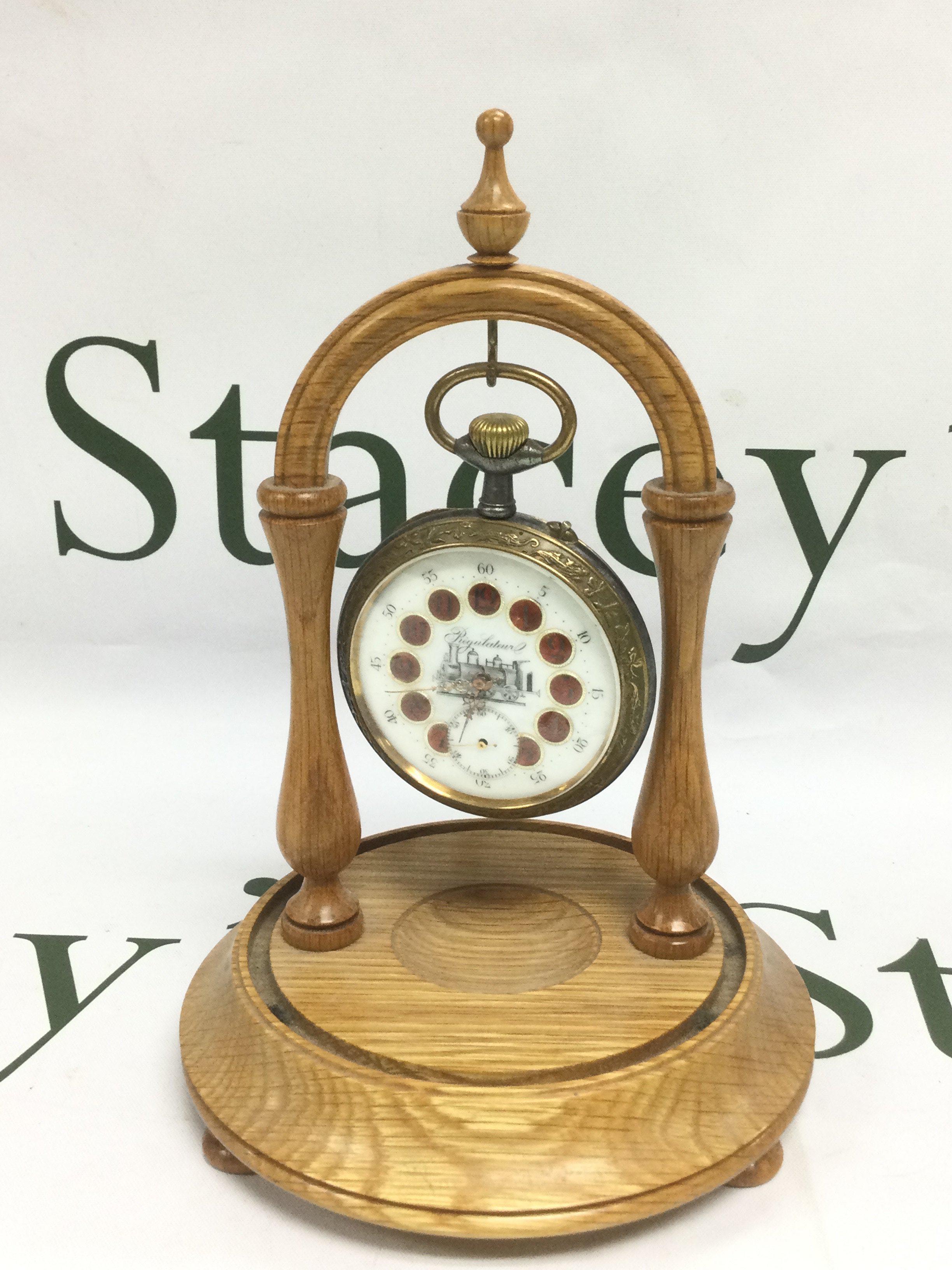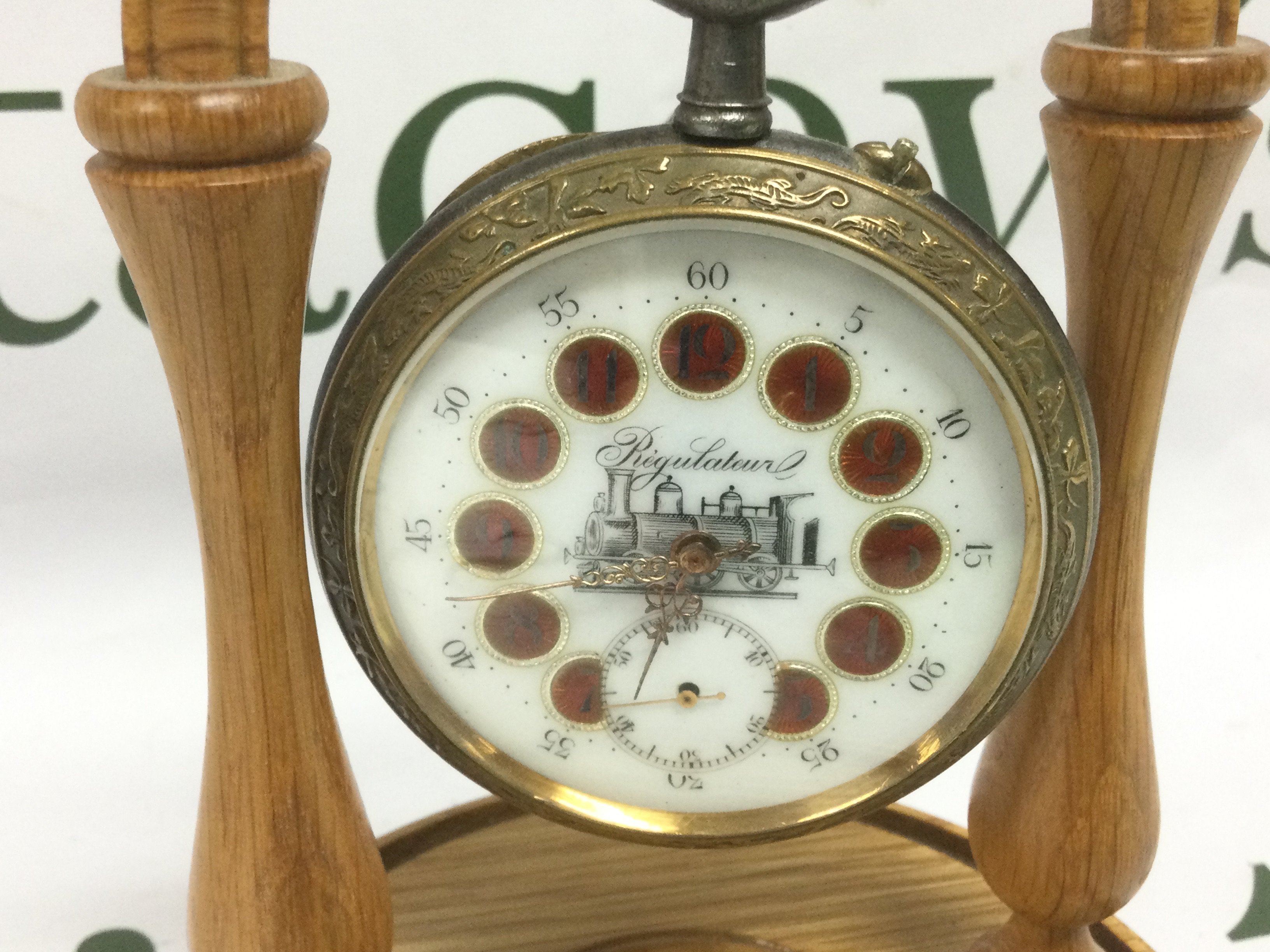 Railway interest. An oversized French brass and base metal pocket watch with decorative enamel roundels and an image of a steam train to the dial. Comes with a turned wood watch stand. Shipping category B.