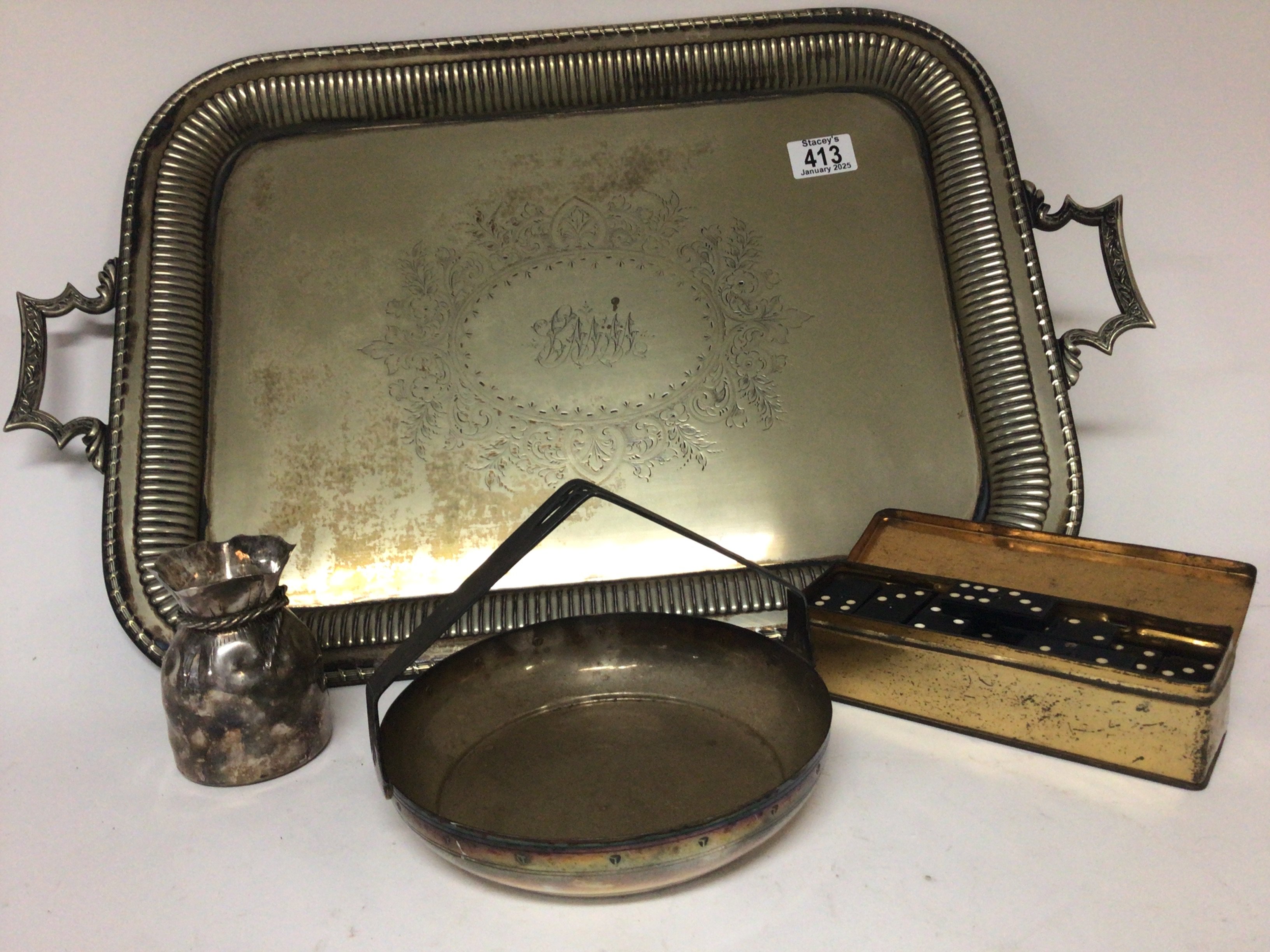 A Silver plated tea tray dominoes set and silver plated dish and vase (4)