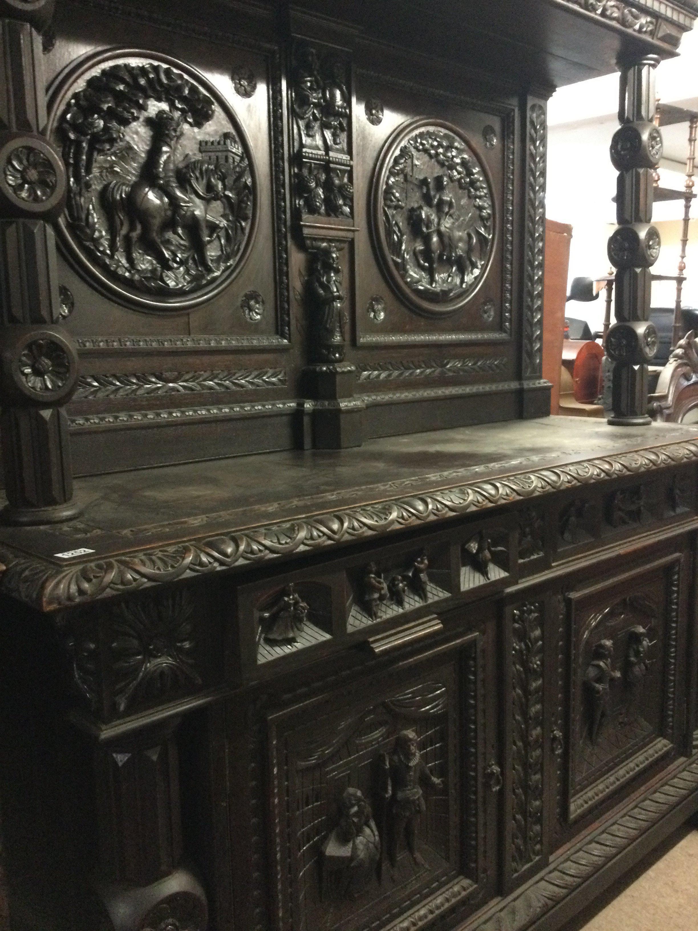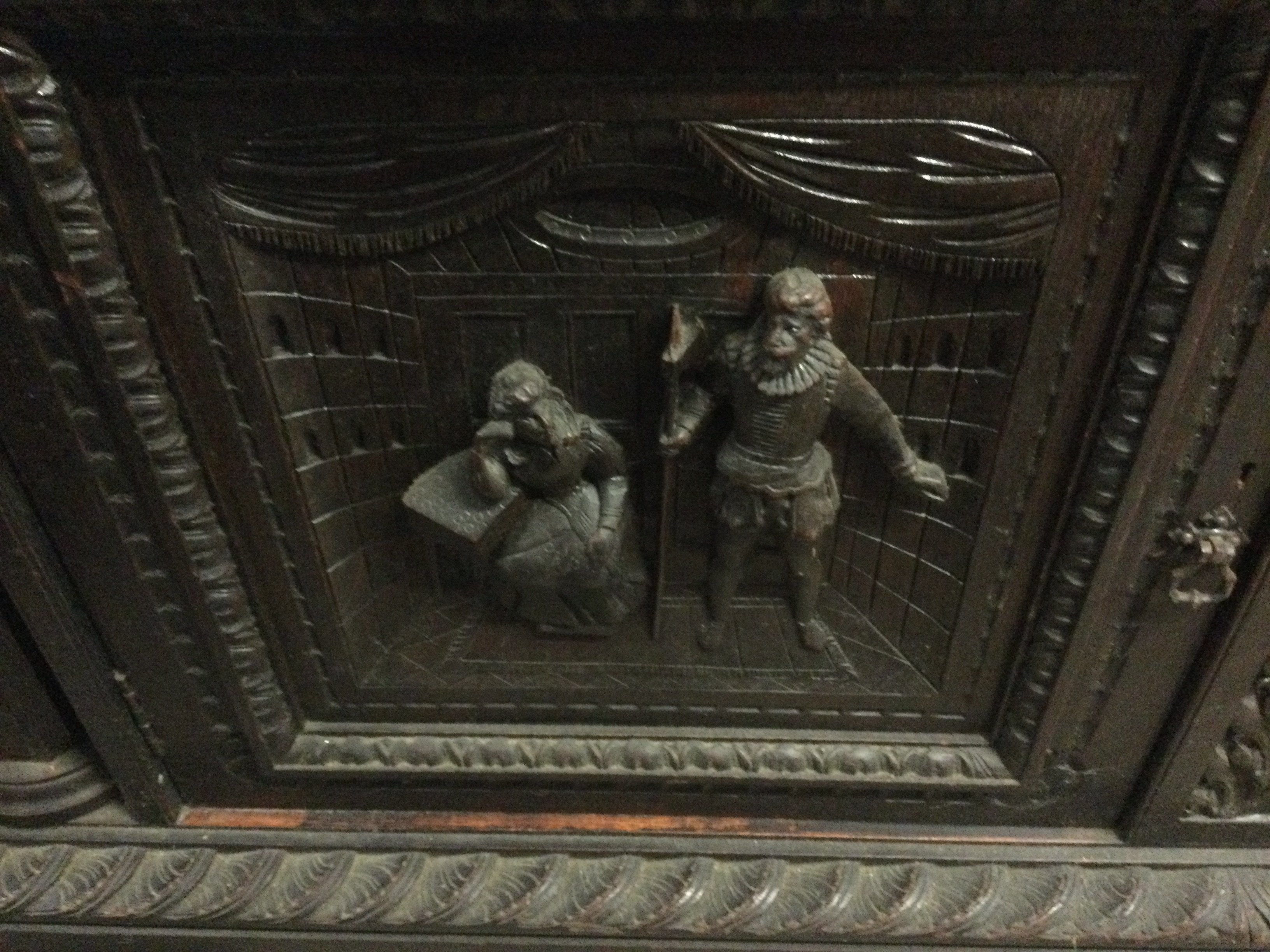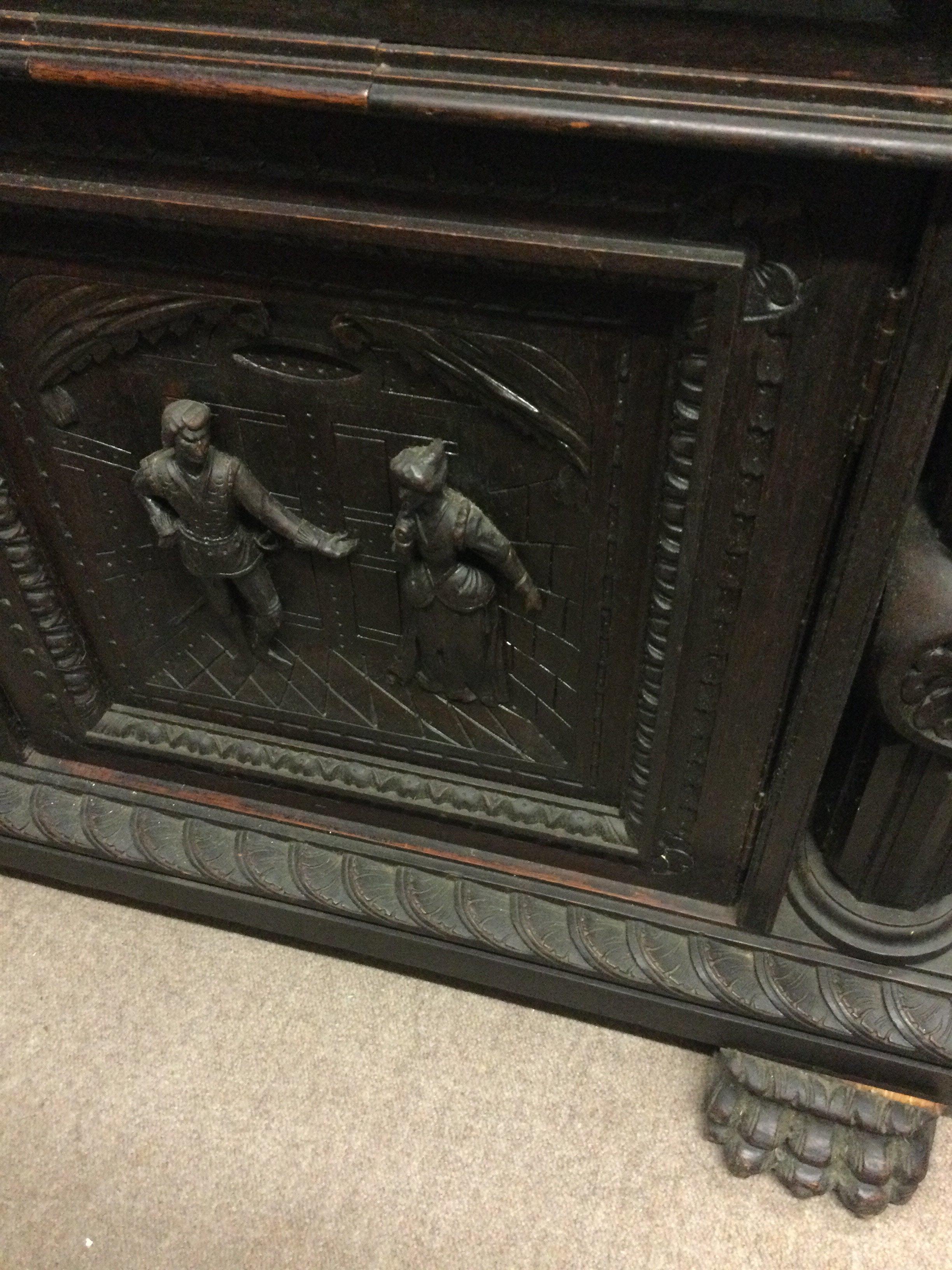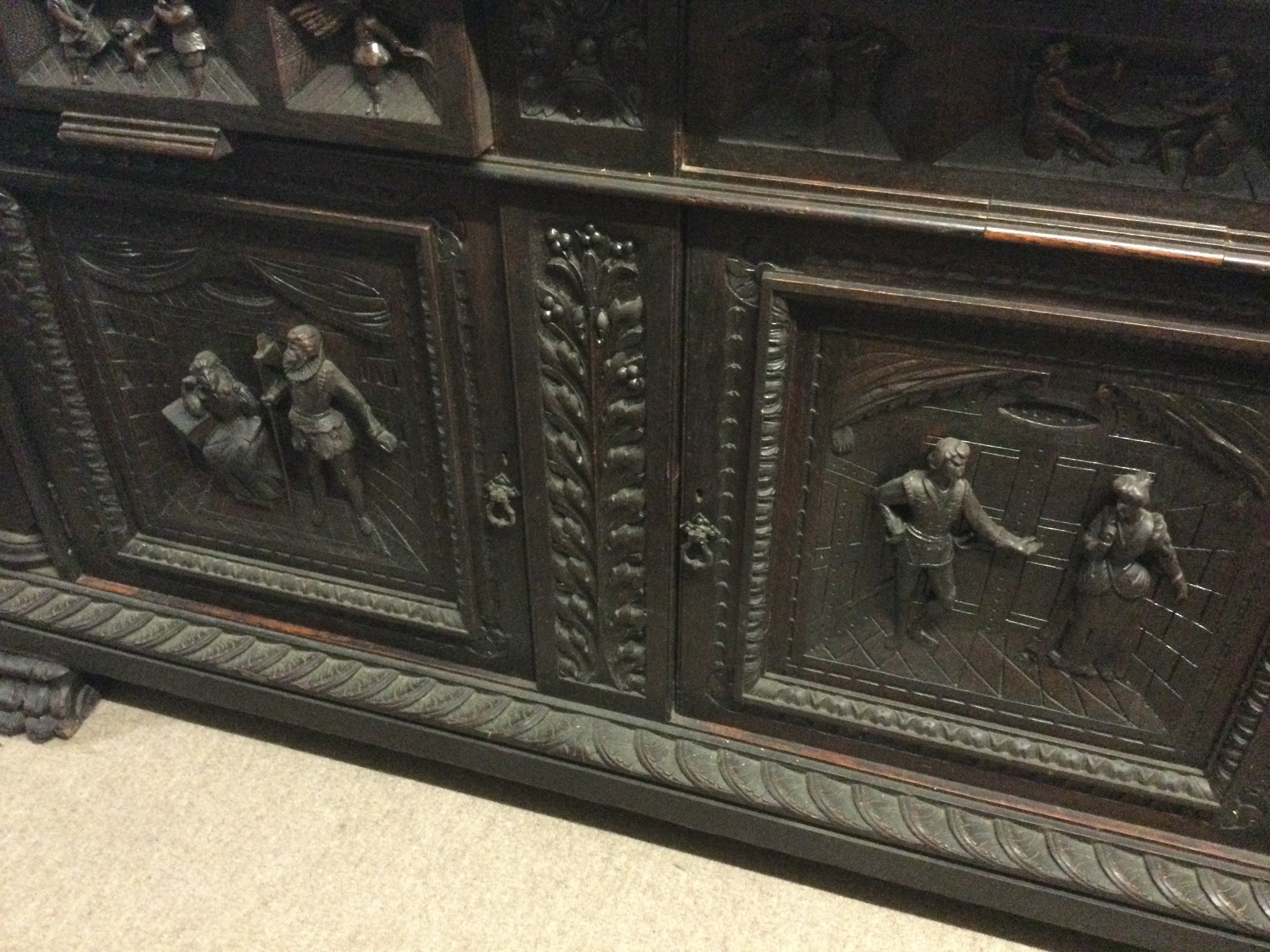 A large oak sideboard profusely carved with figures horses flower heads And foliage the raised back above two drawers and cupboards under on claw feet .245 cm x 180 cm .