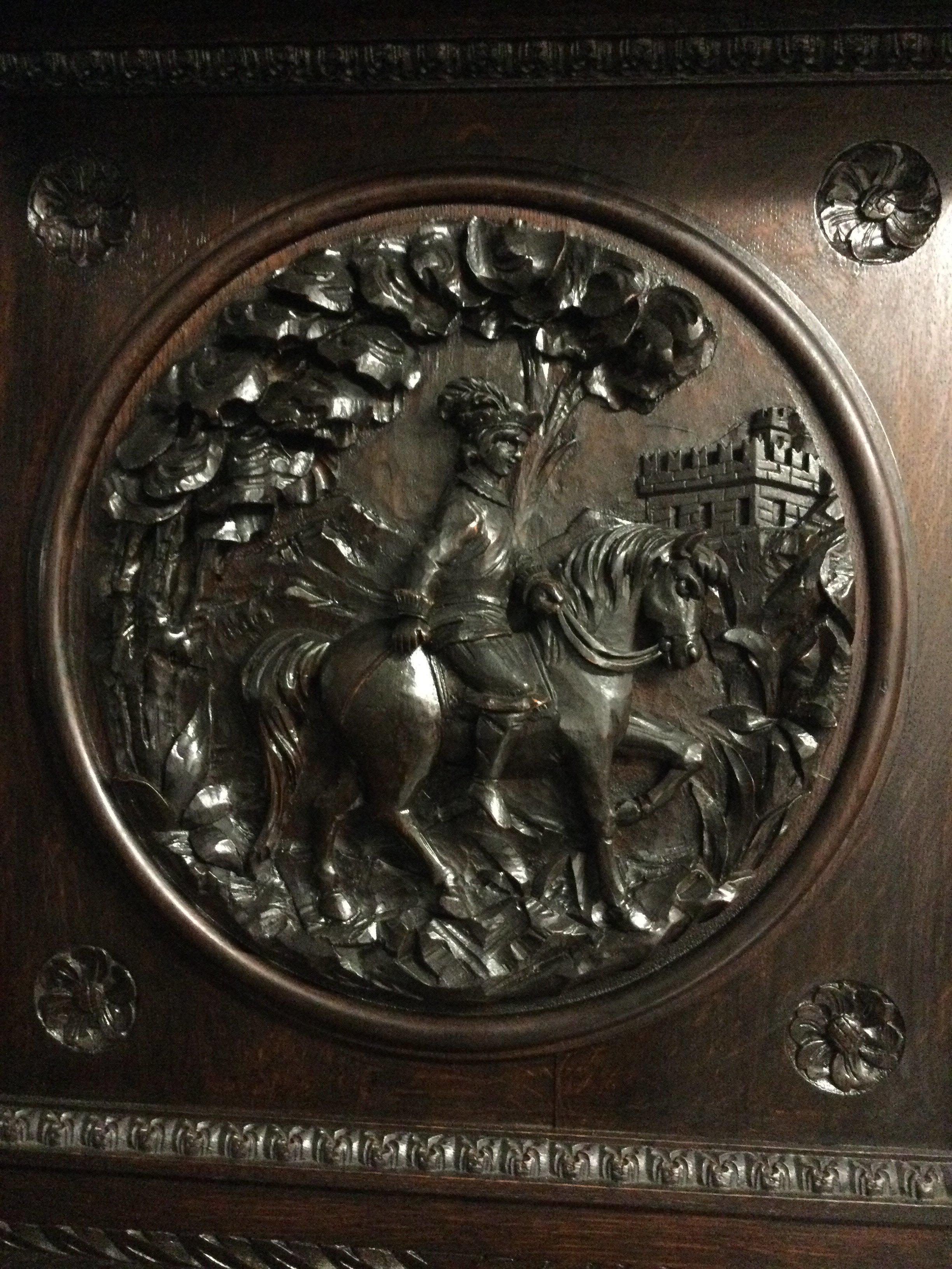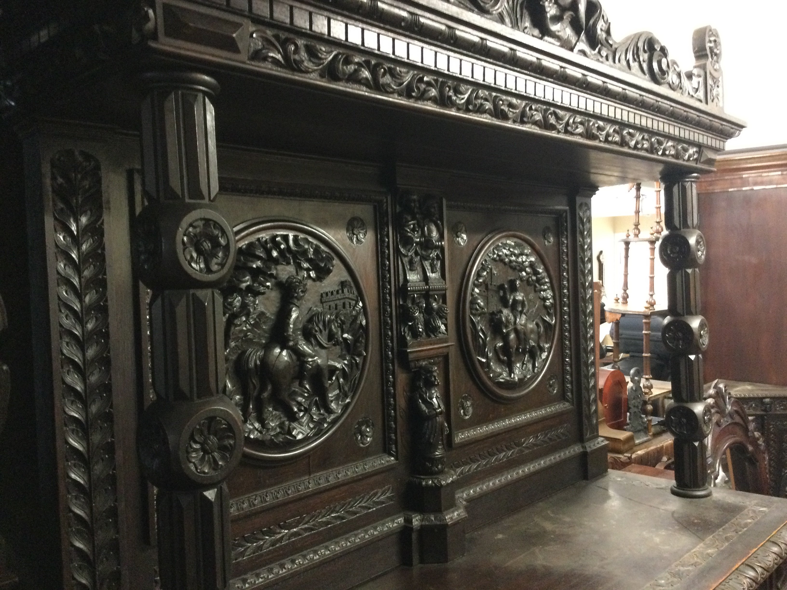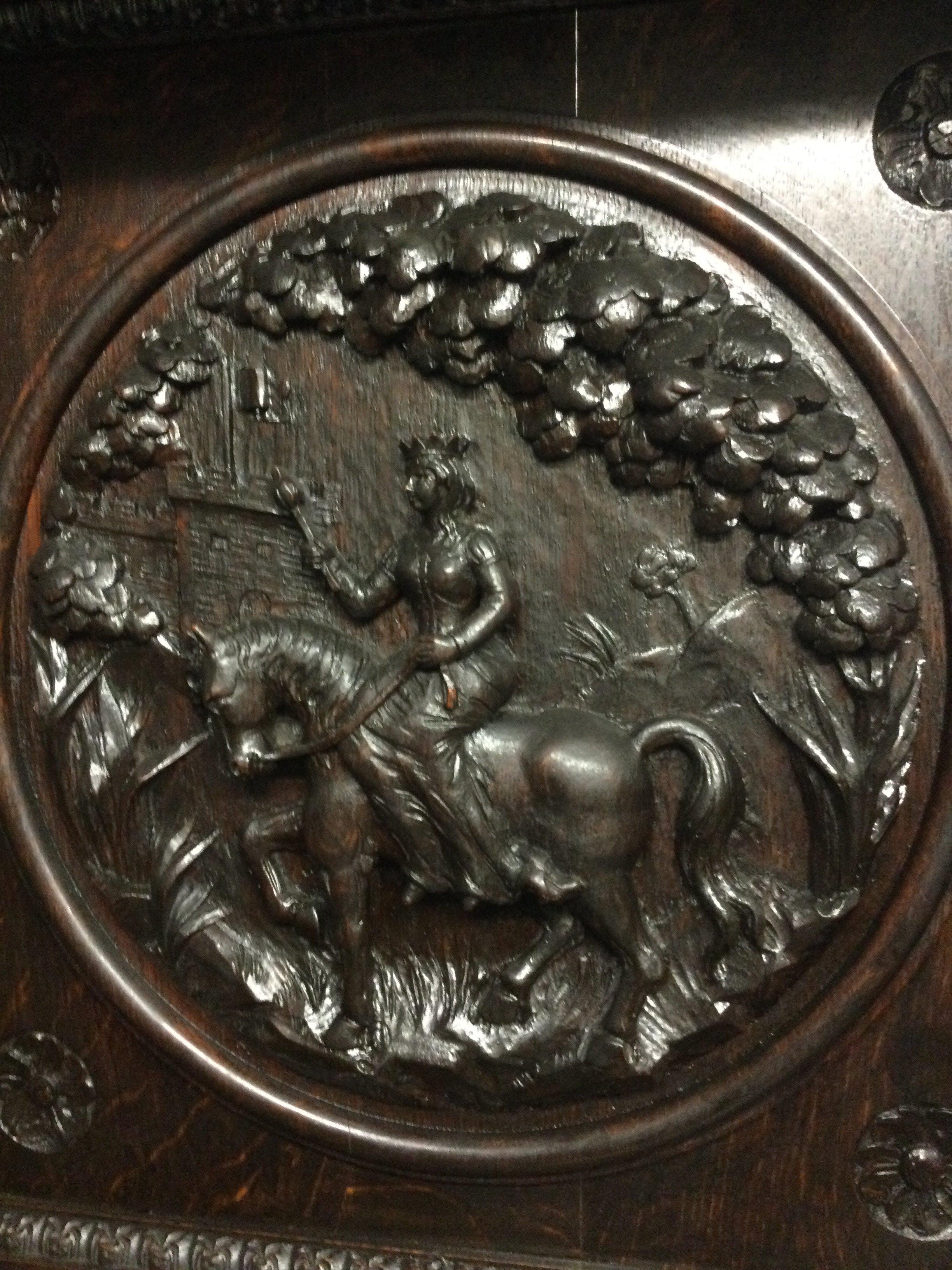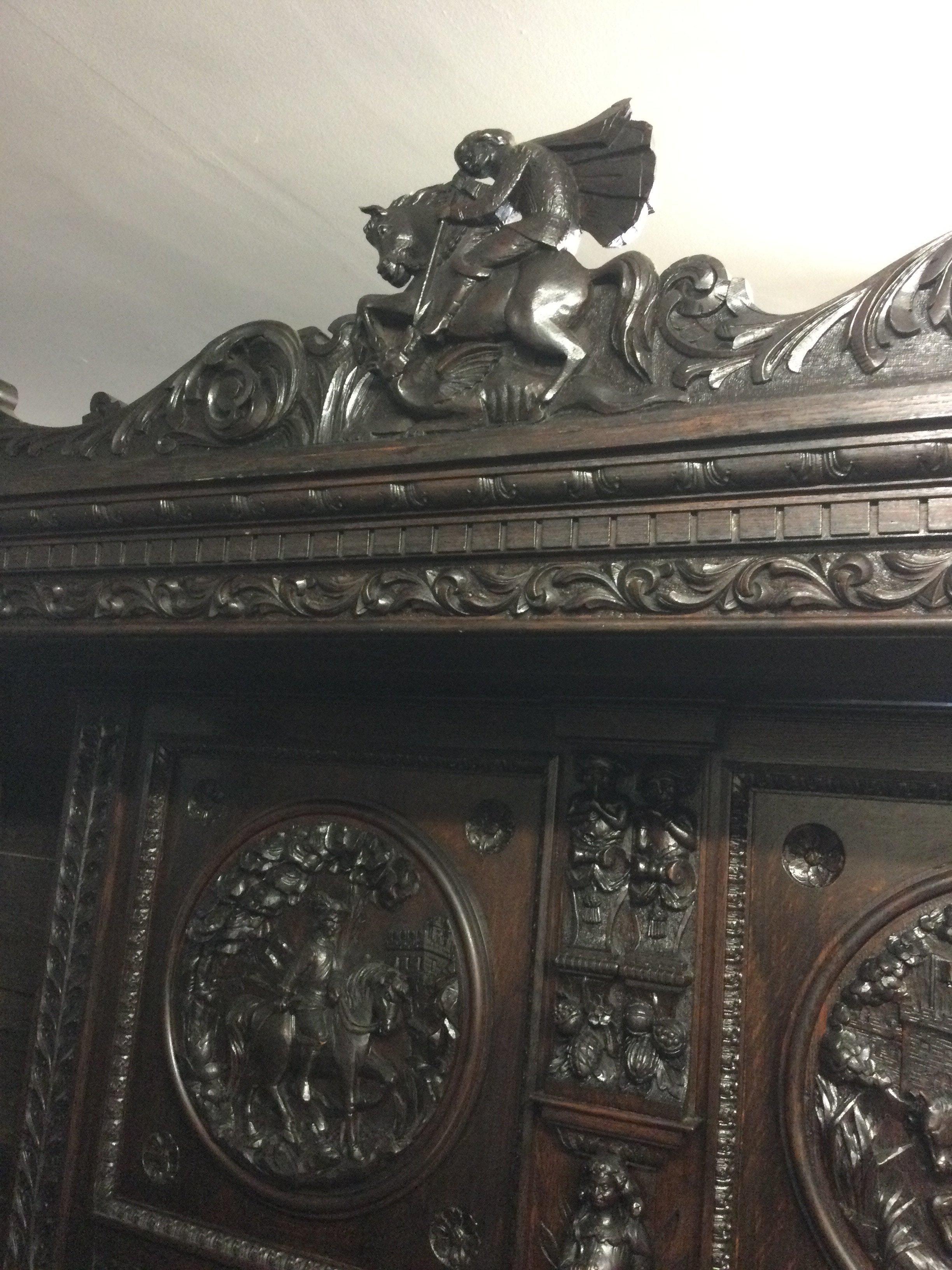 A large oak sideboard profusely carved with figures horses flower heads And foliage the raised back above two drawers and cupboards under on claw feet .245 cm x 180 cm .
