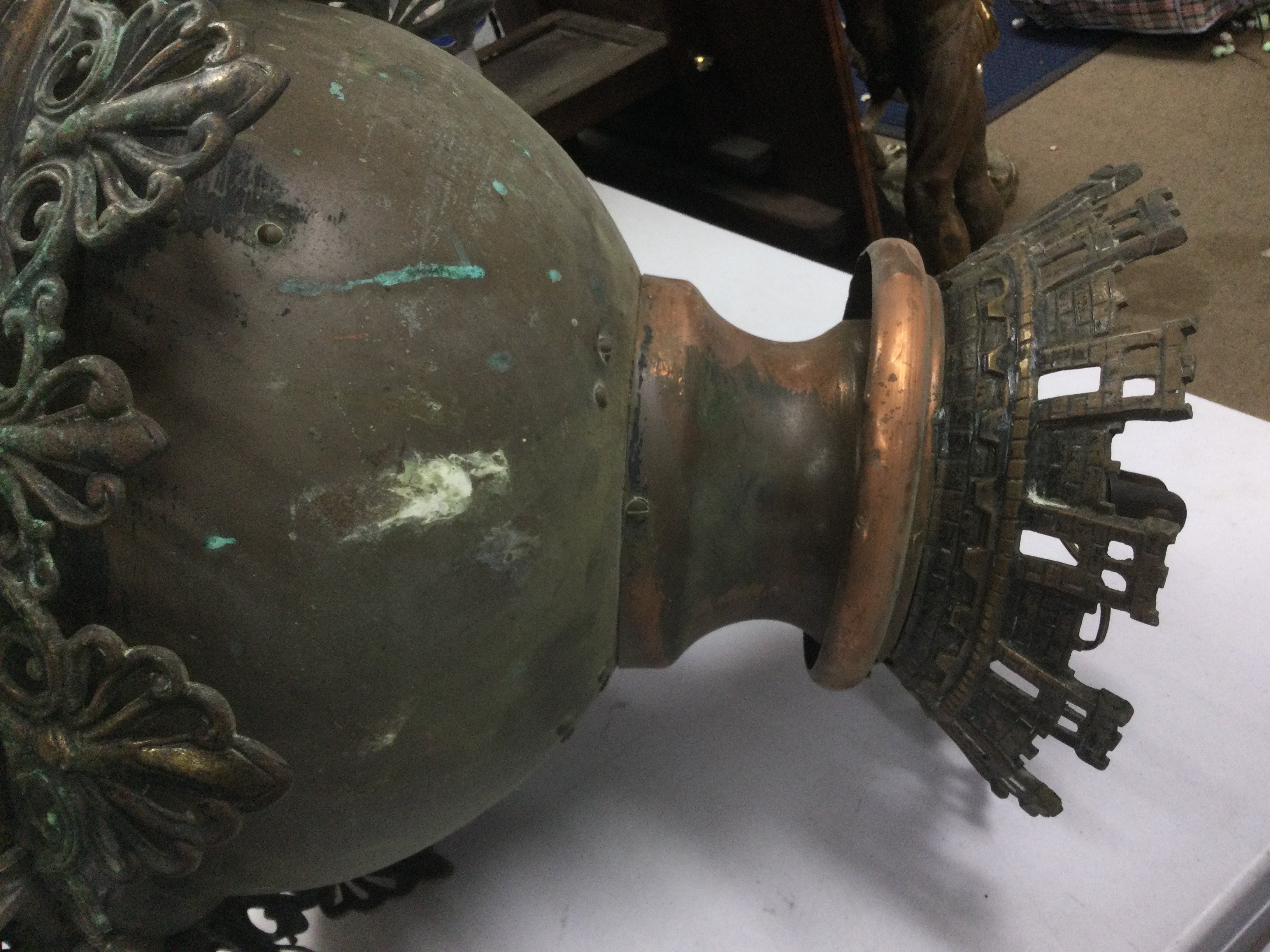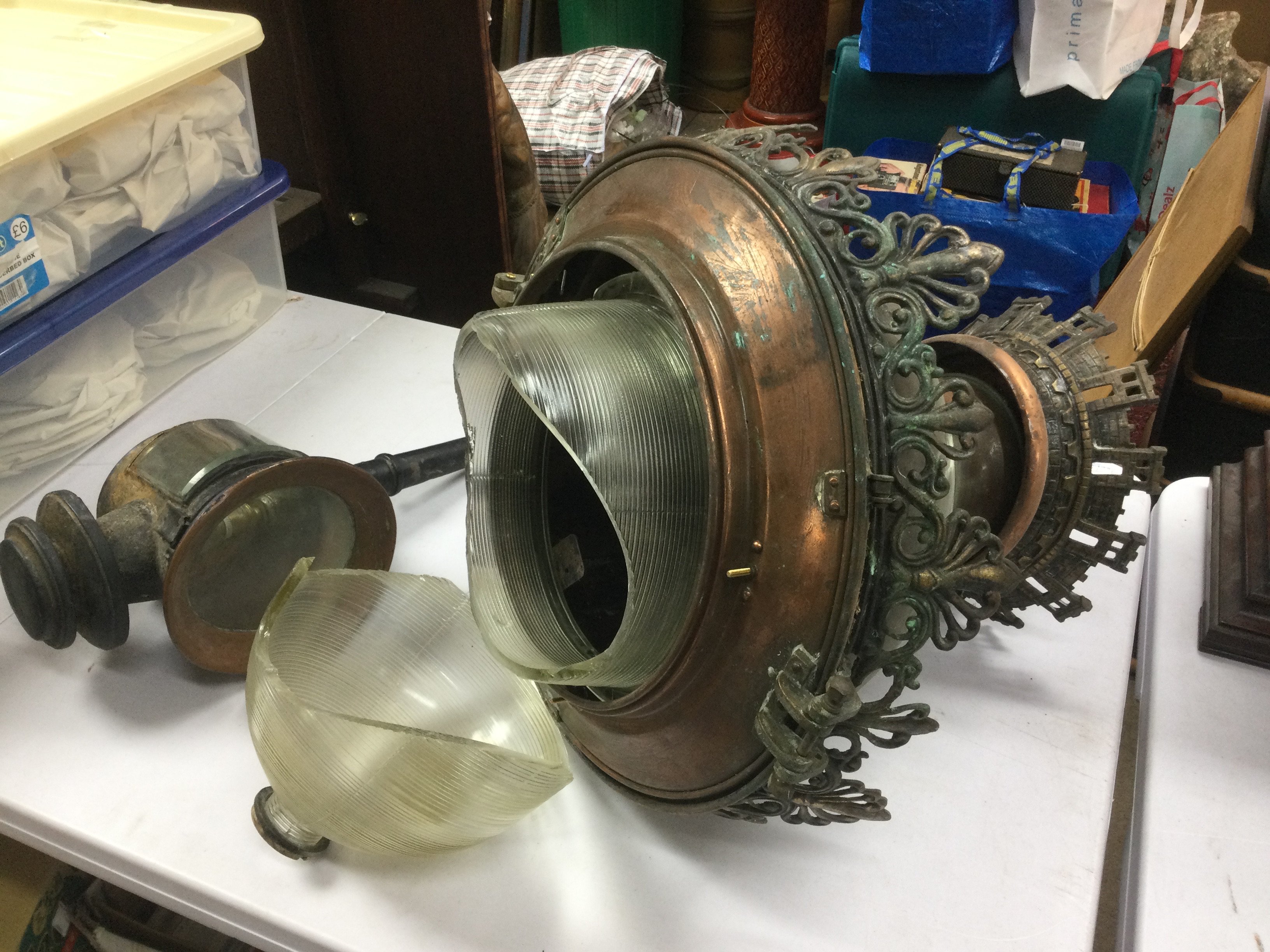 An early 20th Century French copper and brass street lamp fitting glass a/f, together with a converted coaching lamp (2). Shipping category D.