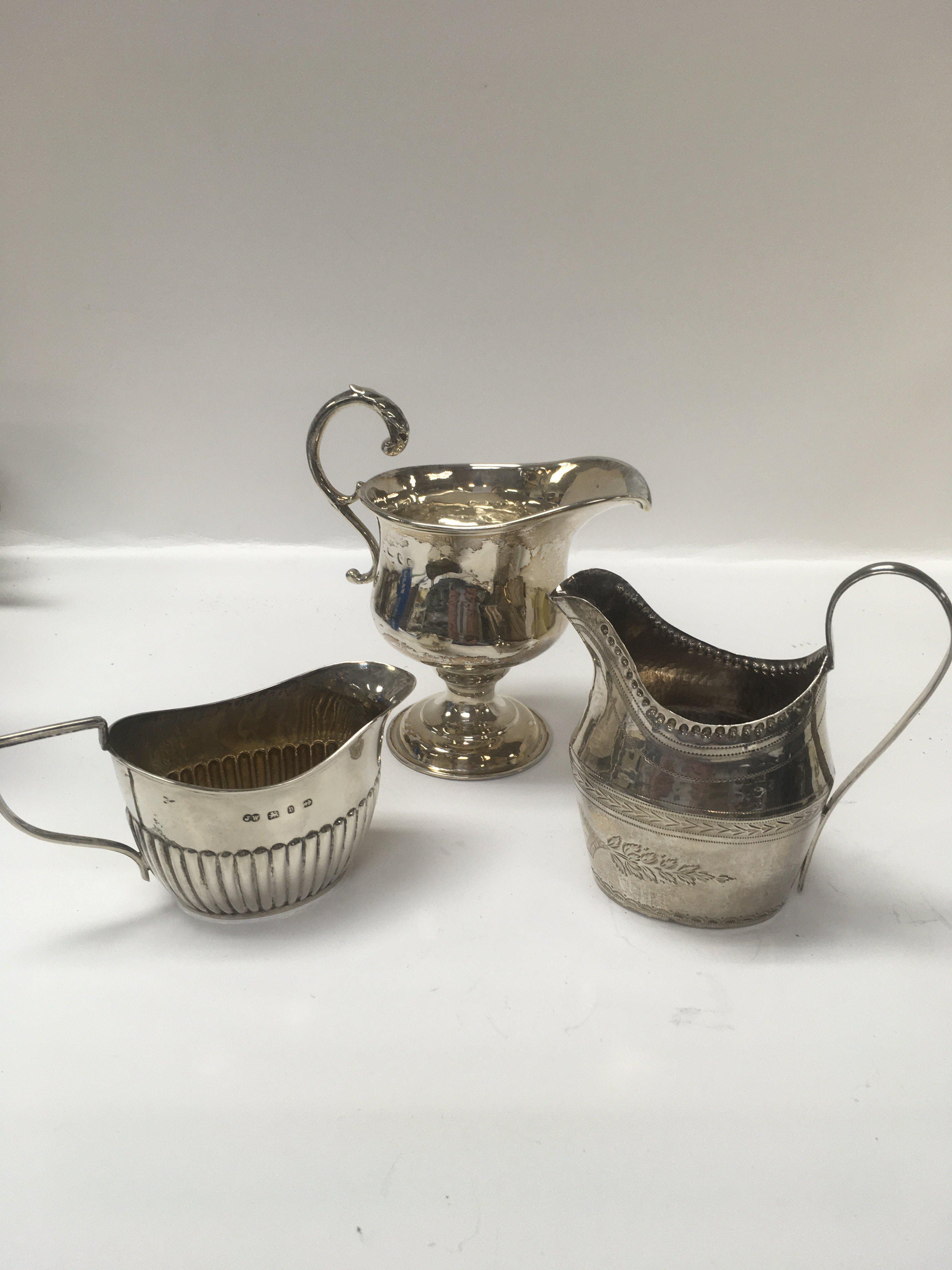 Three silver jugs, two George III jugs and one Victorian cream jug. Approx weight 303 grams.