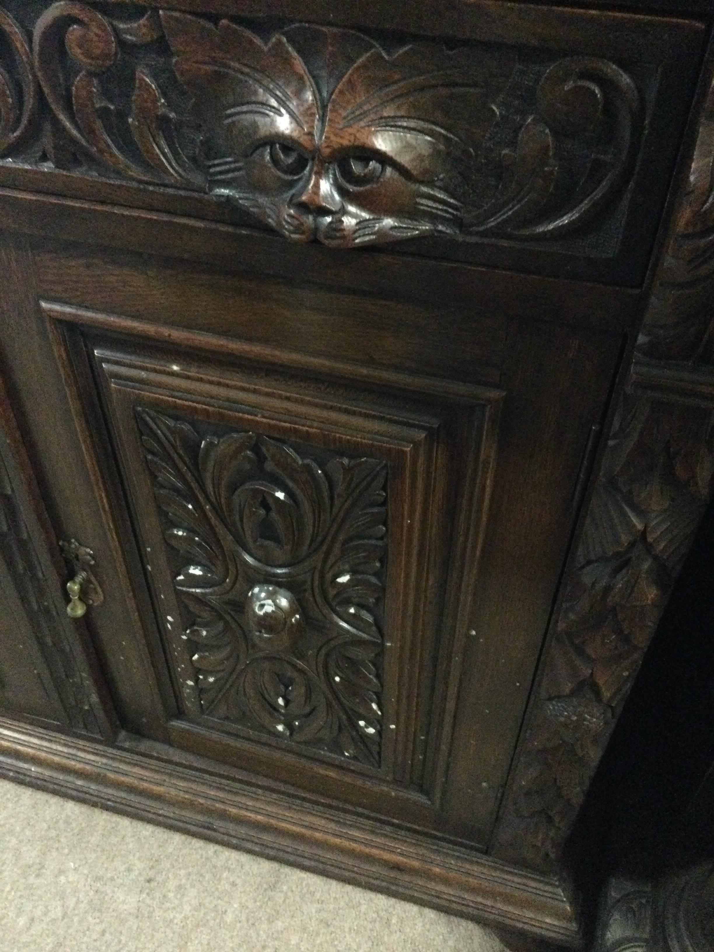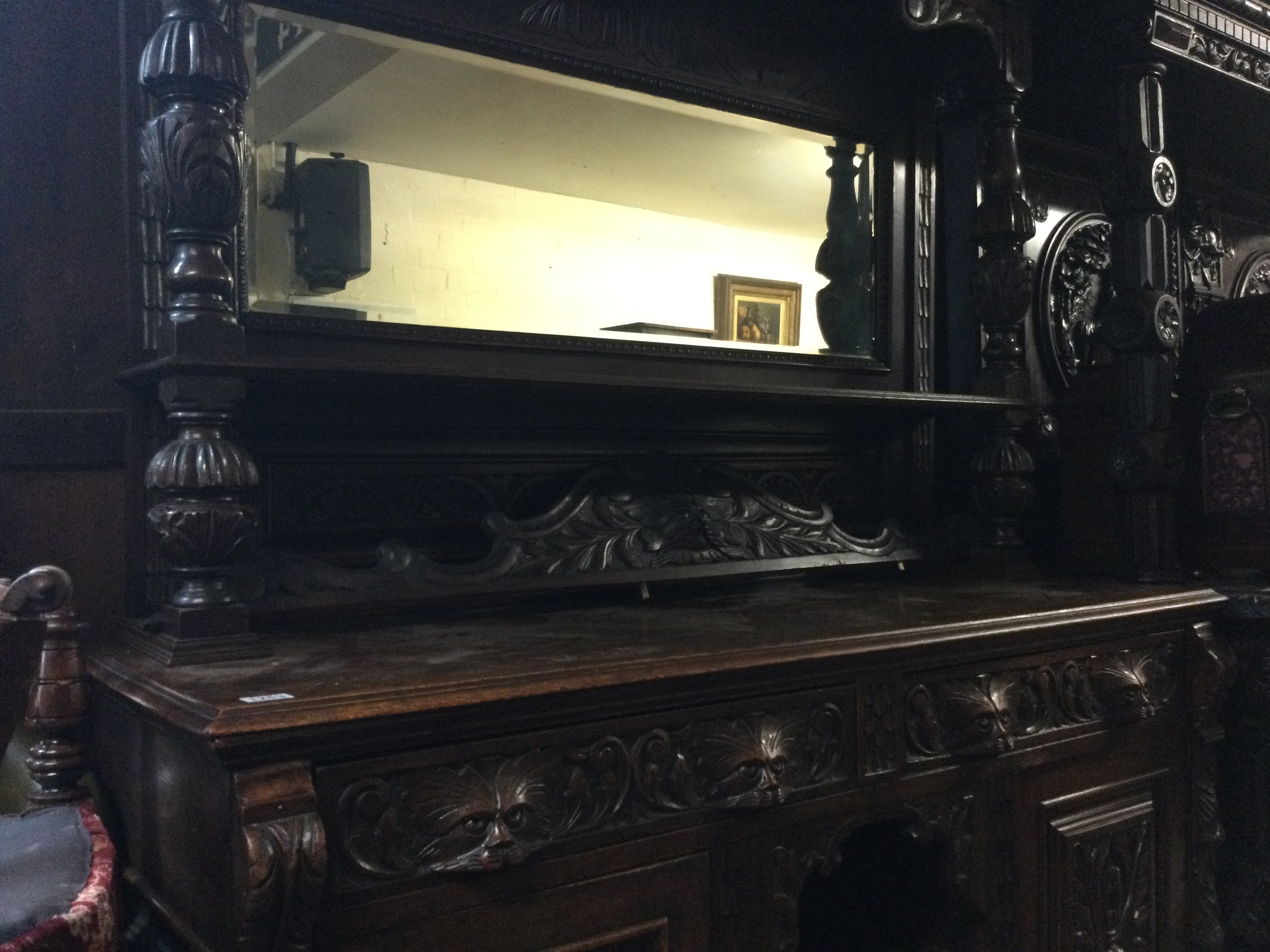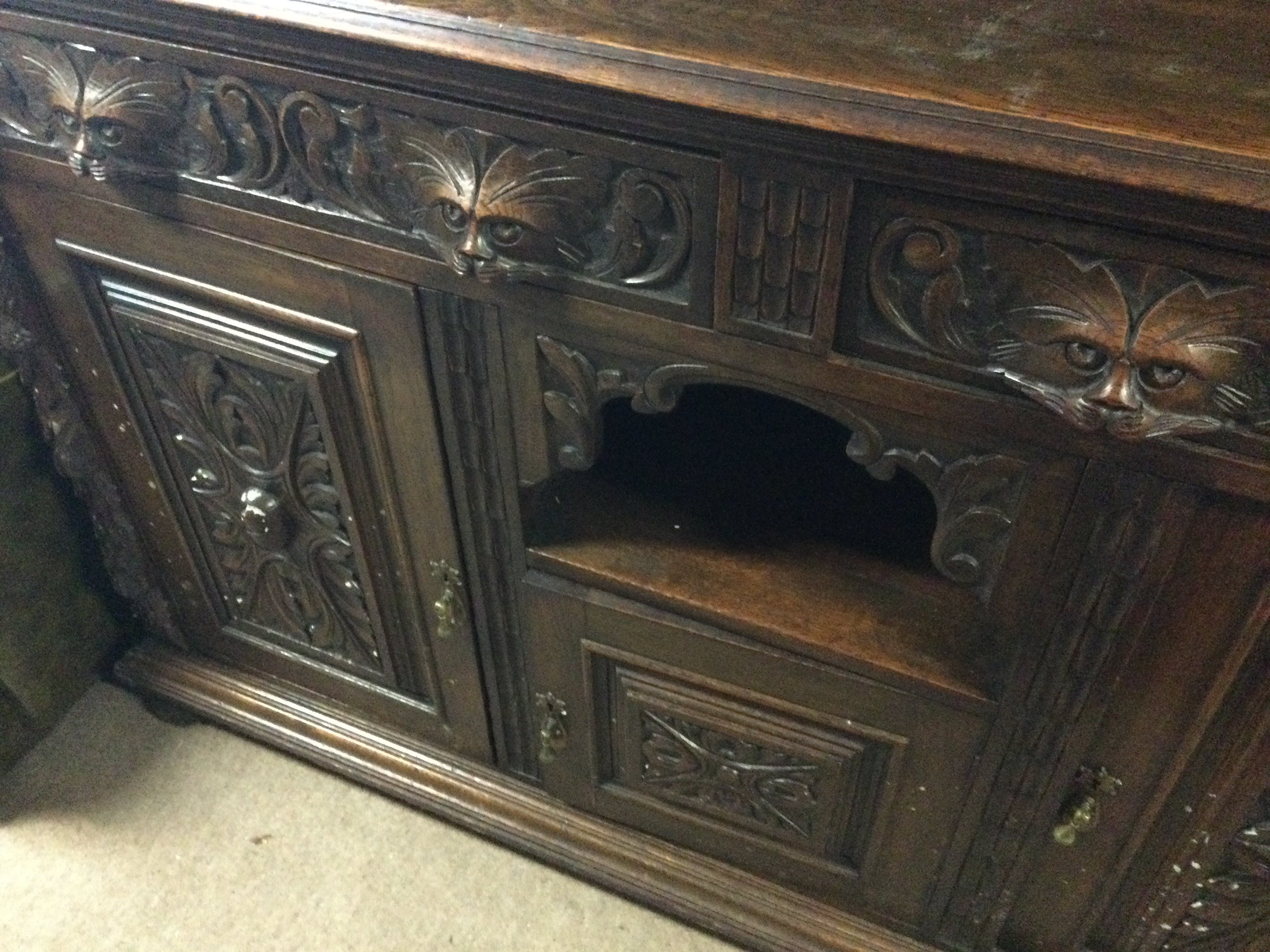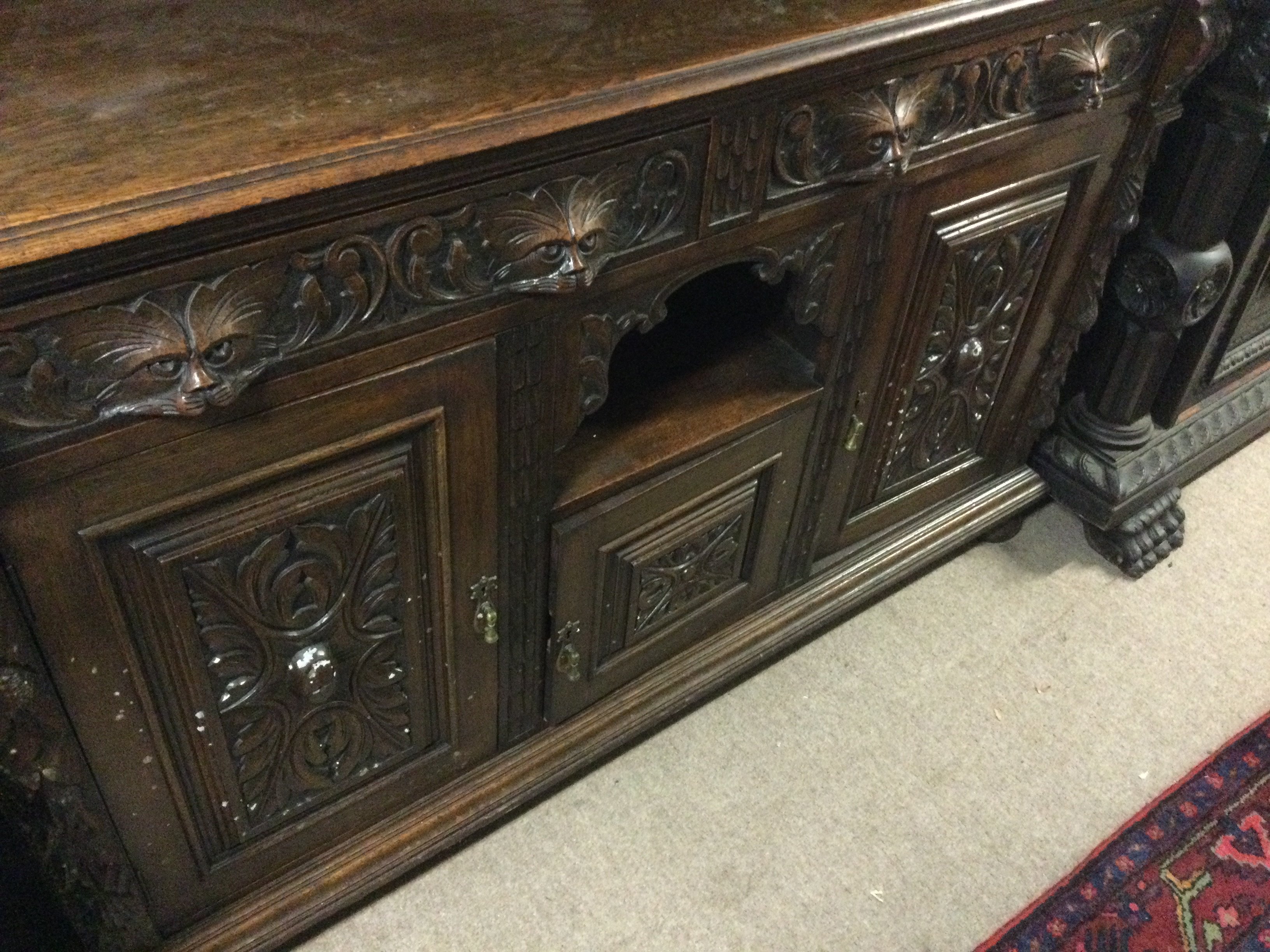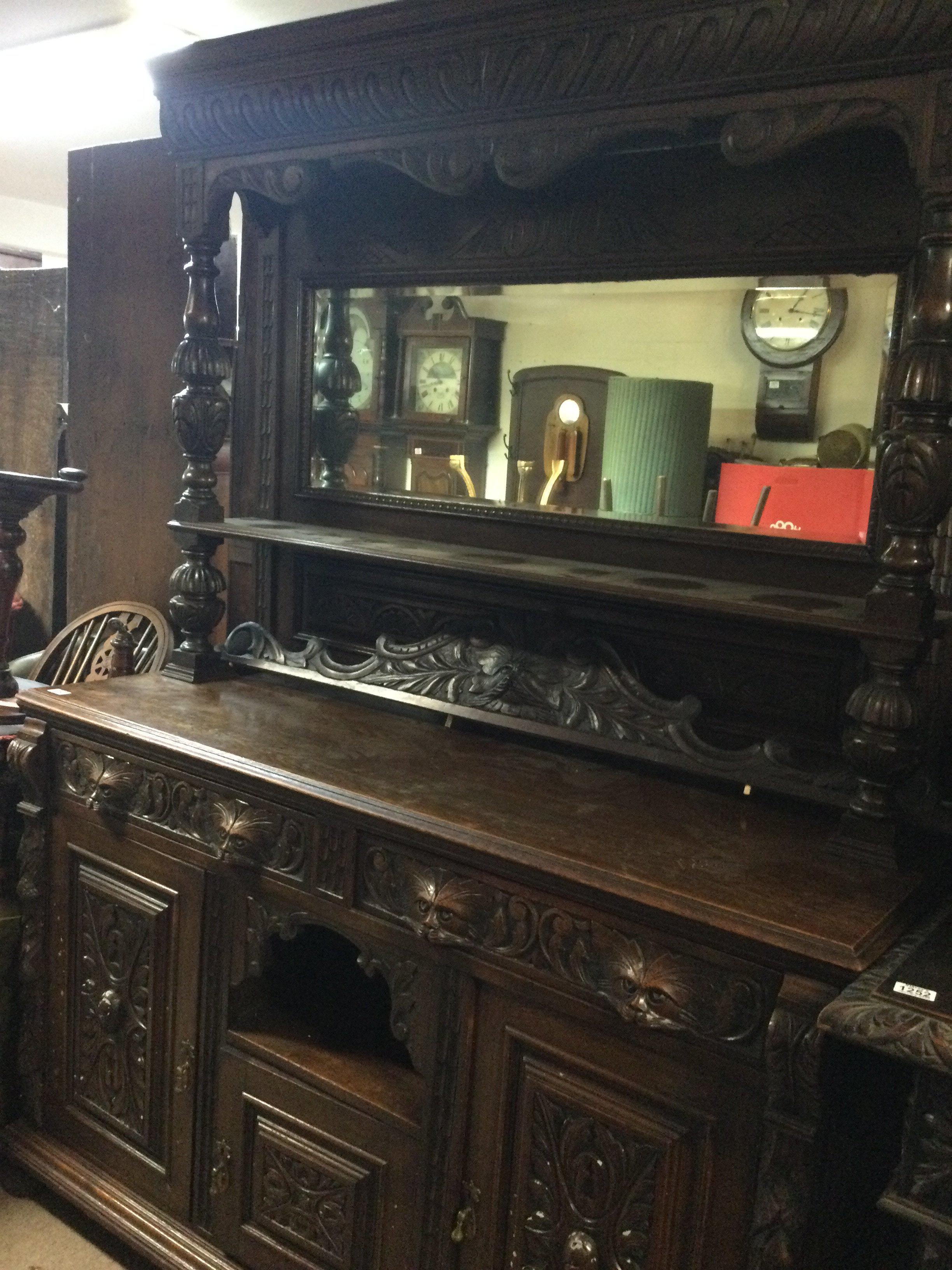 A oak mirror back sideboard the raised back above two drawers and cupboards under on ball shaped feet . 220 cm x 150 cm .
