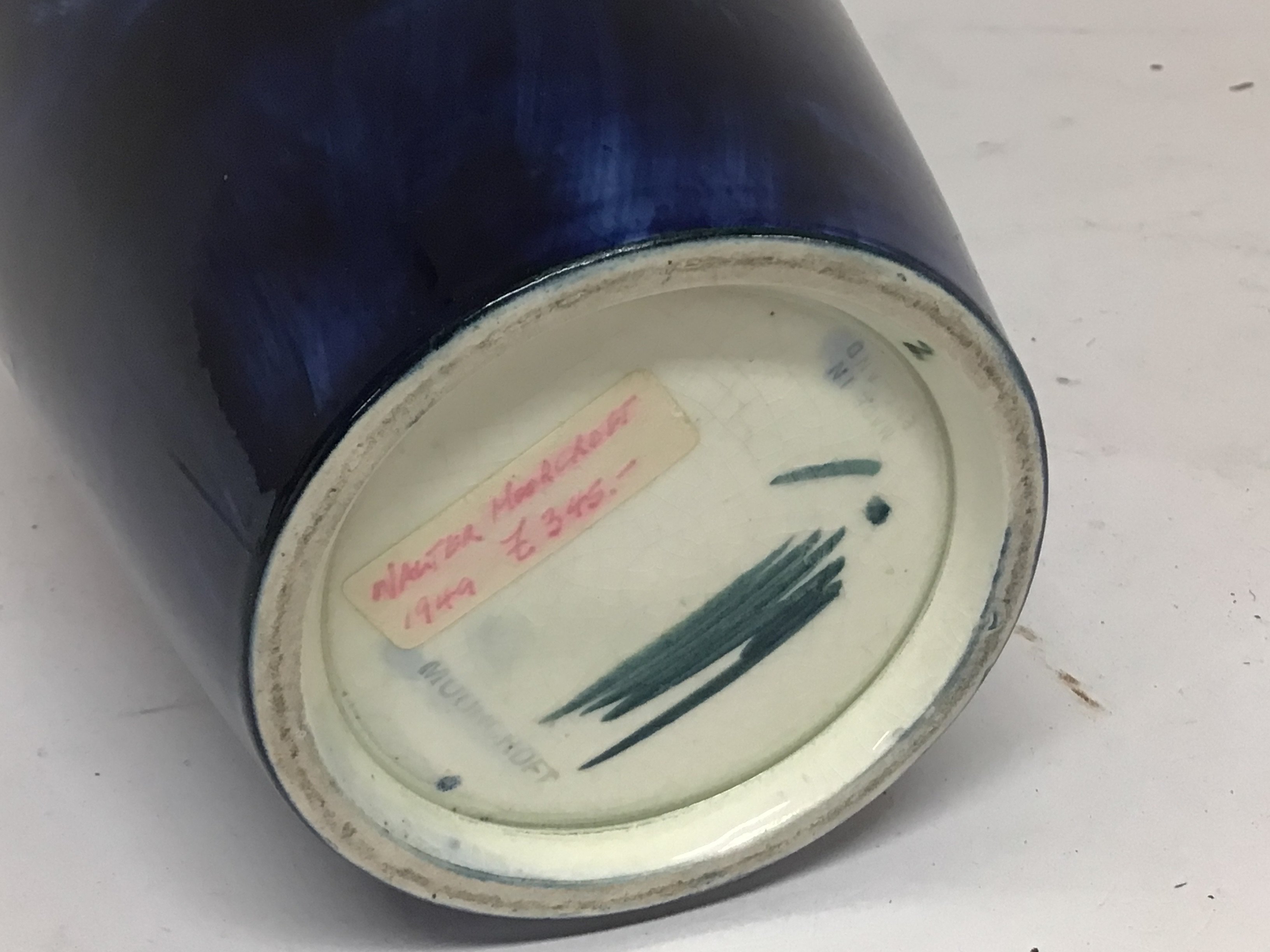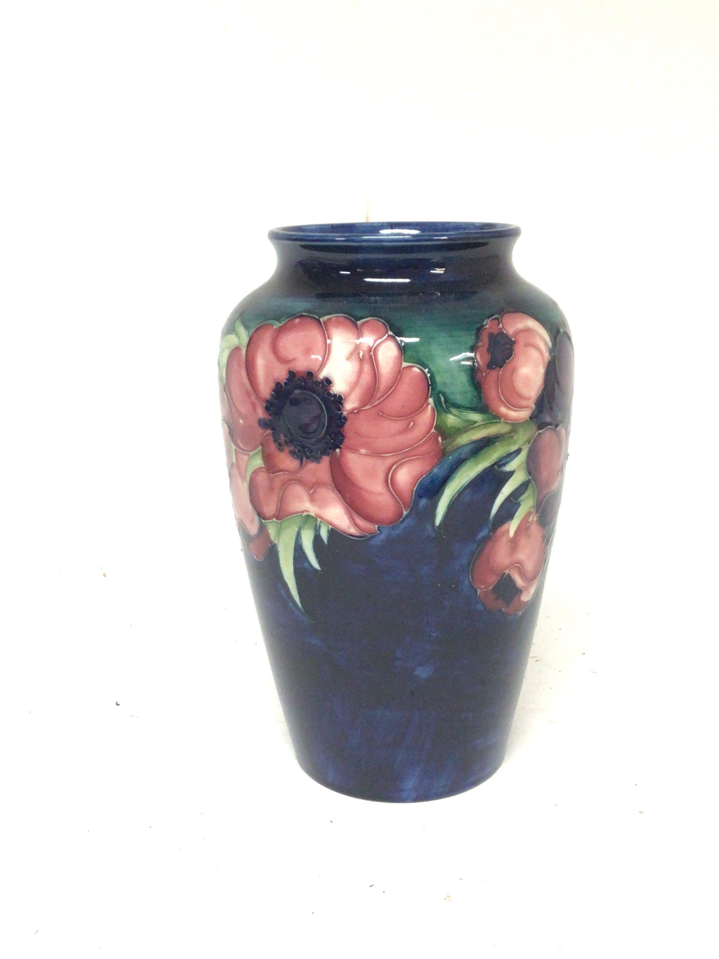 A Moorcroft vase with floral Anemone pattern on a deep blue ground signed base by Walter Moorcroft circa 1949 no obvious damage. Height 22cm.