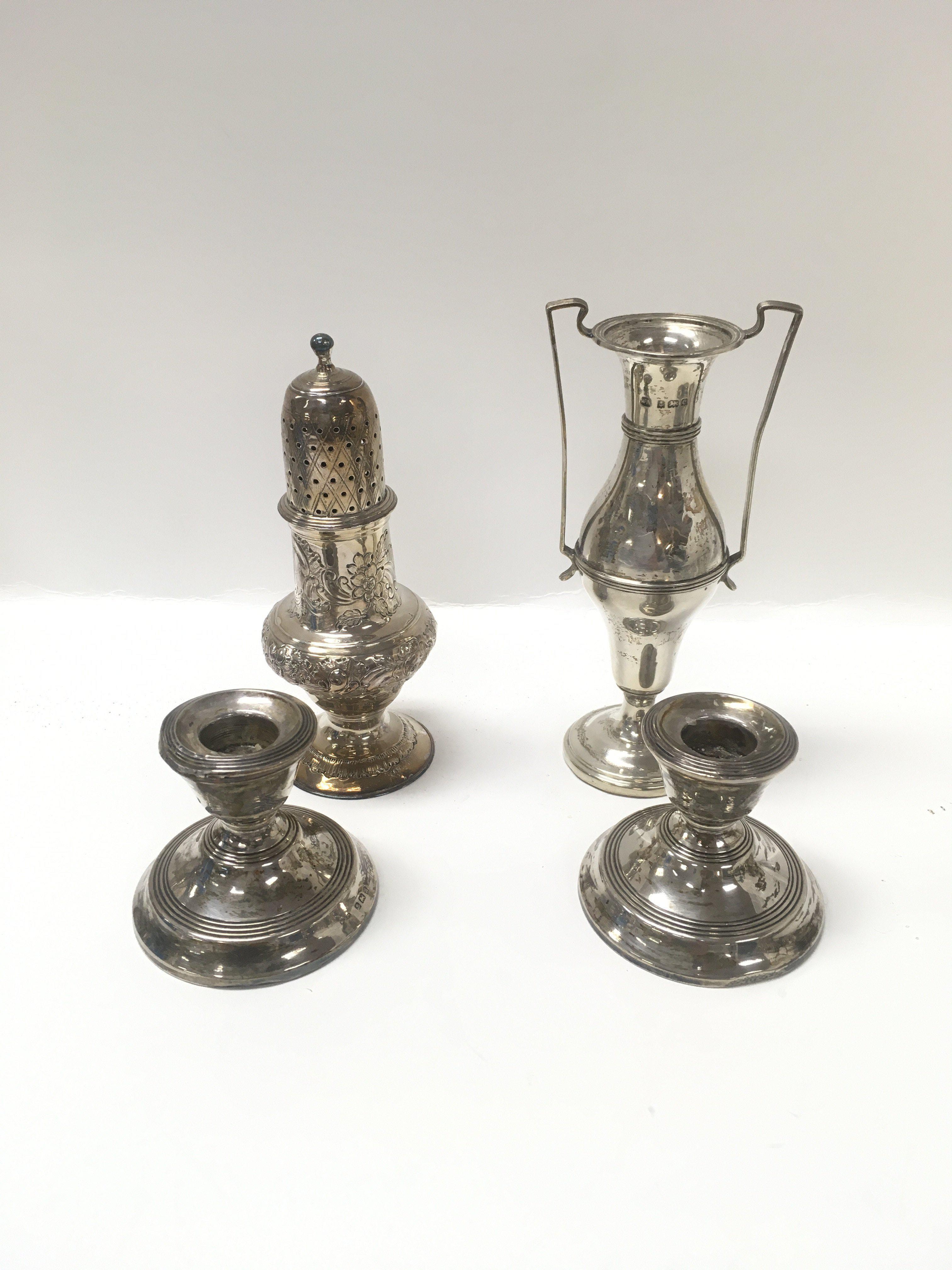 A small collection of silver items including a George III sterling silver caster by Thomas shepherd, an Edwardian silver vase and a pair of George V silver candle sticks.