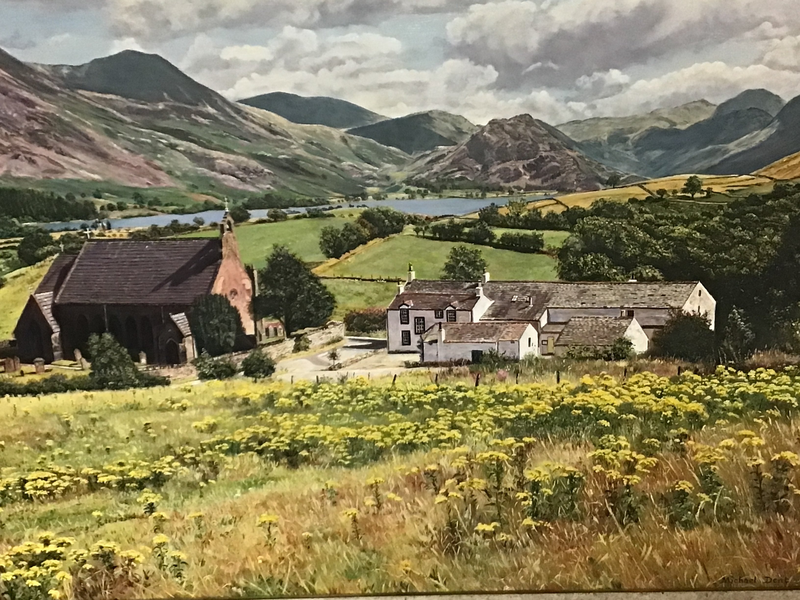 An oil painting on board 20th century rural view with a church and mountains The Lake District signed Michael Dent. 58x53cm