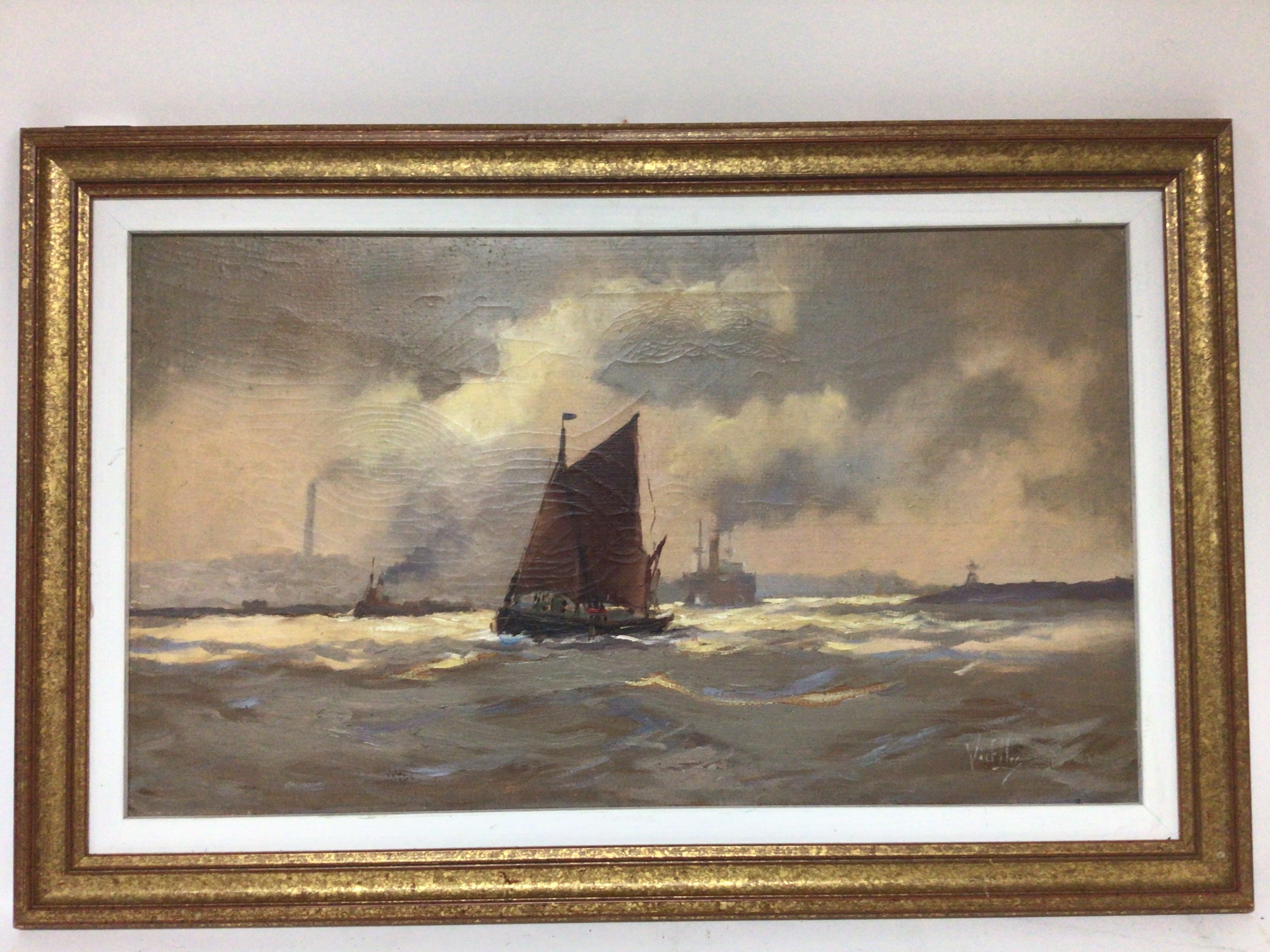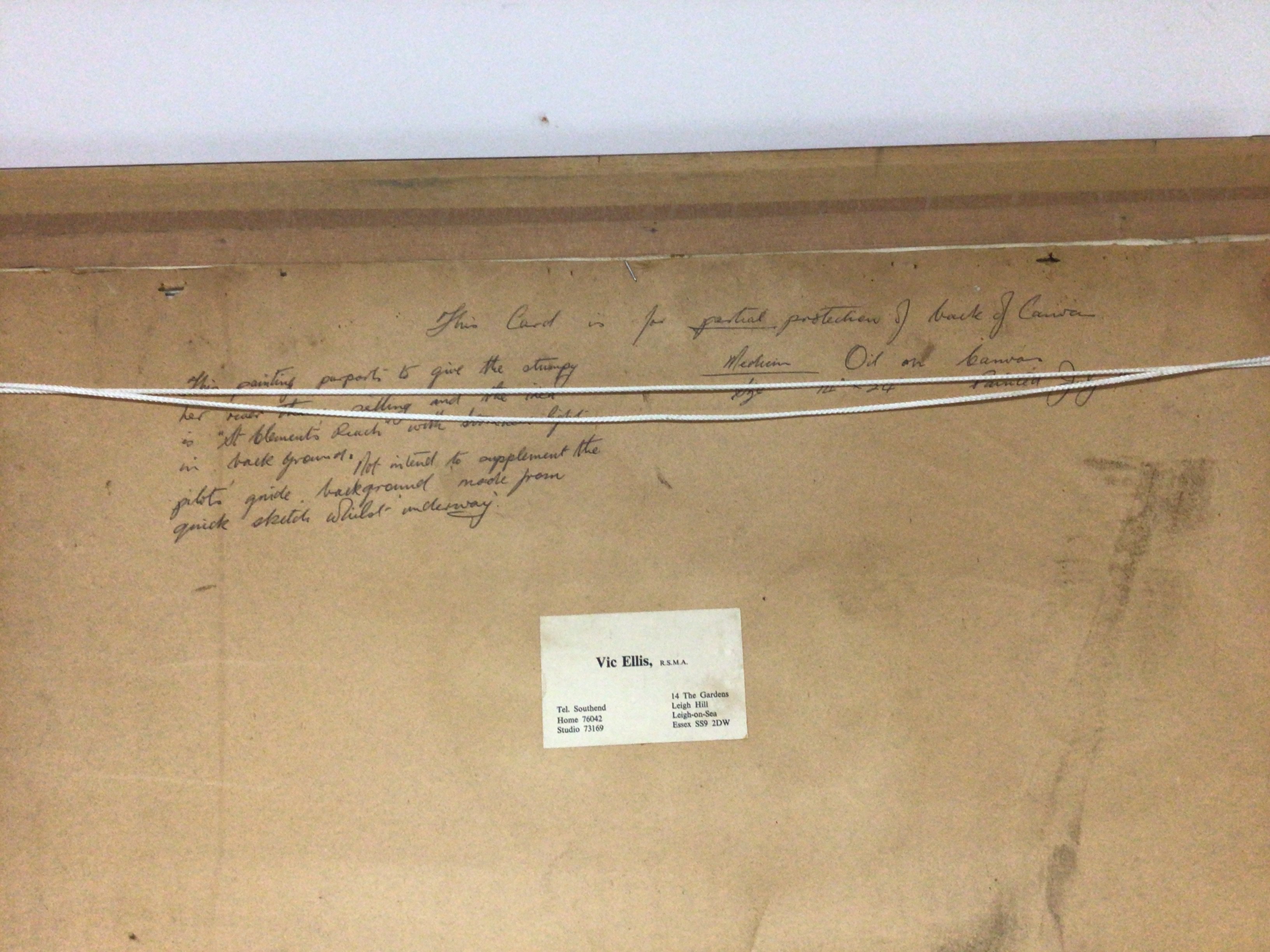 A framed oil painting on canvas study of a Thames Barge by Vic Ellis the reverse with a hand written inscription. 72x47cm