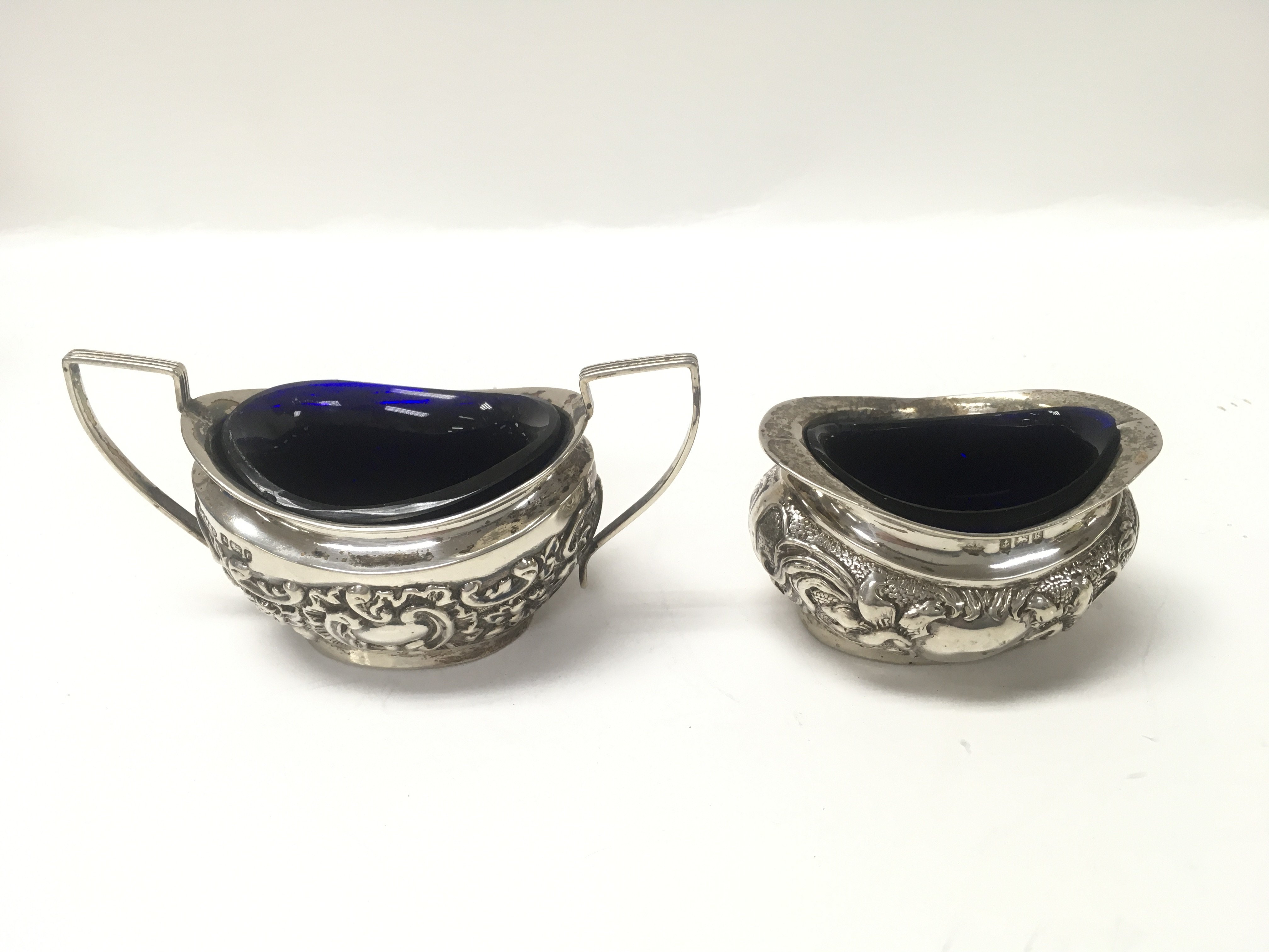 Two sterling silver salt dishes with blue glass liners. Approx weight without liners 59.17 grams.