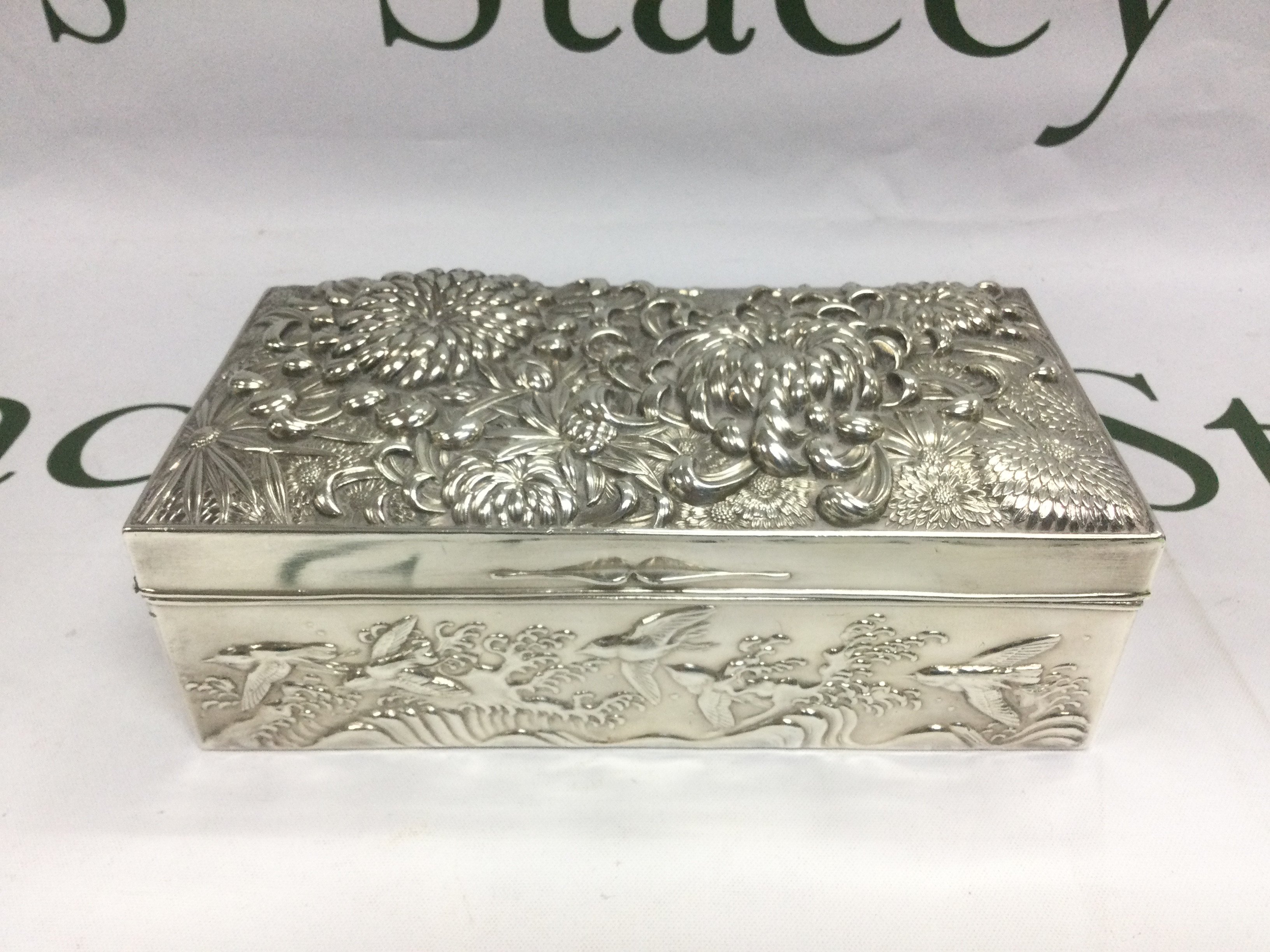A heavy Oriental white metal trinket box, heavily embossed, slight damage to hinge, approx 900g. Shipping category B.