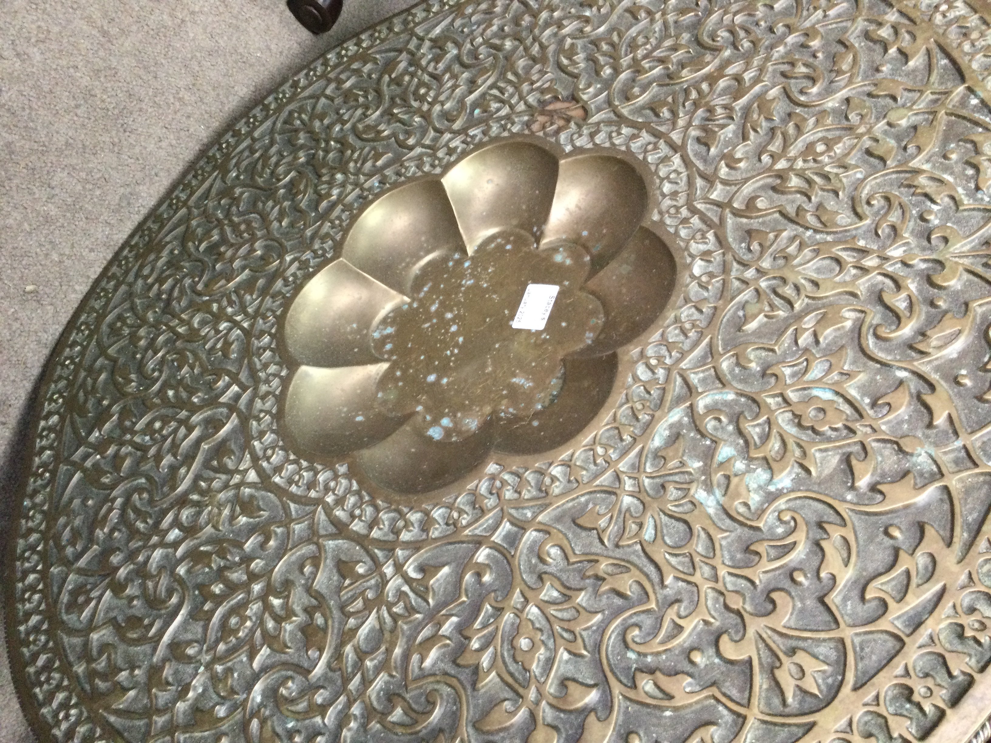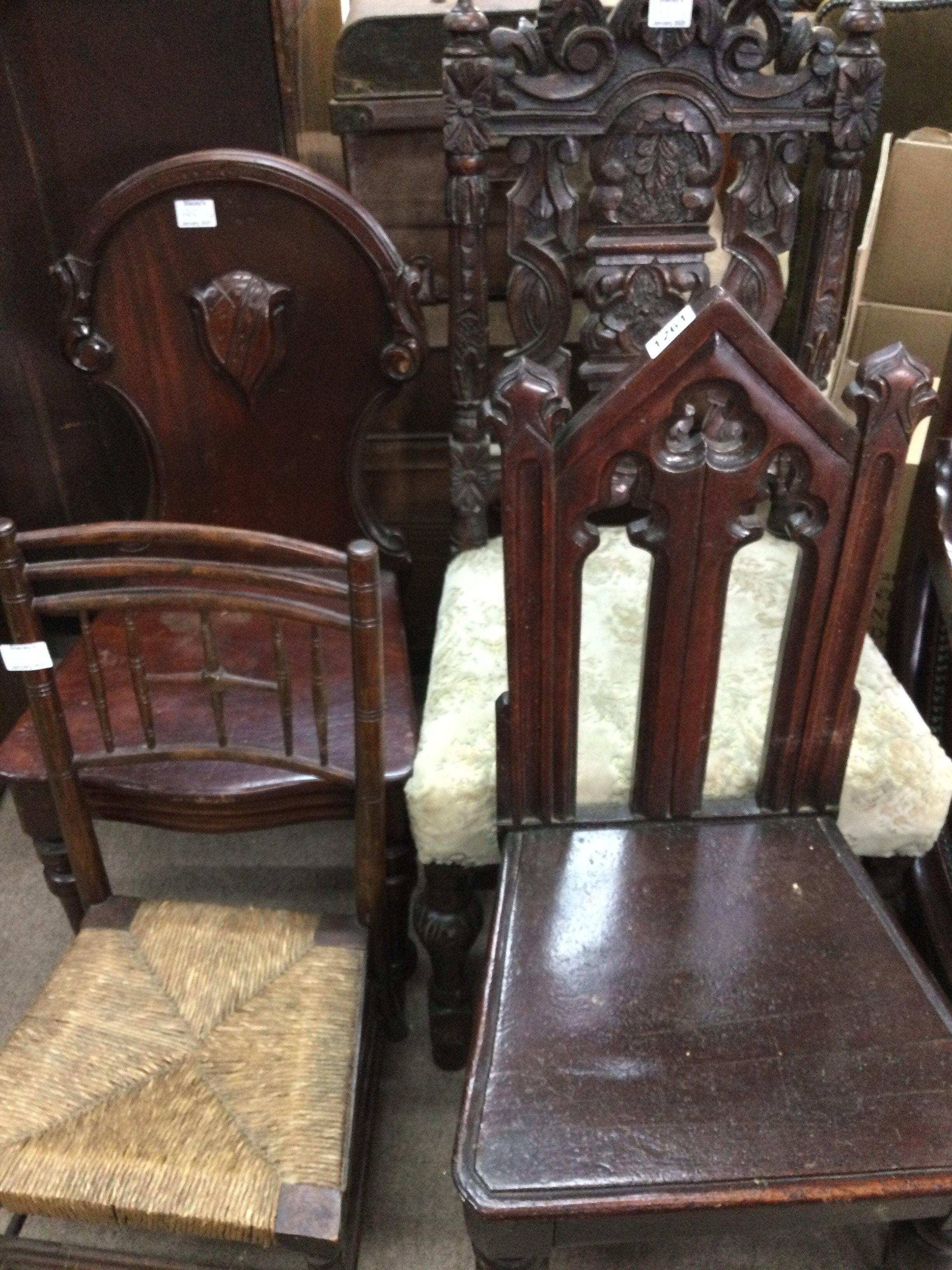 A collection of furniture including four chairs including two hall chairs and a folding table with brass tray top .