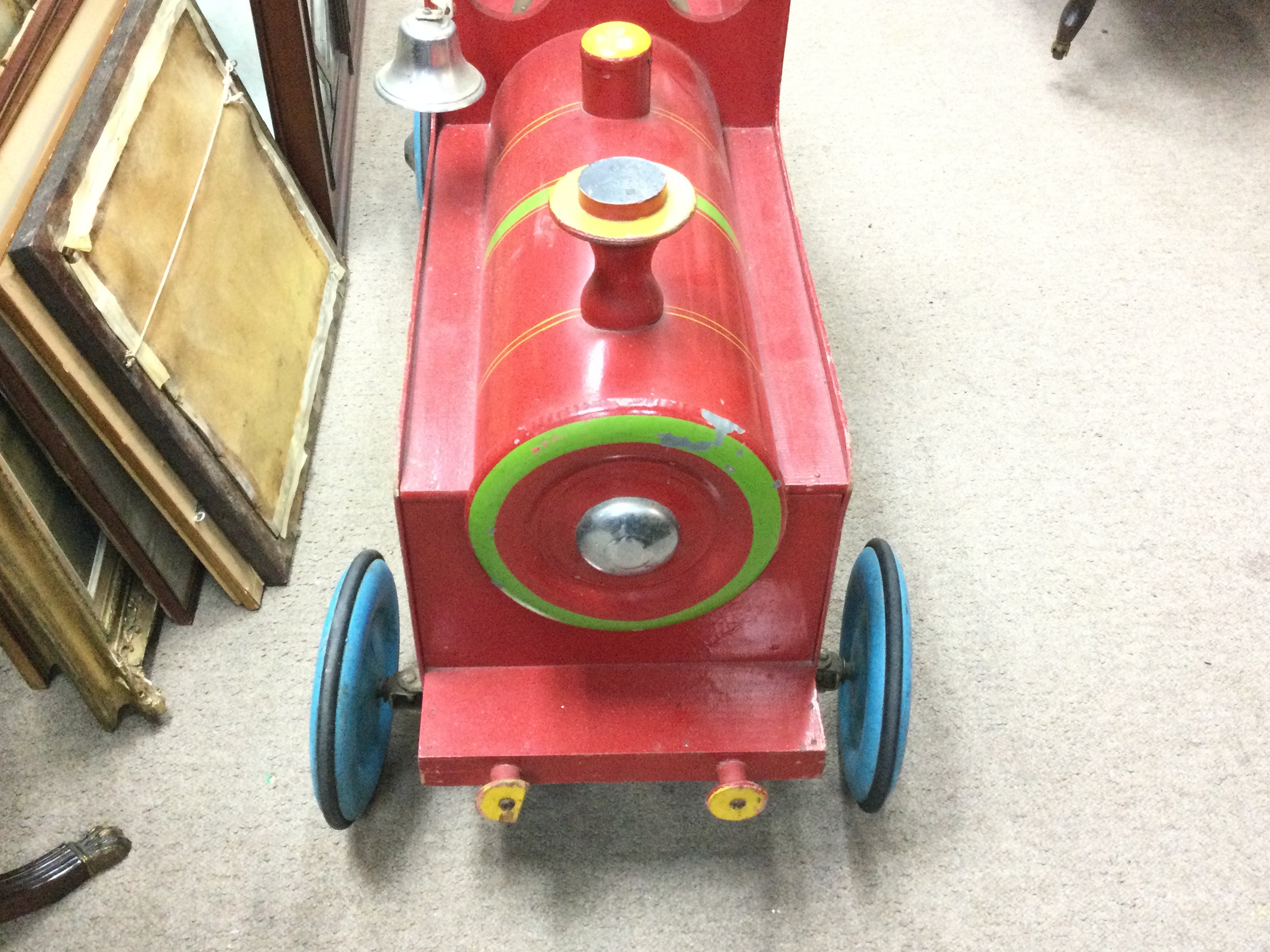 A child’s peddle train leeway flyer painted red. 107cm long 46cm wide.