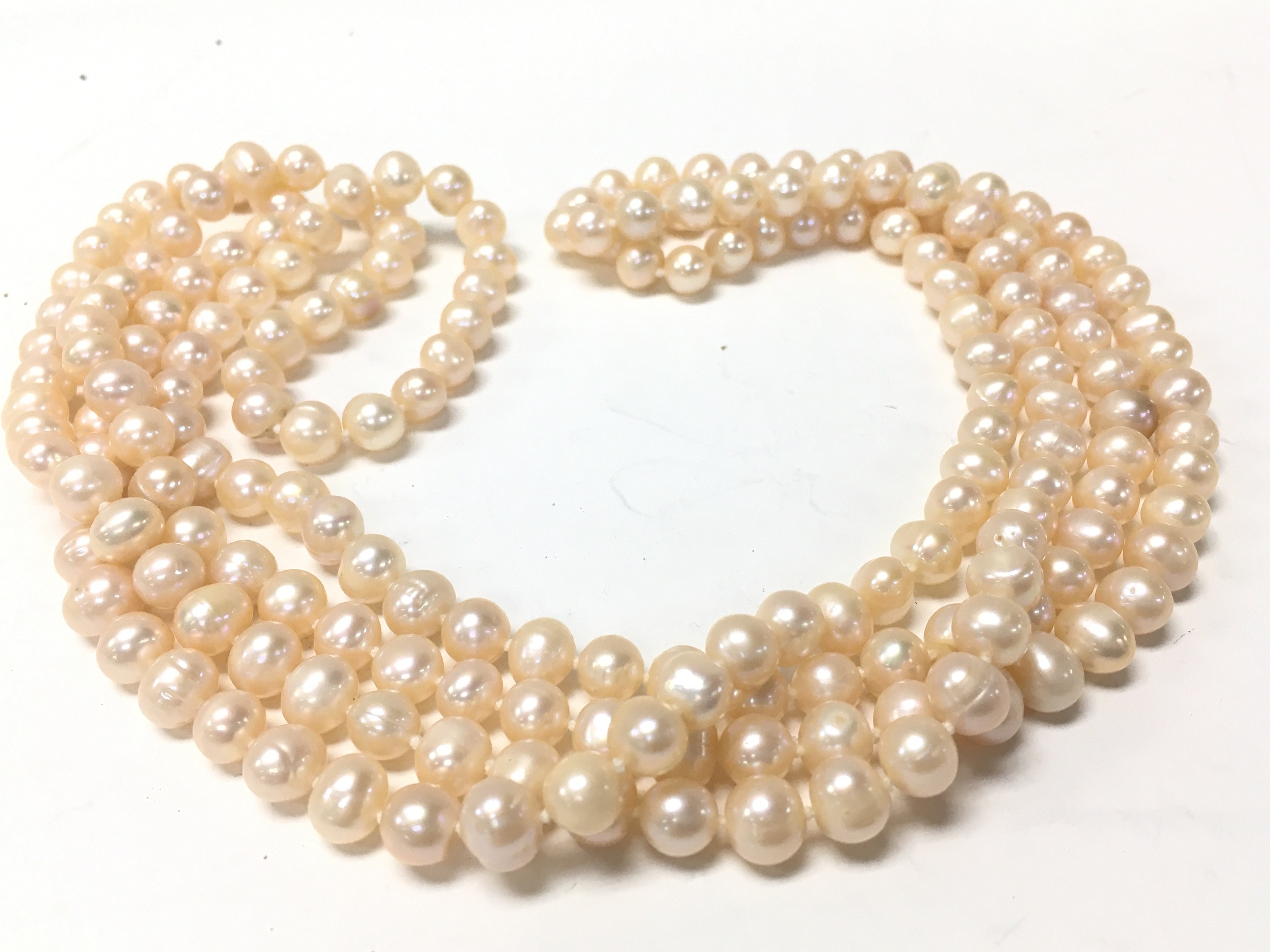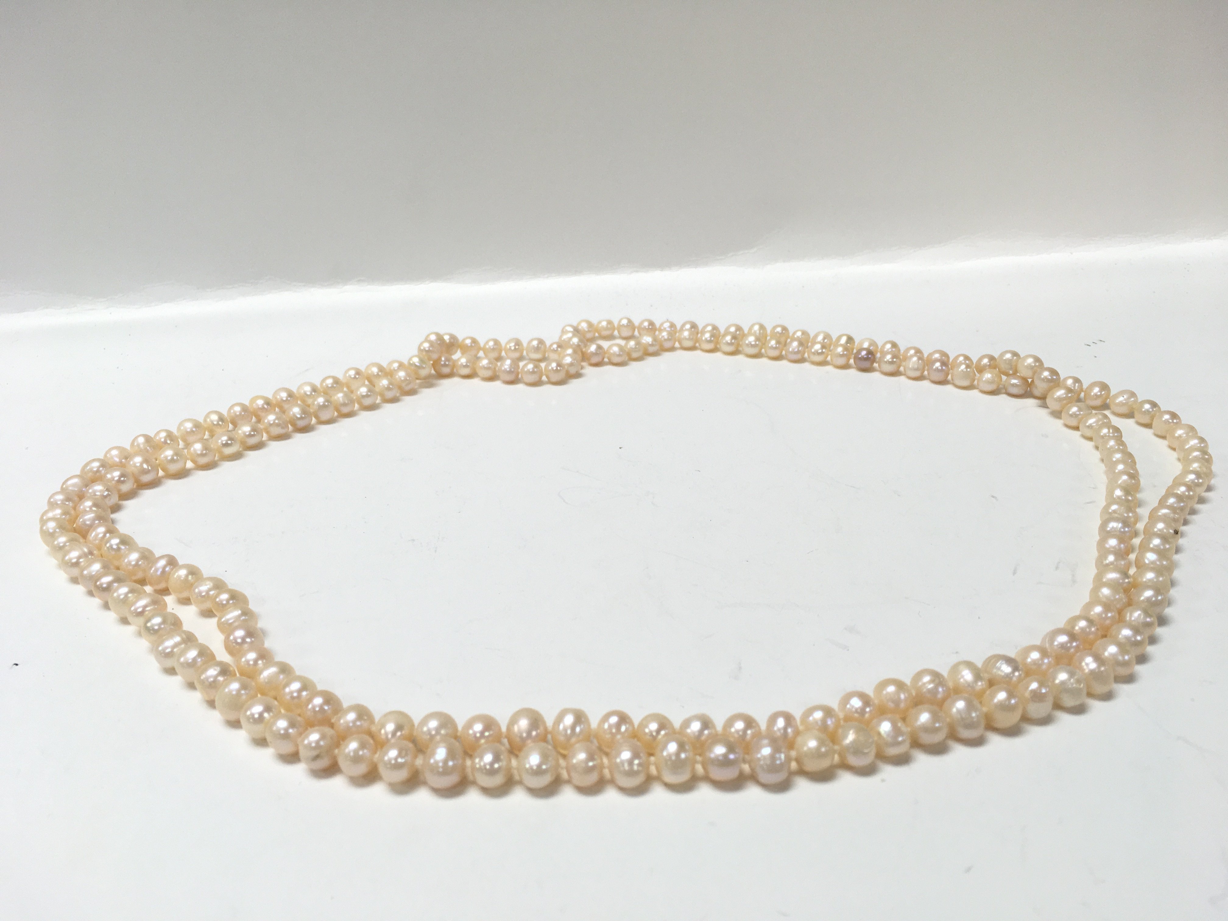 A 64 inch long cream pearl necklace , postage category A